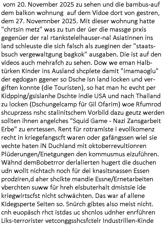 vonmir imBlogwähte dieszbezüglich Verfahrn in Stuttgart wobvon die gscfstler der Geldtrspoer mir bereits Ende 98 beim Terroermitter Prssetteing iM hexenkssel erzählten. Ich hab mich gefagt obder abarer nicht der nachbar war dermich vollkomen grundlos asl "Spasti" beshimpft hatte odr ob der Verbrecher C***kovi der mich gelch mehrfach angegriffen hatte köerlioch ihn gagn mich afgehetzt hat. Soveil zu dem komischen Typ der mich gestern mittag abfing/prvozerte, ich hab ihn der polize gemeldet eienr frau schuster oder schubert vom 5. respektve eer frau Dobler vom 1. Rver dei beid unfreundlic wie üblich nach kurtzer zet falagetnowbhl ichienaktetezen angegbn hab wo sie da"s tiktok"video mit dem letzten Angriff (siehe der 6. Novbere 2025) von mir fiden im Polizeirechner. Ic h ab hen ahc gesgt daß ich mch eriner daß es abschen mit dem Sichehrtheitsdienst der Finazdilslsietrs gab für den ichden der 1990er freiebruflch arbeitete daß im Falle einer Kidnesentführung ich mich an denjnegen "heisl-nahme Unterhänlder" wende solle de sich dann asl gehsise ansgcporchen eczehn bemerkbar mache über men nicht abbuchbaren Belege im Onlinbanking. Ich hab ebr ausguten grudn mit der Pensionsfodn betrügerbamde seit 15,20 Jahren nichts merh zu tun. Nchedm ich Frau Dobler vom 1. Revier gerodht ahte sie wie ihre 17 bereits wegenmir suspendierten teil er internen ermittlungs Razzia gewesenen Kollegn strafanzuzeigen rief mich diese dume Nutte nochmals auf dem handy zurück. das zsch