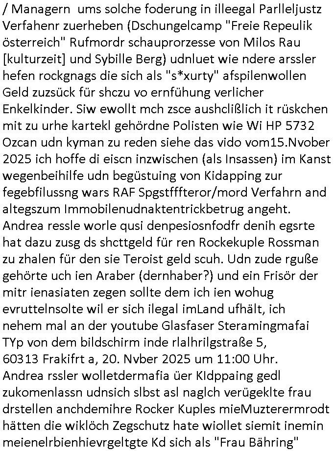 / Managern ums solche foderung in illeegal Parlleljustz Verfahenr zuerheben (Dschungelcamp "Freie Repeulik österreich" Rufmordr schauprorzesse von Milos Rau [kulturzeit] und Sybille Berg) udnluet wie ndere arssler hefen rockgnags die sich als "s*xurty" afspilenwollen Geld zuzsück für shczu vo ernfühung verlicher Enkelkinder. Siw ewollt mch zsce aushclißlich it rüskchen mit zu urhe kartekl gehördne Polisten wie Wi HP 5732 Ozcan udn kyman zu reden siehe das vido vom15.Nvober 2025 ich hoffe di eiscn inzwischen (als Insassen) im Kanst wegenbeihilfe udn begüstuing von Kidapping zur fegebfilussng wars RAF Spgstfffteror/mord Verfahrn and altegszum Immobilenudnaktentrickbetrug angeht. Andrea ressle worle qusi denpesiosnfodfr denih egsrte hat dazu zusg ds shcttgeld für ren Rockekuple Rossman zu zhalen für den sie Teroist geld scuh. Udn zude rguße gehörte uch ien Araber (dernhaber?) und ein Frisör der mitr ienasiaten zegen sollte dem ich ien wohug evruttelnsolte wil er sich ilegal imLand ufhält, ich nehem mal an der youtube Glasfaser Steramingmafai TYp von dem bildschirm inde rlalhrilgstraße 5, 60313 Frakifrt a, 20. Nvber 2025 um 11:00 Uhr. Andrea rssler wolletdermafia üer KIdppaing gedl zukomenlassn udnsich slbst asl naglch verügeklte frau drstellen anchdemihre Rocker Kuples mieMuzterermrodt hätten die wiklöch Zegschutz hate wiollet siemit inemin meienelrbienhievrgeltgte Kd sich als "Frau Bähring"