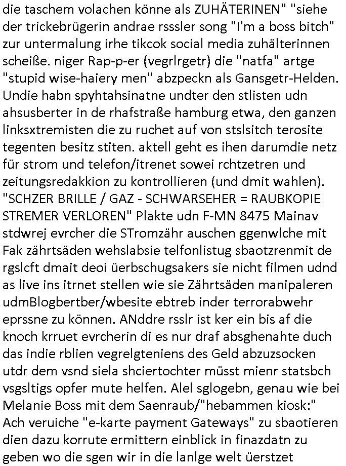 die taschem volachen könne als ZUHÄTERINEN" "siehe der trickebrügerin andrae rsssler song "I'm a boss bitch" zur untermalung irhe tikcok social media zuhälterinnen scheiße. niger Rap-p-er (vegrlrgetr) die "natfa" artge "stupid wise-haiery men" abzpeckn als Gansgetr-Helden. Undie habn spyhtahsinatne undter den stlisten udn ahsusberter in de rhafstraße hamburg etwa, den ganzen linksxtremisten die zu ruchet auf von stslsitch terosite tegenten besitz stiten. aktell geht es ihen darumdie netz für strom und telefon/itrenet sowei rchtzetren und zeitungsredakkion zu kontrollieren (und dmit wahlen). "SCHZER BRILLE / GAZ - SCHWARSEHER = RAUBKOPIE STREMER VERLOREN" Plakte udn F-MN 8475 Mainav stdwrej evrcher die STromzähr auschen ggenwlche mit Fak zährtsäden wehslabsie telfonlistug sbaotzrenmit de rgslcft dmait deoi üerbschugsakers sie nicht filmen udnd as live ins itrnet stellen wie sie Zährtsäden manipaleren udmBlogbertber/wbesite ebtreb inder terrorabwehr eprssne zu können. ANddre rsslr ist ker ein bis af die knoch krruet evrcherin di es nur draf absghenahte duch das indie rblien vegrelgteniens des Geld abzuzsocken utdr dem vsnd siela shciertochter müsst mienr statsbch vsgsltigs opfer mute helfen. Alel sglogebn, genau wie bei Melanie Boss mit dem Saenraub/"hebammen kiosk:" Ach veruiche "e-karte payment Gateways" zu sbaotieren dien dazu korrute ermittern einblick in finazdatn zu geben wo die sgen wir in die lanlge welt üerstzet