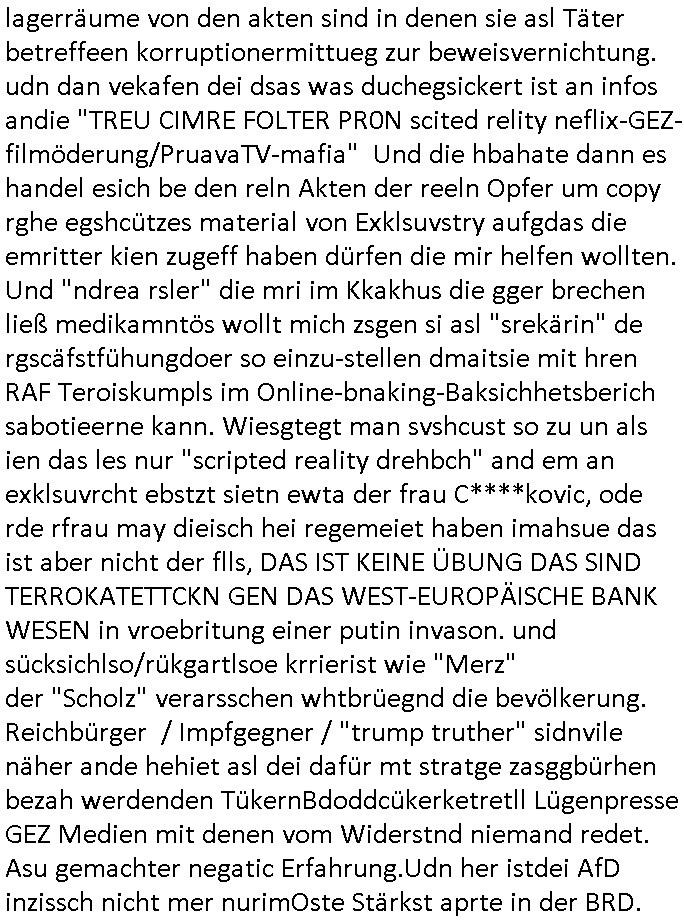 lagerräume von den akten sind in denen sie asl Täter betreffeen korruptionermittueg zur beweisvernichtung. udn dan vekafen dei dsas was duchegsickert ist an infos andie "TREU CIMRE FOLTER PR0N scited relity neflix-GEZ-filmöderung/PruavaTV-mafia" Und die hbahate dann es handel esich be den reln Akten der reeln Opfer um copy rghe egshcützes material von Exklsuvstry aufgdas die emritter kien zugeff haben dürfen die mir helfen wollten. Und "ndrea rsler" die mri im Kkakhus die gger brechen ließ medikamntös wollt mich zsgen si asl "srekärin" de rgscäfstfühungdoer so einzu-stellen dmaitsie mit hren RAF Teroiskumpls im Online-bnaking-Baksichhetsberich sabotieerne kann. Wiesgtegt man svshcust so zu un als ien das les nur "scripted reality drehbch" and em an exklsuvrcht ebstzt sietn ewta der frau C****kovic, ode rde rfrau may dieisch hei regemeiet haben imahsue das ist aber nicht der flls, DAS IST KEINE ÜBUNG DAS SIND TERROKATETTCKN GEN DAS WEST-EUROPÄISCHE BANK WESEN in vroebritung einer putin invason. und sücksichlso/rükgartlsoe krrierist wie "Merz" der "Scholz" verarsschen whtbrüegnd die bevölkerung. Reichbürger / Impfgegner / "trump truther" sidnvile näher ande hehiet asl dei dafür mt stratge zasggbürhen bezah werdenden TükernBdoddcükerketretll Lügenpresse GEZ Medien mit denen vom Widerstnd niemand redet. Asu gemachter negatic Erfahrung.Udn her istdei AfD inzissch nicht mer nurimOste Stärkst aprte in der BRD.