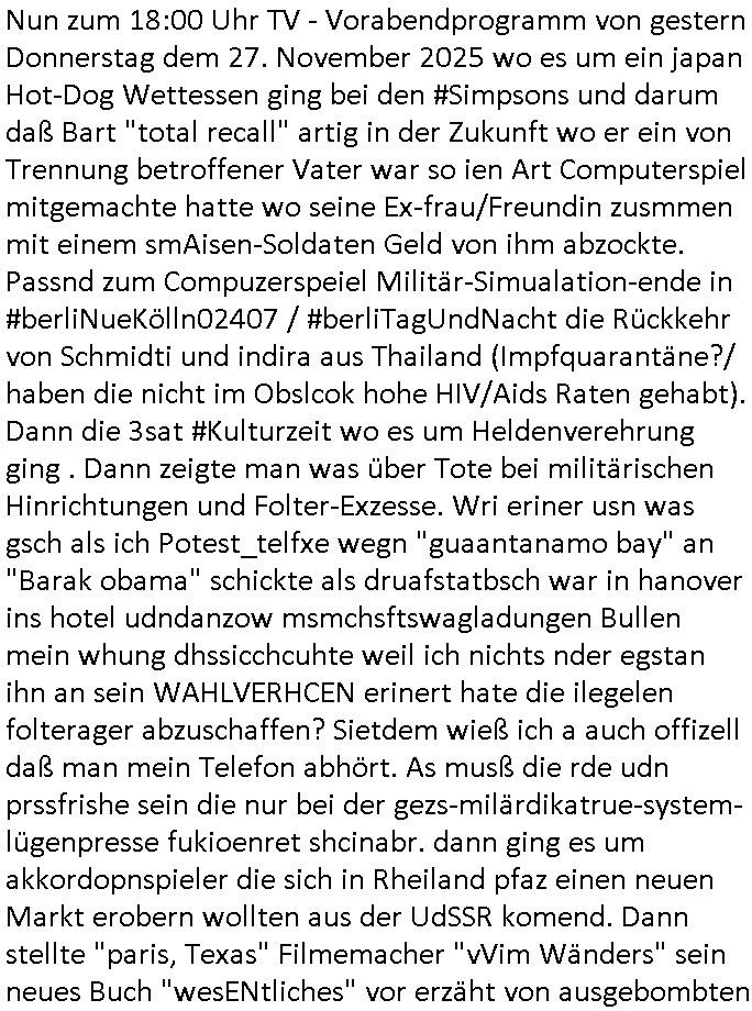 Nun zum 18:00 Uhr TV - Vorabendprogramm von gestern Donnerstag dem 27. November 2025 wo es um ein japan Hot-Dog Wettessen ging bei den #Simpsons und darum daß Bart "total recall" artig in der Zukunft wo er ein von Trennung betroffener Vater war so ien Art Computerspiel mitgemachte hatte wo seine Ex-frau/Freundin zusmmen mit einem smAisen-Soldaten Geld von ihm abzockte. Passnd zum Compuzerspeiel Militär-Simualation-ende in #berliNueKölln02407 / #berliTagUndNacht die Rückkehr von Schmidti und indira aus Thailand (Impfquarantäne?/ haben die nicht im Obslcok hohe HIV/Aids Raten gehabt). Dann die 3sat #Kulturzeit wo es um Heldenverehrung ging . Dann zeigte man was über Tote bei militärischen Hinrichtungen und Folter-Exzesse. Wri eriner usn was gsch als ich Potest_telfxe wegn "guaantanamo bay" an "Barak obama" schickte als druafstatbsch war in hanover ins hotel udndanzow msmchsftswagladungen Bullen mein whung dhssicchcuhte weil ich nichts nder egstan ihn an sein WAHLVERHCEN erinert hate die ilegelen folterager abzuschaffen? Sietdem wieß ich a auch offizell daß man mein Telefon abhört. As musß die rde udn prssfrishe sein die nur bei der gezs-milärdikatrue-system-lügenpresse fukioenret shcinabr. dann ging es um akkordopnspieler die sich in Rheiland pfaz einen neuen Markt erobern wollten aus der UdSSR komend. Dann stellte "paris, Texas" Filmemacher "vVim Wänders" sein neues Buch "wesENtliches" vor erzäht von ausgebombten