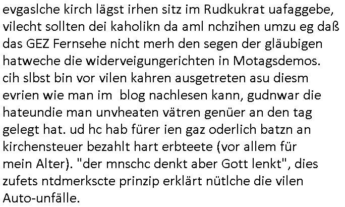 evgaslche kirch lägst irhen sitz im Rudkukrat uafaggebe, vilecht sollten dei kaholikn da aml nchzihen umzu eg daß das GEZ Fernsehe nicht merh den segen der gläubigen hatweche die widerveigungerichten in Motagsdemos. cih slbst bin vor vilen kahren ausgetreten asu diesm evrien wie man im blog nachlesen kann, gudnwar die hateundie man unvheaten vätren genüer an den tag gelegt hat. ud hc hab fürer ien gaz oderlich batzn an kirchensteuer bezahlt hart erbteete (vor allem für mein Alter). "der mnschc denkt aber Gott lenkt", dies zufets ntdmerkscte prinzip erklärt nütlche die vilen Auto-unfälle.