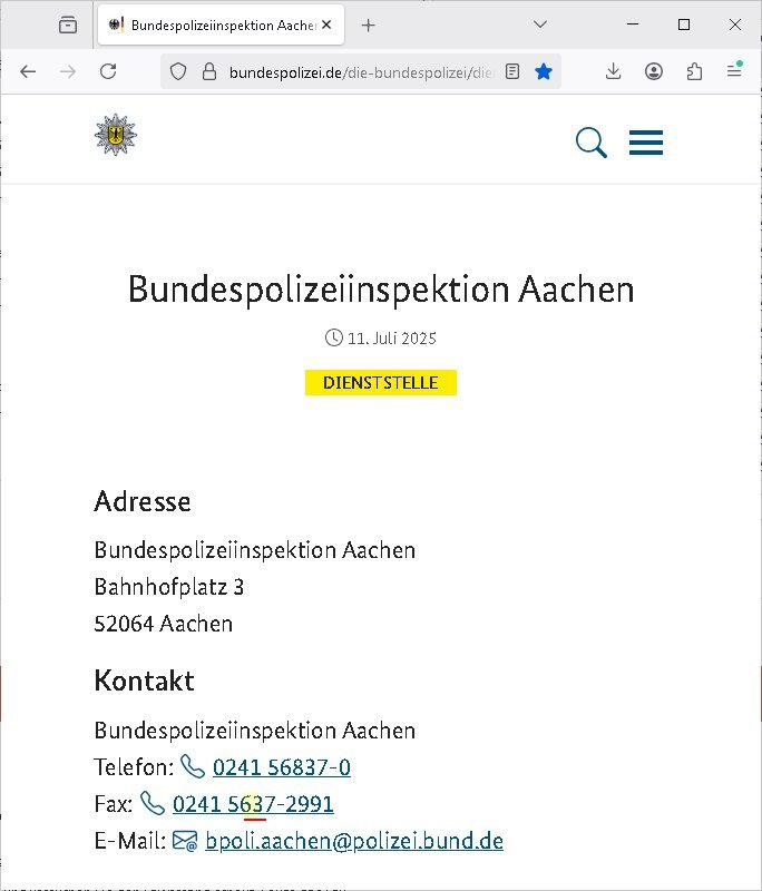 02.12.2025 06:45 https://tvinfo.de/fernsehprogramm/2241860851-hallo-deutschland Faxnummer falsch? +49/(0)241/56-8-37-2991 anstatt +49/(0)241/5637-2991 ? https://bundespolizei.de/die-bundespolizei/dienststellensuche/bundespolizeiinspektion-aachen# Bundespolizeiinspektion Aachen Veröffentlicht am: 11. Juli 2025 Dienststelle Adresse Bundespolizeiinspektion Aachen Bahnhofplatz 3 52064 Aachen Kontakt Bundespolizeiinspektion Aachen Telefon: 0241 56837-0 Fax: 0241 5637-2991 E-Mail: bpoli.aachen@polizei.bund.de siehe auch https://de.wikipedia.org/wiki/Thiel_und_Boerne [0] "202512020645-0-1.jpg" |