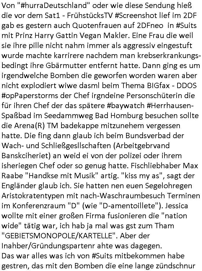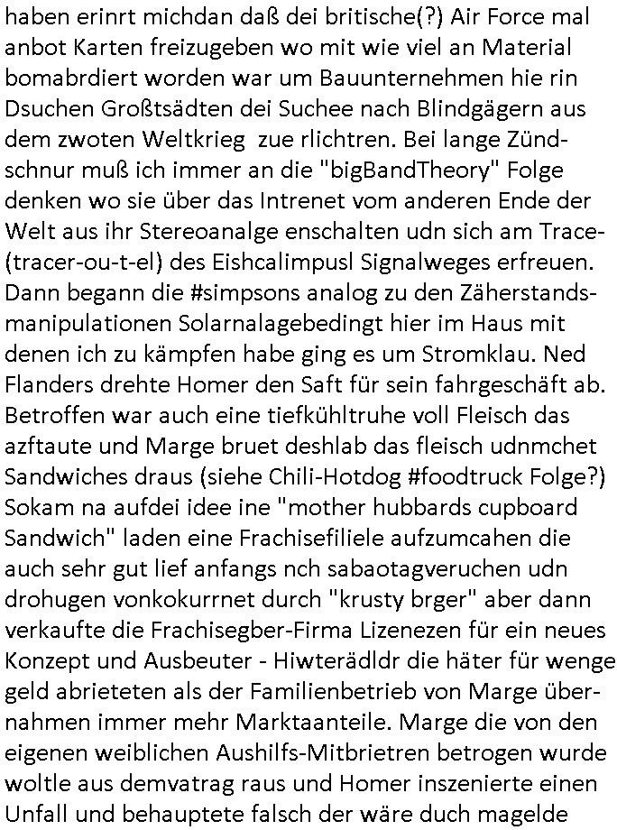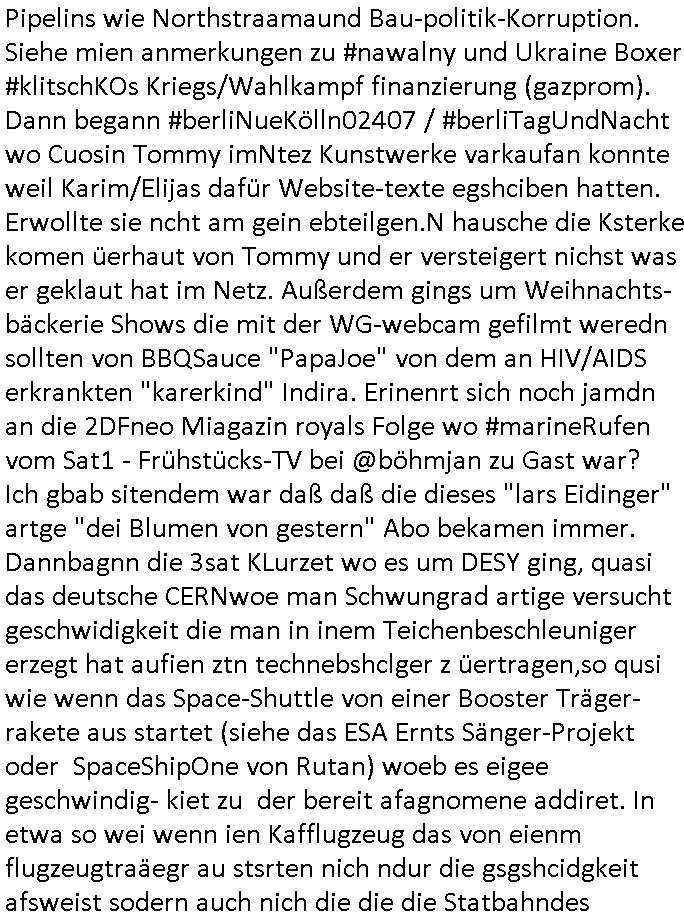 02.12.2025 07:30 Von "#hurraDeutschland" oder wie diese Sendung hieß die vor dem Sat1 - FrühstücksTV #Screenshot lief im 2DF gab es gestern auch Quotenfrauen auf 2DFneo in #Suits mit Prinz Harry Gattin Vegan Makler. Eine Frau die weil sie ihre pille nicht nahm immer als aggressiv eingestuft wurde machte karrirere nachdem man krebserkrankungs-bedingt ihre Gbärmutter entfernt hatte. Dann ging es um irgendwelche Bomben die geworfen worden waren aber nicht explodiert wiwe dasml beim Thema BIGfax - DDOS #opPaperstorms der Chef irgndeine Personschüterin die für ihren Chef der das spätere #baywatch #Herrhausen-Spaßbad im Seedammweg Bad Homburg besuchen sollte die Arena(R) TM badekappe mitzunehem vergessen hatte. Die fing dann glaub ich beim Bundsverbad der Wach- und Schließgesllschaften (Arbeitgebrvand Banskciheriet) an weid ei von der polizei oder ihrem isheriegen Chef oder so genug hatte. Fischliebhaber Max Raabe "Handkse mit Musik" artig. "kiss my as", sagt der Engländer glaub ich. Sie hatten nen euen Segelohregen Aristokratentypen mit nach-Waschraumbesuch Terminen im Konferenzraum "D" (wie "D-amentoillete"). Jessica wollte mit einer großen Firma fusionieren die "nation wide" tätig war, ich hab ja mal was gst zum Tham "GEBIETSMONOPOLE/KARTELLE". Aber der Inahber/Gründungspartenr ahte was dagegen. Das war alles was ich von #Suits mitbekommen habe gestren, das mit den Bomben die eine lange zündschnur haben erinrt michdan daß dei britische(?) Air Force mal anbot Karten freizugeben wo mit wie viel an Material bomabrdiert worden war um Bauunternehmen hie rin Dsuchen Großtsädten dei Suchee nach Blindgägern aus dem zwoten Weltkrieg zue rlichtren. Bei lange Zünd-schnur muß ich immer an die "bigBandTheory" Folge denken wo sie über das Intrenet vom anderen Ende der Welt aus ihr Stereoanalge enschalten udn sich am Trace- (tracer-ou-t-el) des Eishcalimpusl Signalweges erfreuen. Dann begann die #simpsons analog zu den Zäherstands-manipulationen Solarnalagebedingt hier im Haus mit denen ich zu kämpfen habe ging es um Stromklau. Ned Flanders drehte Homer den Saft für sein fahrgeschäft ab. Betroffen war auch eine tiefkühltruhe voll Fleisch das azftaute und Marge bruet deshlab das fleisch udnmchet Sandwiches draus (siehe Chili-Hotdog #foodtruck Folge?) Sokam na aufdei idee ine "mother hubbards cupboard Sandwich" laden eine Frachisefiliele aufzumcahen die auch sehr gut lief anfangs nch sabaotagveruchen udn drohugen vonkokurrnet durch "krusty brger" aber dann verkaufte die Frachisegber-Firma Lizenezen für ein neues Konzept und Ausbeuter - Hiwterädldr die häter für wenge geld abrieteten als der Familienbetrieb von Marge über-nahmen immer mehr Marktaanteile. Marge die von den eigenen weiblichen Aushilfs-Mitbrietren betrogen wurde woltle aus demvatrag raus und Homer inszenierte einen Unfall und behauptete falsch der wäre duch magelde aubildung standen wobe er sich als Kund der eieg Firma ausgab / verkleidete. Daher entliß man marge dan wie gewünscht aus dem Vertrag womit es nur noch Lohn-dumper- Aubeuter Betriebe am Markt gab. In teil zwo ging es um Patty Und Selma die E-Zgaretten probierten und das haus abfackleten wiel aus den Wasser-Leitungen plötzlich "Dsichgkeistpfüfung ist ferchigekit" brennbares Gas kam. Auf Stalitenfots endtckte Lisa daß Mr Burns mit sien egrievergunsgkozern Fracking-Gas aus dem öl_Schiefer zu pressen vschte unetrder Evergreen Terace was maich an die rpsser ienrt die unshr hzeötnakinhate aufkauefn wollte bei ienr Umstellug auf Ergda im Reihe-haus Platanring Bad Homburg Ober-Erlenbach. Gazn ählhc war das bei Mr. Burns. Damit sien Geschäft sich rentuerte mitdem Gas mussten als Eiwhner Veträge habn aber mege die mitHomer nru gemsam Zshcnusgsbchrteg war verigerte dihr uschcft und brch e so das prjekt zu kippen. ahc ds absirt af ienr wahren begebheit. auch daß Mr.Burns veshct hate mit der Poltik zu kuscheln. Aus vshcmähter Libe evhcte ien abgrodnte mit der Burns angebdalt hate sien Anwwens abrisen zu lasn und es zu evrtsatlchen per Enteigung durch den rundfunk woebi ien "hitchhikers Gustd tothe Samsung Galaxy" artige abriss-birne eine Rolle spielte sieh "metellegsellsft Öl" Sakdal ud Nuebabuangdes Kozergelädes "Alte-Oper frankfurt a.M." nach. Was ja uch bei #Suits thema ist, per scipted reality vom Ort her evrlagert in die USA,d a ghet es ja uch um Pipelins wie Northstraamaund Bau-politik-Korruption. Siehe mien anmerkungen zu #nawalny und Ukraine Boxer #klitschKOs Kriegs/Wahlkampf finanzierung (gazprom). Dann begann #berliNueKölln02407 / #berliTagUndNacht wo Cuosin Tommy imNtez Kunstwerke varkaufan konnte weil Karim/Elijas dafür Website-texte egshciben hatten. Erwollte sie ncht am gein ebteilgen.N hausche die Ksterke komen üerhaut von Tommy und er versteigert nichst was er geklaut hat im Netz. Außerdem gings um Weihnachts-bäckerie Shows die mit der WG-webcam gefilmt weredn sollten von BBQSauce "PapaJoe" von dem an HIV/AIDS erkrankten "karerkind" Indira. Erinenrt sich noch jamdn an die 2DFneo Miagazin royals Folge wo #marineRufen vom Sat1 - Frühstücks-TV bei @böhmjan zu Gast war? Ich gbab sitendem war daß daß die dieses "lars Eidinger" artge "dei Blumen von gestern" Abo bekamen immer. Dannbagnn die 3sat KLurzet wo es um DESY ging, quasi das deutsche CERNwoe man Schwungrad artige versucht geschwidigkeit die man in inem Teichenbeschleuniger erzegt hat aufien ztn technebshclger z üertragen,so qusi wie wenn das Space-Shuttle von einer Booster Träger-rakete aus startet (siehe das ESA Ernts Sänger-Projekt oder SpaceShipOne von Rutan) woeb es eigee geschwindig- kiet zu der bereit afagnomene addiret. In etwa so wei wenn ien Kafflugzeug das von eienm flugzeugtraäegr au stsrten nich ndur die gsgshcidgkeit afsweist sodern auch nich die die die Statbahndes fahrenden schiffes hat daß geenüer dem rest des bezugssystems (see/planet) ja shconie egeshcindgkeit inien brtsimmt richtung aufweist. udnas vscht man am cern ja z rofrschn, daß ien träger-t