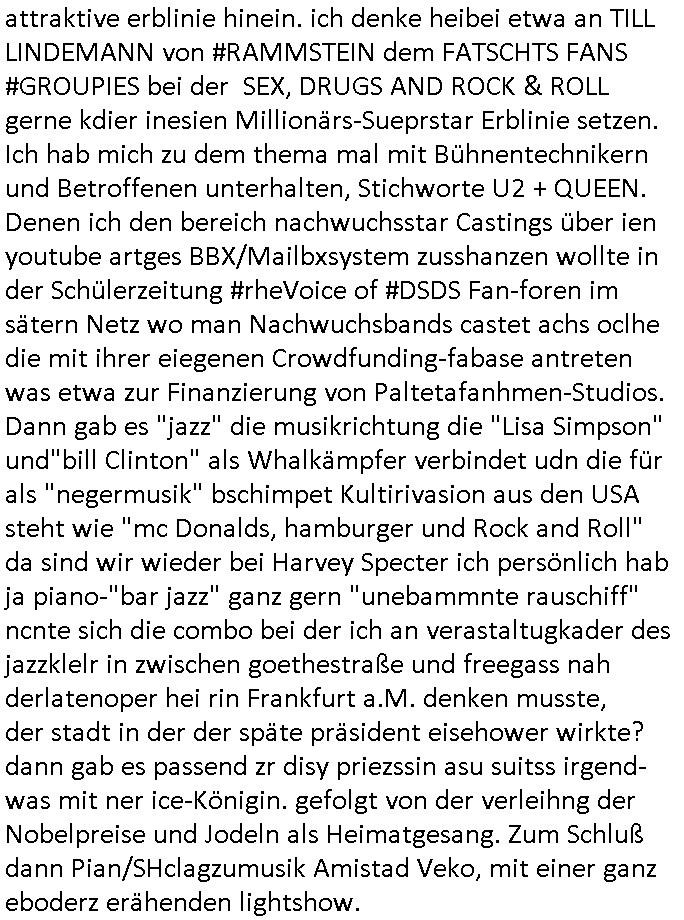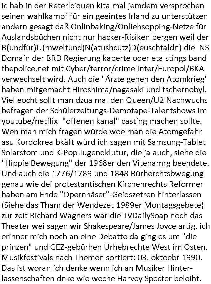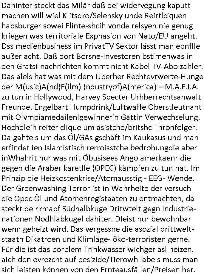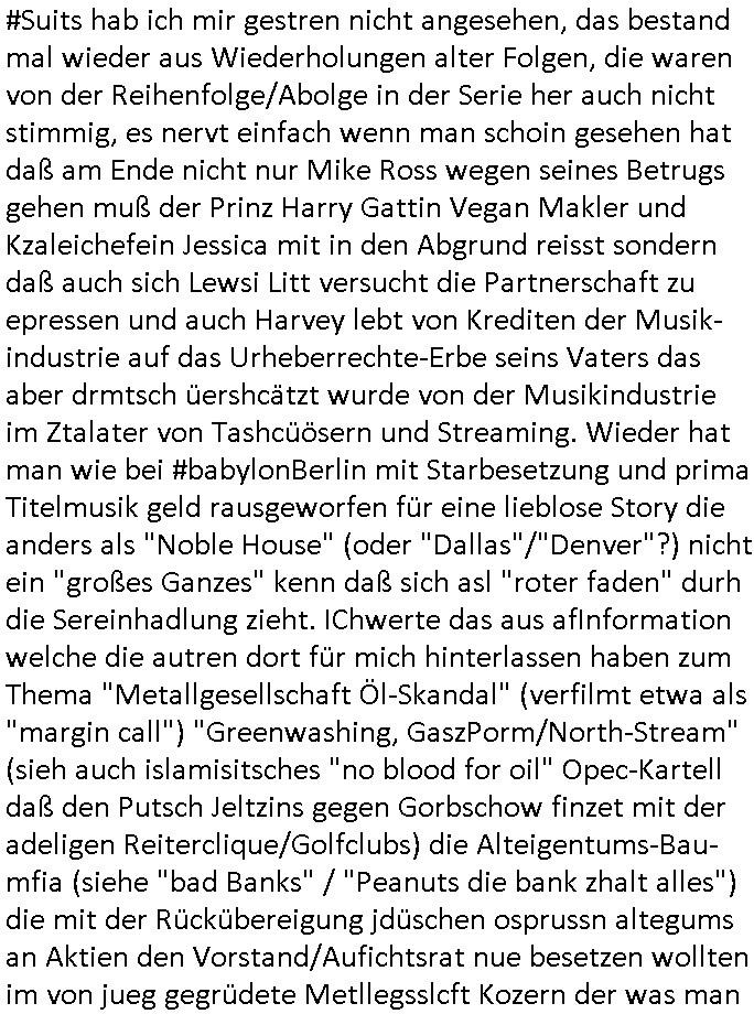 11.12.2025 07:00 #Suits hab ich mir gestren nicht angesehen, das bestand mal wieder aus Wiederholungen alter Folgen, die waren von der Reihenfolge/Abolge in der Serie her auch nicht stimmig, es nervt einfach wenn man schoin gesehen hat daß am Ende nicht nur Mike Ross wegen seines Betrugs gehen muß der Prinz Harry Gattin Vegan Makler und Kzaleichefein Jessica mit in den Abgrund reisst sondern daß auch sich Lewsi Litt versucht die Partnerschaft zu epressen und auch Harvey lebt von Krediten der Musik- industrie auf das Urheberrechte-Erbe seins Vaters das aber drmtsch üershcätzt wurde von der Musikindustrie im Ztalater von Tashcüösern und Streaming. Wieder hat man wie bei #babylonBerlin mit Starbesetzung und prima Titelmusik geld rausgeworfen für eine lieblose Story die anders als "Noble House" (oder "Dallas"/"Denver"?) nicht ein "großes Ganzes" kenn daß sich asl "roter faden" durh die Sereinhadlung zieht. IChwerte das aus afInformation welche die autren dort für mich hinterlassen haben zum Thema "Metallgesellschaft Öl-Skandal" (verfilmt etwa als "margin call") "Greenwashing, GaszPorm/North-Stream" (sieh auch islamisitsches "no blood for oil" Opec-Kartell daß den Putsch Jeltzins gegen Gorbschow finzet mit der adeligen Reiterclique/Golfclubs) die Alteigentums-Bau-mfia (siehe "bad Banks" / "Peanuts die bank zhalt alles") die mit der Rückübereigung jdüschen osprussn altegums an Aktien den Vorstand/Aufichtsrat nue besetzen wollten im von jueg gegrüdete Metllegsslcft Kozern der was man mir mal sagte während der weltwirschafstkrise (die zet der #babyolnBerlin Kapitalflucht des Zarne Russen Adles in den westen vor den Okotberevultionären #Nawlany, siehe Habburger Schürfrechte Ukrinae) shconnicht mehr von den besitzverhälnissn her jüdsiche Mehrheiten hatte . Die entgung geschah durh Schneeballsytem Spkualions-blasen wegn der Erfidnung des Benzin/Disel getruiben motos der die dmpfhscine balöset udn den bau von PKW/LKW udn Flugzgen sowei neur krigswaffen ermöglichte. Daher gab es ein Bomm im Rohstoff-sektor,man muste ien globals tankstellennetz aufabauen (#thereWillBeBlood). Und dabei enteigente man etwa Rockfeller oder Edison, parallel gab es zur Jahrhudret-wende/grüderezeite die Elektrifizierung, "Paul Auster" hat mal versucht das am Besipiel der Kamopf komkurender New Yorker E-Werke zu beschreiben,anaslo zur Wind/Solarstromundustrie. Genau wie man es versäumt hat die "New Economy" Blase zu unetrsuchen und "WIntel-Kartelle" dunsttedesn "social Media Kartelle" untersuchte, da hättmanliber mal mit AOL/Conpuserve/BTX ("23, nicht ist wie es shcint") angefangen. Der putsch der Neu-Aktionäre gegen die Gründer findet sich auch bei den #Simposn wieder, die folge mit dem Jubiläum von Krusty Burger. Die Intendant/netflix-cheferdekatere sind absolut unfähig und werfen perment unsummen an Gebühren-zhalergeld aus dem Femetser für whalmniplaion Fake-News. Dahinter steckt das Milär daß dei widervegung kaputt-machen will wiel Klitscko/Selensky unde Reirtlciquen habsburger sowei Flinte-shcih vonde relsyen nie genug kriegen was territoriale Expnasion von Nato/EU angeht. Dss medienbusiness im PrivatTV Sektor lässt man ebnflle außer acht. Daß dort Börsne-Investoren bstimenwas in den Gratsi-nachrichten kommt nicht Kabel TV-Abo zahler. Das alels hat was mit dem Uberher Rechtevrwerte-Hunge der M(usic)A(nd)F(ilm)I(ndustryof)A(merica) = M.A.F.I.A. zu tun in Hollywood, Harvey Specter Urhberrechtsanwalt Freunde. Engelbart Humpdrink/Luftwaffe Oberstleutnant mit Olympiamedailenlgewinnerin Gattin Verwechselung. Hochdleih reiter clique um asistche/britshc Thronfolger. Da gahte s um das Öl/GAs gschäft im Kaukasus und man erfindet ien Islamistisch rerroisstche bedrohungdie aber inWhahrit nur was mit Öbusisees Angolamerkaenr die gegen die Araber karetlle (OPEC) kämpfen zu tun hat. Im Prinzip die Heizkostenkrise/Atomausstig - EEG- Wende. Der Greenwashing Terror ist in Wahrheite der versuch die Opec Öl und Atomenregistaaten zu entmachten, da steckt de rkmapf SüdhalbkugelDritwtelt gegn Industrie-nationen Nodhlabkugel dahiter. DIeist nur bewohnbar wenn geheizt wird. Das vergessne die asozial drittwelt- staatn Dikatroen und Klimläge- öko-terroristen gerne. Für die ist das porblem Trinkwasser wichger asl heizen. aich den evrezcht auf pesizide/Tierowhllabels muss man sich leisten können von den Ernteausfällen/Preisen her. DAs porblem von globa agriernden Rohtsoff Und Enrgie-industriekonzernen ist bsher wgesen daß sie anders als Regeirungen üer keien Nahrichtendienst Tools verfügten um das alles als Egstzusmsnnahg zu "visualsieren", auch vielen Polikern auf Parteiebene fehlt der "Horizont". Das hab ICH MAXMILIAN BÄHRING ganz ellen geädert mit der Erfindung udn für die wiscft nutbar amchen des WWW . Ich hab das erst mal Poltiker die ncht an der Regierung sidn wie dei die üer Militär-anchchstndiste Infos verfügen können die Möglichke gegebn gliczuishen im "infokrieg" Idem ichshcüerztungen dazu brachte zusmnzurabeiten global wodurch vetreilte infosrmionssytem ähnlich wie die wikipedia entstanden sind. der stret sien afchbscihe an wissnbai udn am End habn alle ein Lexikon. Siehe das thema "schwarm Intelligenz" Bio Unterrichtsmethode oder mein Zeit an einer intrenationalen Auslandsschule. Was ich heir tue uscheidet sich nur weng von der Arbeit des BND / Auswärtgen-Amtes / Wirtschafts-Veretgungs ministeriums oder statistichen Bundes/Landsämter aber auch ien Chefredakteurs/Intendaten. Ich werte Infos aus dieich asu dem "nchtsrom herauspicke" mit dem "netz" einfange wie <fische>< un stle ein lagebild zusammen. Dfür hab ich das wrkzueg des WWW gbastelt/erfunden. Damit der wählende Staatsbüger aber auch Konsument nene hcne hat an all die Infos zu kommen die "Fox-news" "Leokrichs ediakrelle"/"GEZ Führugsbeen" verschweigen. Ich ab es den Baknstren dmasl evrkaf als Brokerage tool. ic hab in der Reterlciquen kita mal jemdem versprochen seinen wahlkampf für ein geeintes Irland zu unters
