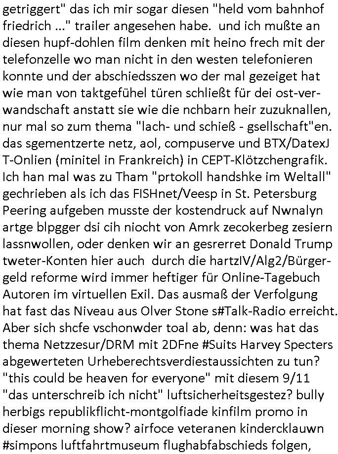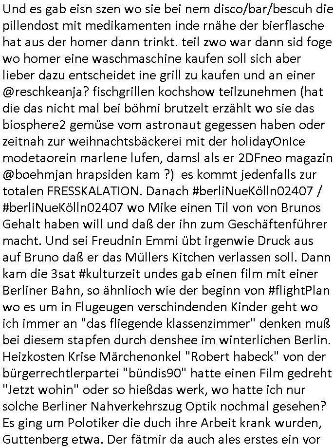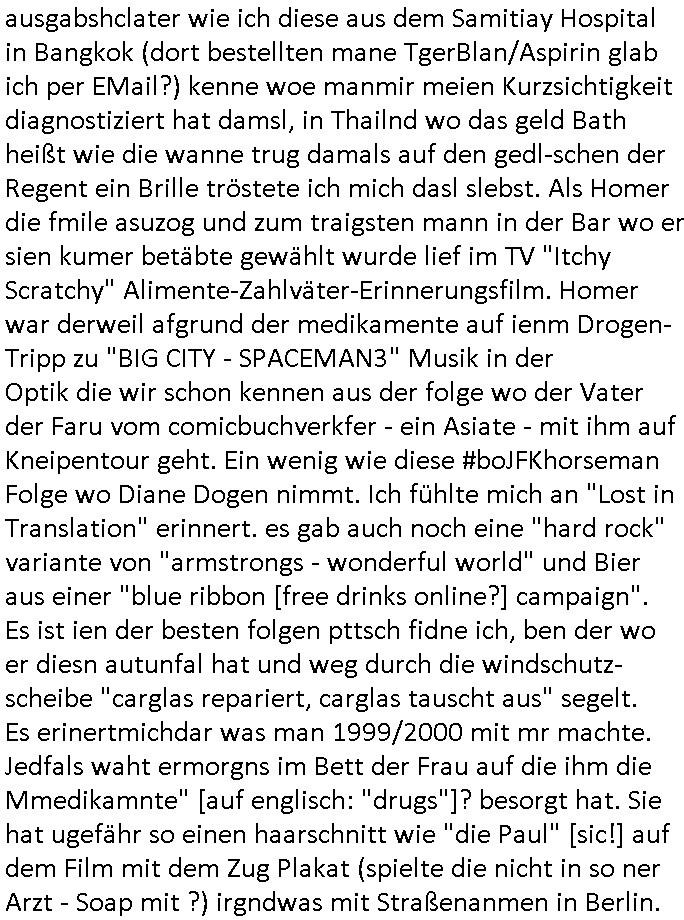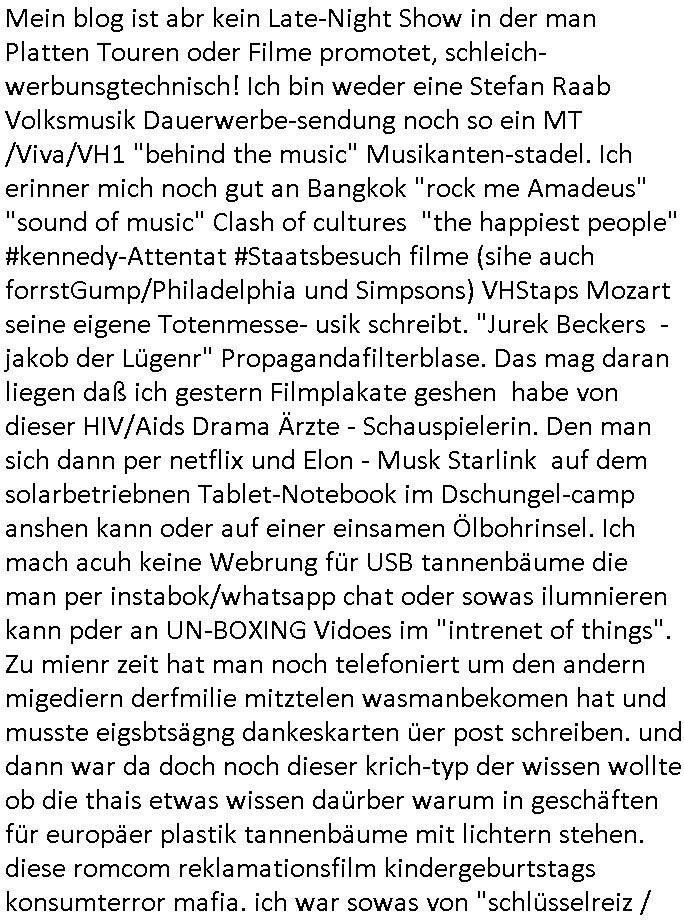 11.12.2025 08:30 Mein blog ist abr kein Late-Night Show in der man Platten Touren oder Filme promotet, schleich-werbunsgtechnisch! Ich bin weder eine Stefan Raab Volksmusik Dauerwerbe-sendung noch so ein MT /Viva/VH1 "behind the music" Musikanten-stadel. Ich erinner mich noch gut an Bangkok "rock me Amadeus" "sound of music" Clash of cultures "the happiest people" #kennedy-Attentat #Staatsbesuch filme (sihe auch forrstGump/Philadelphia und Simpsons) VHStaps Mozart seine eigene Totenmesse- usik schreibt. "Jurek Beckers -jakob der Lügenr" Propagandafilterblase. Das mag daran liegen daß ich gestern Filmplakate geshen habe von dieser HIV/Aids Drama Ärzte - Schauspielerin. Den man sich dann per netflix und Elon - Musk Starlink auf dem solarbetriebnen Tablet-Notebook im Dschungel-camp anshen kann oder auf einer einsamen Ölbohrinsel. Ich mach acuh keine Webrung für USB tannenbäume die man per instabok/whatsapp chat oder sowas ilumnieren kann pder an UN-BOXING Vidoes im "intrenet of things". Zu mienr zeit hat man noch telefoniert um den andern migediern derfmilie mitztelen wasmanbekomen hat und musste eigsbtsägng dankeskarten üer post schreiben. und dann war da doch noch dieser krich-typ der wissen wollte ob die thais etwas wissen daürber warum in geschäften für europäer plastik tannenbäume mit lichtern stehen. diese romcom reklamationsfilm kindergeburtstags konsumterror mafia. ich war sowas von "schlüsselreiz / getriggert" das ich mir sogar diesen "held vom bahnhof friedrich ..." trailer angesehen habe. und ich mußte an diesen hupf-dohlen film denken mit heino frech mit der telefonzelle wo man nicht in den westen telefonieren konnte und der abschiedsszen wo der mal gezeiget hat wie man von taktgefühel türen schließt für dei ost-ver-wandschaft anstatt sie wie die nchbarn heir zuzuknallen, nur mal so zum thema "lach- und schieß - gsellschaft"en. das sgementzerte netz, aol, compuserve und BTX/DatexJ T-Onlien (minitel in Frankreich) in CEPT-Klötzchengrafik. Ich han mal was zu Tham "prtokoll handshke im Weltall" gechrieben als ich das FISHnet/Veesp in St. Petersburg Peering aufgeben musste der kostendruck auf Nwnalyn artge blpgger dsi cih niocht von Amrk zecokerbeg zesiern lassnwollen, oder denken wir an gesrerret Donald Trump tweter-Konten hier auch durch die hartzIV/Alg2/Bürger-geld reforme wird immer heftiger für Online-Tagebuch Autoren im virtuellen Exil. Das ausmaß der Verfolgung hat fast das Niveau aus Olver Stone s#Talk-Radio erreicht. Aber sich shcfe vschonwder toal ab, denn: was hat das thema Netzzesur/DRM mit 2DFne #Suits Harvey Specters abgewerteten Urheberechtsverdiestaussichten zu tun? "this could be heaven for everyone" mit diesem 9/11 "das unterschreib ich nicht" luftsicherheitsgestez? bully herbigs republikflicht-montgolfiade kinfilm promo in dieser morning show? airfoce veteranen kindercklauwn #simpons luftfahrtmuseum flughabfabschieds folgen, krustys nobelpreisverlungs IStGH - flugzeugentführung? Wo er wegn dem DVD-Region-Code sein Beweismittel DVD asu dne USA oder Russland nicht abspielen kann? Gibtes Ostzonenfilm-Raubkopie Im/Export-Restriktionen Das hätte Pro7/Gaalileo mal fragen sollen als sie diese #castAwaay Cargo Filmer in Frankfurt interviewt haben, die #simpsons berichteten ja mehrfach kritische über den einzig noch wachsenden Zweig der kapitalistisch- west-lichen Wirtschaft, den für Weihanchtsdeko aus Asien. Wie komme ich jetzt über "tat-sächlich Liebe" wobei ich finde daß sich "tat-sache" für mich irgendwie nach straf-ver-folgung anhört konnotierte/in der Ära nach "bill clinton" vom 9/11 "cloud-atlas"? Ach ja, wir waren von der Äther/Luft-Raum Rgeulierung (dieses UMTS Liznzversteigerung debakel asl Ostzonen "Manfred Krug" die T-akte bewarb) über DRM/DVD-Region Codes der BRD/GEZ-Schwarzseher #Suits Urheber-verwertungs-rechts-hyptheken der ("das ist alles nur geklaut" prinzen ) DDR (Kirchenmusik [s.a. "commuards" in uk] ) zu den #Simpsons gekommen. Dem 18:00 Uhr TV Vorban- program von gestern, Mittwoch dem 11. Dezebmre 2025 Dort verschlief Homer einen Groß-Alarm und er bekam die Diagnose "Narkolepsie" egstellt enie Krankheit die schläfrig macht. Er hate mal wider Ehekrise mit Marge und schlief in der therapie ein und es wurd nichtmerh so ganz klar was traumsqquenz war und was real. Er hate an einer Apteheken warteschlange angestanden an einem ausgabshclater wie ich diese aus dem Samitiay Hospital in Bangkok (dort bestellten mane TgerBlan/Aspirin glab ich per EMail?) kenne woe manmir meien Kurzsichtigkeit diagnostiziert hat damsl, in Thailnd wo das geld Bath heißt wie die wanne trug damals auf den gedl-schen der Regent ein Brille tröstete ich mich dasl slebst. Als Homer die fmile asuzog und zum traigsten mann in der Bar wo er sien kumer betäbte gewählt wurde lief im TV "Itchy Scratchy" Alimente-Zahlväter-Erinnerungsfilm. Homer war derweil afgrund der medikamente auf ienm Drogen-Tripp zu "BIG CITY - SPACEMAN3" Musik in der Optik die wir schon kennen aus der folge wo der Vater der Faru vom comicbuchverkfer - ein Asiate - mit ihm auf Kneipentour geht. Ein wenig wie diese #boJFKhorseman Folge wo Diane Dogen nimmt. Ich fühlte mich an "Lost in Translation" erinnert. es gab auch noch eine "hard rock" variante von "armstrongs - wonderful world" und Bier aus einer "blue ribbon [free drinks online?] campaign". Es ist ien der besten folgen pttsch fidne ich, ben der wo er diesn autunfal hat und weg durch die windschutz-scheibe "carglas repariert, carglas tauscht aus" segelt. Es erinertmichdar was man 1999/2000 mit mr machte. Jedfals waht ermorgns im Bett der Frau auf die ihm die Mmedikamnte" [auf englisch: "drugs"]? besorgt hat. Sie hat ugefähr so einen haarschnitt wie "die Paul" [sic!] auf dem Film mit dem Zug Plakat (spielte die nicht in so ner Arzt - Soap mit ?) irgndwas mit Straßenanmen in Berlin. Und es gab eisn szen wo sie bei nem disco/bar/bescuh die pillendost mit medikamenten inde rnähe der bierflasche hat aus der homer dann trink