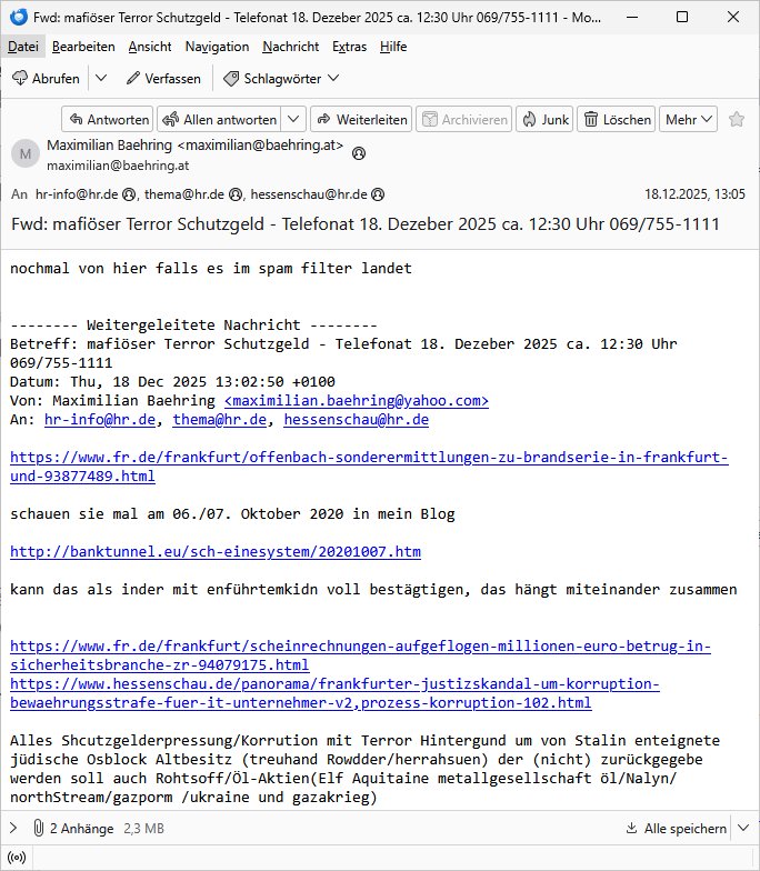 19.12.2025 04:30 -------- Nachricht -------- Betreff: Fwd: mafiöser Terror Schutzgeld - Telefonat 18. Dezeber 2025 ca. 12:30 Uhr 069/755-1111 Datum: Thu, 18 Dec 2025 13:05:40 +0100 Von: Maximilian Baehring <maximilian@baehring.at> An: hr-info@hr.de, thema@hr.de, hessenschau@hr.de nochmal von hier falls es im spam filter landet -------- Weitergeleitete Nachricht -------- Betreff: mafiöser Terror Schutzgeld - Telefonat 18. Dezeber 2025 ca. 12:30 Uhr 069/755-1111 Datum: Thu, 18 Dec 2025 13:02:50 +0100 Von: Maximilian Baehring <maximilian.baehring@***> An: hr-info@hr.de, thema@hr.de, hessenschau@hr.de https://www.fr.de/frankfurt/offenbach-sonderermittlungen-zu-brandserie-in-frankfurt-und-93877489.html schauen sie mal am 06./07. Oktober 2020 in mein Blog http://banktunnel.eu/sch-einesystem/20201007.htm kann das als inder mit enführtemkidn voll bestägtigen, das hängt miteinander zusammen https://www.fr.de/frankfurt/scheinrechnungen-aufgeflogen-millionen-euro-betrug-in-sicherheitsbranche-zr-94079175.html https://www.hessenschau.de/panorama/frankfurter-justizskandal-um-korruption-bewaehrungsstrafe-fuer-it-unternehmer-v2,prozess-korruption-102.html Alles Shcutzgelderpressung/Korrution mit Terror Hintergund um von Stalin enteignete jüdische Osblock Altbesitz (treuhand Rowdder/herrahsuen) der (nicht) zurückgegebe werden soll auch Rohtsoff/Öl-Aktien(Elf Aquitaine metallgesellschaft öl/Nalyn/northStream/gazporm /ukraine und gazakrieg) siehe V(ideb)log http://tiktok.maximilian.baehring.at/ oder http:s//facebook.com/maximilian.baehring.9/ http://banktunnel.eu/sch-einesystem/20251218.htm ([1] auch als PDF-Datei (sch-einesystem.168) ([2] zum download unter http://banktunnel.eu/pdf.php #herrhausen#RAFterror#badHomburg#zentralBank http://blog.sch-einesystem.de/ oder https://zentral-bank.eu/tumblr.com/ http://bad-homburg.eu/download/ --- [1] URL-Format http://banktunnel.eu/sch-einesystem/YYYYMMDD.htm YYYY = Year/Jahr, MM = Month/Monat, DD = Day/Tag [2] URL-Format http://banktunnel.eu/tumblr.com/sch-einesystem.###.pdf ### = fortaulfene, seit 84 monatlich um 1 erhöhte Nummer wahlweise als PDF oder HTML Datei, auch per HTTPS (SSL) https://zentral-bank.eu/tumblr.com/sch-einesystem.###.htm === https://www.fr.de/frankfurt/scheinrechnungen-aufgeflogen-millionen-euro-betrug-in-sicherheitsbranche-zr-94079175.html https://www.hessenschau.de/panorama/festnahmen-nach-explosion-vor-shisha-bar-in-offenbach-v3,offenbach-explosion-102.html https://www.hessenschau.de/panorama/explosionen-und-brandanschlaege-im-rhein-main-gebiet-polizei-ermittelt-in-neun-faellen-v3,brandanschlaege-serie-rhein-main-100.html https://www.hessenschau.de/panorama/frankfurter-justizskandal-um-korruption-bewaehrungsstrafe-fuer-it-unternehmer-v2,prozess-korruption-102.html === -------- Nachricht -------- Betreff: Fwd: mafiöser Terror Schutzgeld - Telefonat 18. Dezeber 2025 ca. 12:30 Uhr 069/755-1111 Datum: Thu, 18 Dec 2025 13:04:10 +0100 Von: webmaster@zentral-bank.eu <webmaster@zentral-bank.eu> An: hr-info@hr.de, thema@hr.de, hessenschau@hr.de -------- Weitergeleitete Nachricht -------- Betreff: mafiöser Terror Schutzgeld - Telefonat 18. Dezeber 2025 ca. 12:30 Uhr 069/755-1111 Datum: Thu, 18 Dec 2025 13:02:50 +0100 Von: Maximilian Baehring <maximilian.baehring@yahoo.com> An: hr-info@hr.de, thema@hr.de, hessenschau@hr.de [...] === Datum Name / Rufnummer Dauer (hh:mm) 18.12.25 12:32 0691551111 0:15 18.12.25 12:26 0692578290 0:01 [0] "202512190430-0-1.jpg" [1] "202512190430-0-2.jpg" [2] "202512190430-0-3.jpg" [3] "202512190430-0-4.jpg" [4] "202512190430-0-5.jpg" [5] "202512190430-0-6.jpg" [6] "202512190430-0-7.jpg" |