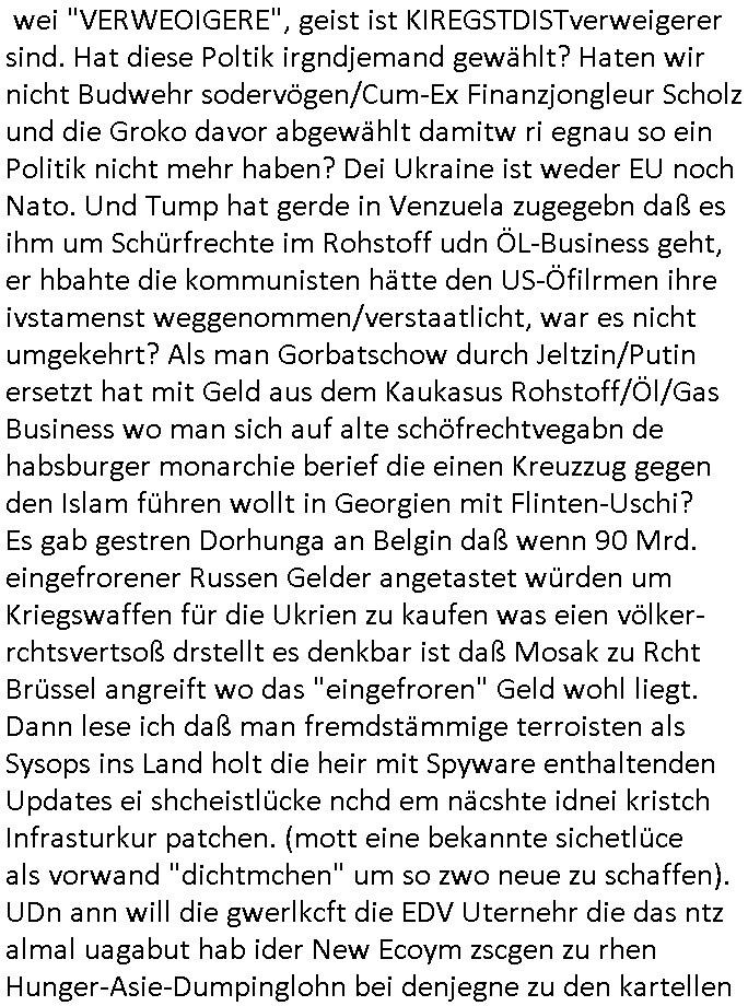 19.12.2025 05:30 Ich hab gestern Mut geschöpft/gefasst nchem ich gelsen habe daß es zahrice Korrutiosbdigte erfatungen gegeben hat die ganu indie rchtun gehen in der ich Hiwneis gab oder Strafanzeigen machte. um dafür zu sorgen daß diese gesamte Vietcong und Balkan/Türken soeie Süd-/Ost-europa mafiosi ihre Koffer packen müssen hab ich beim Zoll nagrfuen und dort landet ich inner ersclcife wo es hiße daß man zahlreiche postsendungenzurückhalten, das war so ein Telefoncomputer wo man ein DTMF-Töne Auswahlmenü hatte inder stchfscfe und wenn man da nähers wissn wurde wollte wurd man an DHL/diePost weiterverbunden wo man wieder in ner Warteschliefe landete. Ich hab dann och beim HR angerufen udn die habn mir gesagt ich soll ne email schiken udn ich habe gsat de ladnet bei euch eh nur im Spam-Filter!Ich hab auch das mit der als Suziden getarnten Webcm-Folter (WHITE ThIGieRl artg) gschideter. Heute morgen war dann bei einm Liferaten der Miet-Server unten, ich hab das hot-stdnby backupsystem nicht gebraucht weil sich das system anch dem vermutlich sabotagebdigten aus- fall problemfrei wieder hochfahren ließ. Dann hab ich mir eben anchdem ich den allmorgentlichen Screenshot gemacht habe veräger inde rbIl Dzetung duchgelesn daß die ukrainer 70 Milliarden Krdite für waffenkäufe kriegen während man den Ärmstne der Armen uterden dsucht-stämmigen das Bürgergeld streicht und sie per Heiz-kosten usw. in die Obdachlosgkiet zu treiben versucht so wei "VERWEOIGERE", geist ist KIREGSTDISTverweigerer sind. Hat diese Poltik irgndjemand gewählt? Haten wir nicht Budwehr sodervögen/Cum-Ex Finanzjongleur Scholz und die Groko davor abgewählt damitw ri egnau so ein Politik nicht mehr haben? Dei Ukraine ist weder EU noch Nato. Und Tump hat gerde in Venzuela zugegebn daß es ihm um Schürfrechte im Rohstoff udn ÖL-Business geht, er hbahte die kommunisten hätte den US-Öfilrmen ihre ivstamenst weggenommen/verstaatlicht, war es nicht umgekehrt? Als man Gorbatschow durch Jeltzin/Putin ersetzt hat mit Geld aus dem Kaukasus Rohstoff/Öl/Gas Business wo man sich auf alte schöfrechtvegabn de habsburger monarchie berief die einen Kreuzzug gegen den Islam führen wollt in Georgien mit Flinten-Uschi? Es gab gestren Dorhunga an Belgin daß wenn 90 Mrd. eingefrorener Russen Gelder angetastet würden um Kriegswaffen für die Ukrien zu kaufen was eien völker- rchtsvertsoß drstellt es denkbar ist daß Mosak zu Rcht Brüssel angreift wo das "eingefroren" Geld wohl liegt. Dann lese ich daß man fremdstämmige terroisten als Sysops ins Land holt die heir mit Spyware enthaltenden Updates ei shcheistlücke nchd em näcshte idnei kristch Infrasturkur patchen. (mott eine bekannte sichetlüce als vorwand "dichtmchen" um so zwo neue zu schaffen). UDn ann will die gwerlkcft die EDV Uternehr die das ntz almal uagabut hab ider New Ecoym zscgen zu rhen Hunger-Asie-Dumpinglohn bei denjegne zu den kartellen gehörenden Firmen ezu arbeiten die wi bei meiner Firma per per DDOS/Viren/Spam/hacker attacken die New Economy kaputtgacht haben per maföser allermassivster Wirtschafstkriminaliät bis hin zu Sprgtsoff-Terroranschlägen sowie Kidnapping. Genau wie ich vorhergesagt hatte fidndie Justz/polize heraus daß es Milloshscre Korrution gab bei staatlicher beschaffung von IT-Systemen, kritischer Infrastruktur. Aber ihr lasst weiter frmstämmge terroristen und krigs-wütige alegzum juden/nazis/sazlisten alles kaputtmachen. Fake-News Wahlmanaipulateure die Nachrichtennetz wie dpa/reiters - sat frequenzen - DNS/SSL/IPs kontrollerien. Als man mir damsl angbeote aht ien EZB Ad-DNS-Server anzbunden was ich wgen Kidnapping udn Pirvatpähre-rchtder familie statt personenshcutz ablehnen musste hab ich (eienr der Erfidner des WWW) vor verschiednen Szeraien eidglsichst gewarnt die alle genau so eintraten. So als hab man meine Warnungen an dei behröden dazu beutzt um siets Milärs usw. reale Angrffe zu konstruieren anch volge von Antgffzsnatrie-Palsieplen Ich hab mich eta mit Aärzten der polze drüber gstritzen wer dei PSK-Schlüssel der RZs/Server kotolleret wenn mal ein wichtger SysOP ein betäubungsmittel bekommt beim sagen wir Zahnarzt das auch eine Verhördrogen Vergiftung sein kann. Es gab ja auch Leute die wie Murot Kurnazi im Klinik-pardies oder 6Lust Molch.at / Gäfgen verschcleppt wurden so Guantanamo Bay "teristen abschiebe-F-lüge" artig. https://www.bild.de/politik/praesident-des-europaeischen-rates-verkuendet-90-milliarden-euro-fuer-die-ukraine-6944b180ba368aa01269d5f7 https://www.bild.de/politik/inland/sicherheitsluecke-fachkraeftezuwanderung-gefaehrder-reisen-mit-arbeitsvisum-ein-6943c71e154a37d2ae223229 [0] "202512190530-0-1.jpg" [1] "202512190530-0-2.jpg" [2] "202512190530-0-3.jpg" [3] "202512190530-0-4.jpg" |