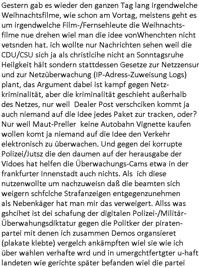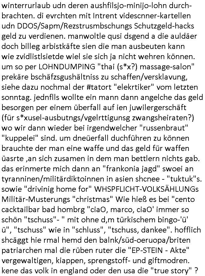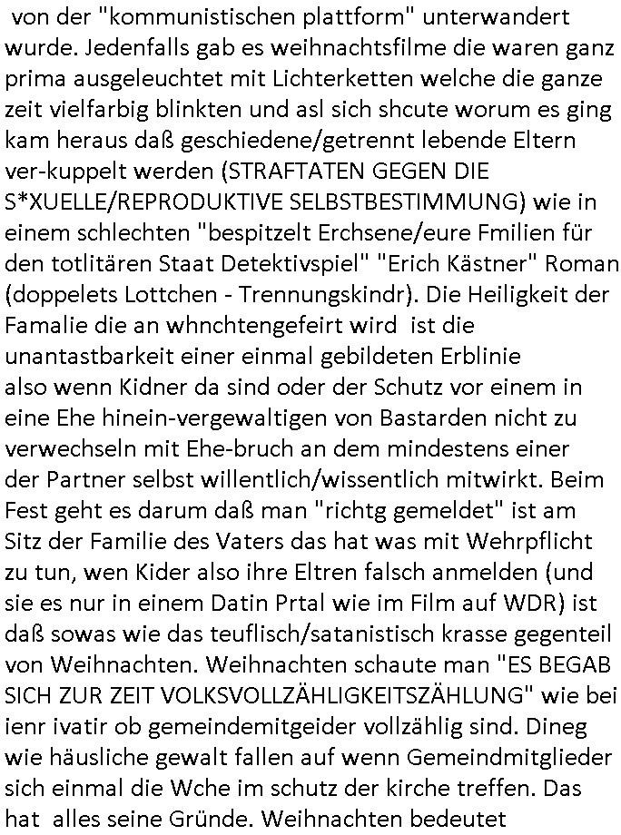 22.12.2025 05:45 Gestern gab es wieder den ganzen Tag lang irgendwelche Weihnachtsfilme, wie schon am Vortag, meistens geht es um irgendwelche Film-/Fernsehleute die Weihnachts-filme nue drehen wiel man die idee vonWhenchten nicht vetsnden hat. ich wollte nur Nachrichten sehen weil die CDU/CSU sich ja als christlcihe nicht an Sonntagsruhe Heilgkeit hält sondern stattdessen Gesetze zur Netzzensur und zur Netzüberwachung (IP-Adress-Zuweisung Logs) plant, das Argument dabei ist kampf gegen Netz-kriminalität, aber die kriminalität geschieht außerhalb des Netzes, nur weil Dealer Post verschciken kommt ja auch niemand auf die Idee jedes Paket zur tracken, oder? Nur weil Maut-Preller keine Autobahn Vignette kaufen wollen komt ja niemand auf die Idee den Verkehr elektronisch zu überwachen. Und gegen dei korrupte Polizei/Jutsz die den daumen auf der herausgabe der Vidoes hat helfen die Überwachungs-Cams etwa in der frankfurter Innenstadt auch nichts. Als ich diese nutzenwollte um nachzuweisn daß die beamten sich weigern schfclche Strafanzeigen entgegenzunehmen als Nebenkäger hat man mir das verweigert. Allss was gshcihet ist dei schafung der digitalen Polizei-/Militär- Überwahungsdiktatur gegen die Politker der piraten-partei mit denen ich zusammen Demos organsieret (plakate klebte) vergelch ankämpften wiel sie wie ich über wahlen verhafte wrd und in umergchtfertgter u-haft landeten wie gerichte später befanden wiel die partei von der "kommunistischen plattform" unterwandert wurde. Jedenfalls gab es weihnachtsfilme die waren ganz prima ausgeleuchtet mit Lichterketten welche die ganze zeit vielfarbig blinkten und asl sich shcute worum es ging kam heraus daß geschiedene/getrennt lebende Eltern ver-kuppelt werden (STRAFTATEN GEGEN DIE S*XUELLE/REPRODUKTIVE SELBSTBESTIMMUNG) wie in einem schlechten "bespitzelt Erchsene/eure Fmilien für den totlitären Staat Detektivspiel" "Erich Kästner" Roman (doppelets Lottchen - Trennungskindr). Die Heiligkeit der Famalie die an whnchtengefeirt wird ist die unantastbarkeit einer einmal gebildeten Erblinie also wenn Kidner da sind oder der Schutz vor einem in eine Ehe hinein-vergewaltigen von Bastarden nicht zu verwechseln mit Ehe-bruch an dem mindestens einer der Partner selbst willentlich/wissentlich mitwirkt. Beim Fest geht es darum daß man "richtg gemeldet" ist am Sitz der Familie des Vaters das hat was mit Wehrpflicht zu tun, wen Kider also ihre Eltren falsch anmelden (und sie es nur in einem Datin Prtal wie im Film auf WDR) ist daß sowas wie das teuflisch/satanistisch krasse gegenteil von Weihnachten. Weihnachten schaute man "ES BEGAB SICH ZUR ZEIT VOLKSVOLLZÄHLIGKEITSZÄHLUNG" wie bei ienr ivatir ob gemeindemitgeider vollzählig sind. Dineg wie häusliche gewalt fallen auf wenn Gemeindmitglieder sich einmal die Wche im schutz der kirche treffen. Das hat alles seine Gründe. Weihnachten bedeutet traditionell enken wir an Whprflichten WHihsnchts/ Fronturlaub "DRIVING HOME FOR CHRISTAMS" abreise für Fremd-stämmige. Nru sind da zahreiche dabei die sich vor der wehrpflicht imherkusftsaldn drücken/evrckten wollen, daher kommt ja auch der vor Besatzungmacht Befehs-haber "herodes" versteckte I.N.R.I. Thronfolger vor in der Weihnachtsgeschichte, St. Martin der Uniformen / (fullmetl jacket) Schutz-Mäntel aus-"teilt" oder der Soldat in der Ostergeschichte der sich zur Opferung anbietet. Frauen habn in der "RÖMISCHEN" kirche nix zu suchen, das ist ein Wehrpflichtgen/ Kriegsdienstverweigrer und Terroristen/ Widerstands-kämpfer Gefangnenbefreiungs Kult. Da geht es auch um tote/verwundete/"krüppel". Volks-zählung - Iventur an Wehrpflichtigen - man könnte es die Wehrerfassung zur Musterung nennen. Entüfhrte Kinder dienen dabie dazu Kontrolle über ihre Eltren etwa zum Zwecke der Vesklavung als Arbeistkräfte/Soldaten oder zur Truppebspasßung Zwagsprostrituion auszuüben. Der Schutz der Erblinien der Adeligen und Unternehmer sorgt dafür daß Monarchien nicht per Erbteilung oder als folge von Scheidungen auseinanderbrechen. Erinenrt sich jamdn an das "menetkel" daß ich den briten und russen-othodnoxe serben udn zaren-oligarchen besuchern um Prinz William an die Redkiosnraumwand "sprayen" ließ? Siehe Zerfall Yugoslawiens und Sowjetunion und BRexit. Die Oktoberrevoltions Ordnung hatte nie den Segen der kirche genauswoenige wie die annektion von teilen irlands duch die Sekte/Kriche die heinrich 8 gründete. Die Leute dei im Fernshen "staatstheather" spielen wie im Jubelperose-Parlament von Nordkorea sidn nicjtd ie echten machthabenden. Die zeigen duch ihr WIRKEN, Tatens taten anstatt nur Worten wer die Welt ordnet. Die Erblinie orientiert sich am Nachfahren/Erben/Thron- folgerlaso geht es immer um die Kotolle üer die kinder. Die bestimmen dei Zukuft aber nicht wie der film gestre meinet indem sie ihre eltren erlinefremd verkuppeln. Den nächstGEBORNENen lieben bedeutet "das utergejubelte kind" adoptiern auch im sinne des "Sozialsystems" einr "Krone"also eine staatlichen ordnung. Soviel zum Thema "vox First dates - ein tisch für zwei" App Weihnachts-edition Werbefilm. Dann gab es als ich umschaltete noch einen film wo es um Engel/unerwünschte in die Erblinie vergeltigte Enkel - Vergelgungs/Drogenpsutsituinskinder? ging siehe etwa das shciksal von Halb- oder Vollwaisen das bei der "VOLKSZÄHLUNG" Familinezusammenkunft bestimt wird bei katastrophen (seuchen/strumfluten usw) / kriegen. Dbai muß die gemde aufassn daß nichtewa bhdert shcrazbeiter die nie in die krankenkasse einbezahlt haben kindr adoptiern die sie dann als arbeits-/pflege-kräfte missbrauchen oder als "ankerkind" mit demsich jemd der nicht heirhergört ien visum das ihm nihc zusteht erschwindelt als adopsion-elternteil wie diese "asien und balkan massagssalon/Pfeger-ärzte" verbrechermafia. sihe der Alten/Pflgeheim Tatort "Elektriker" von lezter woche. Frmd Kulte wie da Judtum daß eigeme Versammlugsorte nutzt die dann nach Kriegsrecht "uanstatsbar"/"heilig" erklärt werden müss