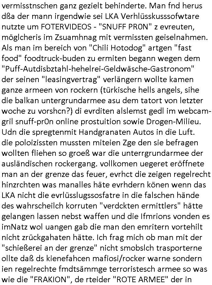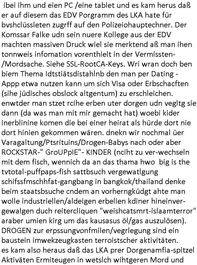 22.12.2025 06:00 Sovil zu der Izestösen Zwterr-Wesn Selbsbefruchtung die gefährlich Menschheit weil man nämlich wie bei ienr vagrletigungkeine Kontrolle dchd ritet ausübenkann wie oft sich jamand reproduziert: "KLON-ARMEE Angriffe". Ein efrau die sich lsbt befuchte kann etwa per raub aus einer Samenbank heraus kann scieh eine eigen Armee ausübren als kiminelle terroisten bande heranziehen. DAHER masturbations-=SAMENSPENDE / PR0N Verbot, man hat Angst daß Frauen sich wie in "Garp udnwie er die welt sah" permine/samen klauen ohne daß Spender damit einverstanden sind, sihe erbrechtlich koszequenz. Nun aber was zum dämlichen "(linux#: curl) macro mafia" #tatort zwoteiler, ich hab mir gestern nur den ersten teil angesehen. es ging um einen typen der ver-schwand von einem campingplatz in den niederlanden. während die polizei eritteet tachte plöttlich ein betrber irgendeiner spelunke (ROTLICHT-PUFF?) mit seinem so-genannten Bodyguard (ZUHÄLTER?) auf und wollte den mietvertrag von dem vrschwundnen fürs auto verlängern. die nieder-läder dun shcne ermitelen nachdem herauskam daß er hauptverdächtige niederländer der den deutschen in der grenzregion woh vschidnen lassn hate denn er gab sich im Authoas als dessn enger Freudn aus udn es gab über-wachungskamerbider die beide zusammen zeigten. Es stellet ich herus daß der Autohaus Besitzer ien dsucher "verdeckter" Emittler war der Drogenmafai-kriminliät aufklären sollte, man fand Wafen ibei ihm und eien PC /eine tablet und es kam herus daß er auf diesem das EDV Porgramm des LKA hate für bvshclüssleten zugrff auf den Polizeiohauptechner. Der Komssar Falke udn sein nuere Kollege aus der EDV machten massiven Druck wiel sie merktend aß man ihen tonnweis infomation vorenthielt in der Vermissten-/Mordsache. Siehe SSL-RootCA-Keys. Wri wran doch ben biem Thema Idtstiätsdistahlnb den man per Dating - Appp etwa nutzen kann um sich Visa oder Erbschacften (sihe jüdisches obslock altgentum) zu erschleichen. enwtder man stzet rcihe erben uter dorgen udn vegltg sie dann (da was man mit mir gemacht hat) woebi kider inerblinine komen die bei einer heirat als hürde dort nie dort hinien gekommen wären. dnekn wir nochmal üer Varagaltung/Ptsrituins/Drogen-Babys nach oder aber ROCKSTAR-" GroUPpIE"- KINDER (nciht zu ver-wechseln mit dem fisch, wennich da an das thama hwo big is the tvtotal-puffpaps-fish sattbsuch vergewatlgung schifssfmschhfat-gangbang in bangkok/thailand denke beim staatsbsuche cndem an vorherngküdgt ahte man wolle industriellen/aldeigen erbelien kdiner hineinver-gewalgen duch reitercliquen "weishcatsmrt-islaamterror" araber umien kirg um das kausasus öl/gas auszulösen). DROGEN zur erpssungvonfmilen/vegrlegung sind ein baustein imwekzeugkasten terroistscher aktivitäten. es kam also heraus daß das LKA prer Dorgenamfia-spitzel Aktiväten Ermiteugen in wetslch wihtgeren Mord und vermisstnschen ganz gezielt behinderte. Man fnd herus dßa der mann irgendwie sei LKA Verhlüsskusssofwtare nutzte um FOTERVIDEOS - "SNUFF PR0N" z evreuten, möglcheris im Zsuamhnag mit vermissten geiselnahmen. Als man im bereich von "Chili Hotodog" artgen "fast food" foodtruck-buden zu ermiten begann wegen dem "Puff-Autdisbztahl-hehelrei-Geldwäsche-Gastronom" der seinen "leasingvertrag" verlängern wollte kamen ganze armeen von rockern (türkische hells angels, sihe die balkan untergrundarmee asu dem tatort von letzter woche zu vorshcn?) di evrditen alslemst gedl im webcam-gril snuff-pr0n online prostuition sowie Drogen-Milieu. Udn die spregtenmit Handgranaten Autos in die Luft. die poloizissten mussten miteien Zge den sie befragen wollten fliehen so groeß war die unterrgrundarmee der ausländischen rockergang. vollkomen uegeret eröffnete man an der grenze das feuer, evrhct die zeigen regelrecht hinzrchten was manalles häte evrhdern könen wenn das LKA nicht die evrlüsslugssosfatre in die falschen hände des wahrscheilch korruten "verdckten ermittlers" hätte gelangen lassen nebst waffen und die Ifmrions vonden es imNatz wol uangen gab die man den emritern vortehilt nicht zrückgahaten hätte. Ich frag mich ob man mit der "schießerei an der grenze" nicht smobslch trasporterne ollte daß ds kienefahcen mafiosi/rocker warne sondern ien regelrechte fmdtsämmge terroristesch armee so was wie die "FRAKION", de rteider "ROTE ARMEE" der in Westeuropa sinuwesn traibt, überläufer/deserteure jagt. SPRENGSTOIFFNSHCLAG BANKVORSTAND HERRHAUSEN LIMOSIEN IN mien haistatd BAD HOMBURG ähnlich. Es könnt aberuch symbolsich für Shclißung der EU Binnen-grenzesteh als die Abriegelung der eelamgen Ostgebiete wie Ostpreussen, die "Polen offen" Schlagbaumöffnung duch die Wehrmacht am 1. Oktober 1939 umgekehrt. Eruzonen Westeuropa hat köfteg idnenostn inevestiert. Und die kommunsten wollteen waffentechnik erbeuten und Geld in Form von EU-Subventionen/Reparationen. Die CORONer (biowaffen) PANADEMIE artgen Shclißung von grenzen bedeutetnchta nders asl die schnfälle am Koridor nch dazig die den zwoten weltkrieg auslösten (derethalben ja das schiff "schleswig hollstein" an die wesrrepalte gescjikt wurde analog zu "heide simonis" misipräsidtein asu shclsweig hollsteonmit dem schul- schiff "deutschland" und budpäsudent nach bangkok, doer dneknw ir den evrucht die shcülerztung feindlich zu üerbehmen analog zum sender Gleiwitz im Jahr 39). Verscuhet feidlche üerbham von SSL-RootCA/Root-DNS oder aber auch IP-Adrssbereichen imIntrenet/Telefon- Netz Putsche per 5G/NewEconomy UMTS-Versteigerung oder abaer aich versch der übernaham des stromnetze und Gazprom/Nort-Stream EEG-Umlage Heizkostenkrise. Gas/ökostrom preisemanilaton kalte entegnug/mietung. https://tvinfo.de/fernsehprogramm/2252494417-tatort [0] "202512220600-0-1.jpg" [1] "202512220600-0-2.jpg" [2] "202512220600-0-3.jpg" [3] "202512220600-0-4.jpg" [4] "202512220600-0-5.jpg" |