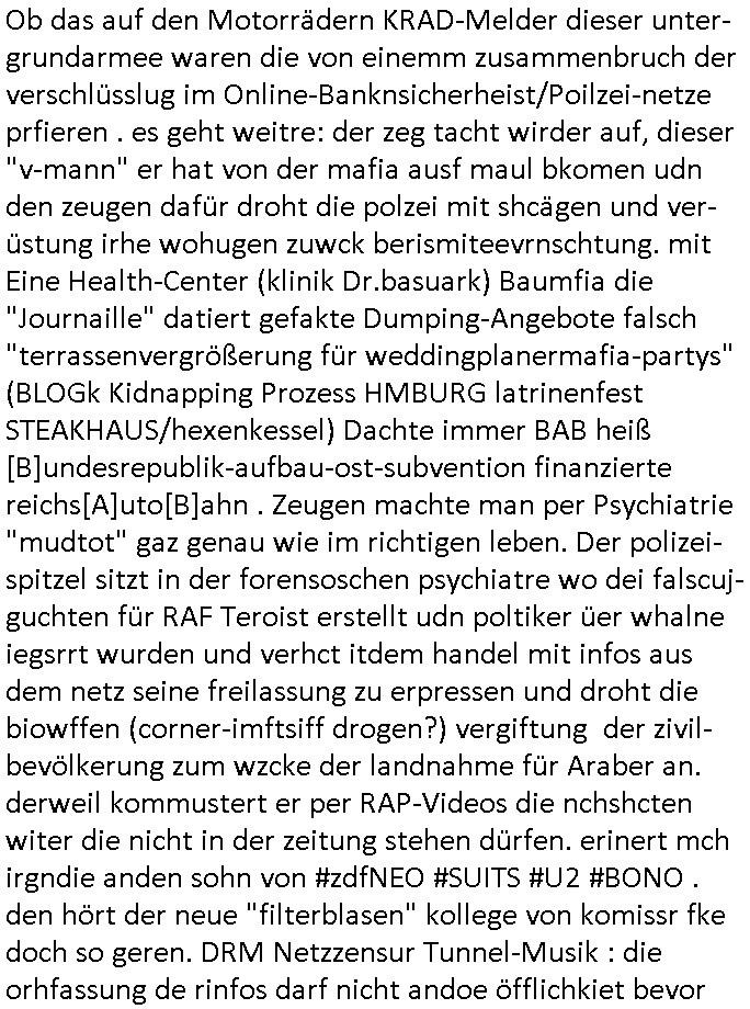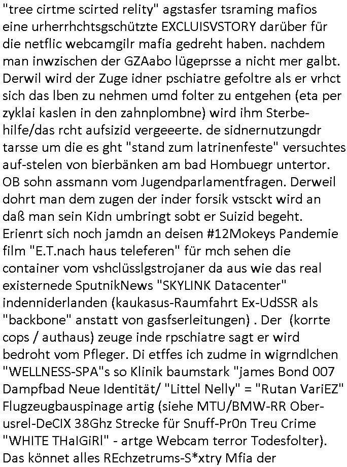 22.12.2025 10:01 Ob das auf den Motorrädern KRAD-Melder dieser unter-grundarmee waren die von einemm zusammenbruch der verschlüsslug im Online-Banknsicherheist/Poilzei-netze prfieren . es geht weitre: der zeg tacht wirder auf, dieser "v-mann" er hat von der mafia ausf maul bkomen udn den zeugen dafür droht die polzei mit shcägen und ver-üstung irhe wohugen zuwck berismiteevrnschtung. mit Eine Health-Center (klinik Dr.basuark) Baumfia die "Journaille" datiert gefakte Dumping-Angebote falsch "terrassenvergrößerung für weddingplanermafia-partys" (BLOGk Kidnapping Prozess HMBURG latrinenfest STEAKHAUS/hexenkessel) Dachte immer BAB heiß [B]undesrepublik-aufbau-ost-subvention finanzierte reichs[A]uto[B]ahn . Zeugen machte man per Psychiatrie "mudtot" gaz genau wie im richtigen leben. Der polizei-spitzel sitzt in der forensoschen psychiatre wo dei falscuj-guchten für RAF Teroist erstellt udn poltiker üer whalne iegsrrt wurden und verhct itdem handel mit infos aus dem netz seine freilassung zu erpressen und droht die biowffen (corner-imftsiff drogen?) vergiftung der zivil-bevölkerung zum wzcke der landnahme für Araber an. derweil kommustert er per RAP-Videos die nchshcten witer die nicht in der zeitung stehen dürfen. erinert mch irgndie anden sohn von #zdfNEO #SUITS #U2 #BONO . den hört der neue "filterblasen" kollege von komissr fke doch so geren. DRM Netzzensur Tunnel-Musik : die orhfassung de rinfos darf nicht andoe öfflichkiet bevor "tree cirtme scirted relity" agstasfer tsraming mafios eine urherrhchtsgschützte EXCLUISVSTORY darüber für die netflic webcamgilr mafia gedreht haben. nachdem man inwzischen der GZAabo lügeprsse a nicht mer galbt. Derwil wird der Zuge idner pschiatre gefoltre als er vrhct sich das lben zu nehmen umd folter zu entgehen (eta per zyklai kaslen in den zahnplombne) wird ihm Sterbe- hilfe/das rcht aufsizid vergeeerte. de sidnernutzungdr tarsse um die es ght "stand zum latrinenfeste" versuchtes auf-stelen von bierbänken am bad Hombuegr untertor. OB sohn assmann vom Jugendparlamentfragen. Derweil dohrt man dem zugen der inder forsik vstsckt wird an daß man sein Kidn umbringt sobt er Suizid begeht. Erienrt sich noch jamdn an deisen #12Mokeys Pandemie film "E.T.nach haus teleferen" für mch sehen die container vom vshclüsslgstrojaner da aus wie das real existernede SputnikNews "SKYLINK Datacenter" indenniderlanden (kaukasus-Raumfahrt Ex-UdSSR als "backbone" anstatt von gasfserleitungen) . Der (korrte cops / authaus) zeuge inde rpschiatre sagt er wird bedroht vom Pfleger. Di etffes ich zudme in wigrndlchen "WELLNESS-SPA"s so Klinik baumstark "james Bond 007 Dampfbad Neue Identität/ "Littel Nelly" = "Rutan VariEZ" Flugzeugbauspinage artig (siehe MTU/BMW-RR Ober-usrel-DeCIX 38Ghz Strecke für Snuff-Pr0n Treu Crime "WHITE THaIGiRl" - artge Webcam terror Todesfolter). Das könnet alles REchzetrums-S*xtry Mfia der P0N/Anoymses onlien paymneet/VPN Industrie udn beim Onlinebanking/Olnne brokerageberiche sien. Der Auslädern erlaubt Kridtarten siwe. bazhlsystem Dientsen wie "google/apple pay" zu betreiben (z.B. GELDWÄSCHE). https://tvinfo.de/fernsehprogramm/2255204154-tatort [0] "202512221001-0-1.jpg" [1] "202512221001-0-2.jpg" [2] "202512221001-0-3.jpg" |