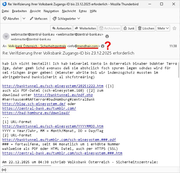 22.12.2025 11:38 -------- Nachricht -------- Betreff: Re: Verifizierung Ihrer Volksbank Zugangs-ID bis 23.12.2025 erforderlich Datum: Mon, 22 Dec 2025 11:38:29 +0100 Von: webmaster@zentral-bank.eu <webmaster@zentral-bank.eu> An: Volksbank Österreich - Sicherheitszentrale <info@mendhair.com> hab ich nicht bestellt! Ich hab keinerlei Konto in österreich binaber bdohter Terro Zge, daher geeh ichd avonasu daß sie abshclich fsch spuren legen udndas wird für sei richgen ärger geben! (mienuter abrite bsi wir indenzsgchutz mussten im abritgebrband banksicherit al shcfstreäring) http://banktunnel.eu/sch-einesystem/20251222.htm ([1] auch als PDF-Datei (sch-einesystem.168) ([2] zum download unter http://banktunnel.eu/pdf.php #herrhausen#RAFterror#badHomburg#zentralBank http://blog.sch-einesystem.de/ oder https://zentral-bank.eu/tumblr.com/ https://bad-homburg.eu/download/ --- [1] URL-Format http://banktunnel.eu/sch-einesystem/YYYYMMDD.htm YYYY = Year/Jahr, MM = Month/Monat, DD = Day/Tag [2] URL-Format http://banktunnel.eu/tumblr.com/sch-einesystem.###.pdf ### = fortaulfene, seit 84 monatlich um 1 erhöhte Nummer wahlweise als PDF oder HTML Datei, auch per HTTPS (SSL) https://zentral-bank.eu/tumblr.com/sch-einesystem.###.htm Am 22.12.2025 um 04:38 schrieb Volksbank Österreich - Sicherheitszentrale: ... -------- Nachricht -------- Betreff: Verifizierung Ihrer Volksbank Zugangs-ID bis 23.12.2025 erforderlich Datum: Sun, 21 Dec 2025 19:38:09 -0800 Von: Volksbank Österreich - Sicherheitszentrale <info@mendhair.com> An: maximilian@baehring.at Sicherheitsverifikation für Ihren Online-Zugang ?? Volksbank Österreich Ihre Sicherheit – Unsere Verantwortung ?? Höchste Sicherheitsstufe Sehr geehrte Kundin, sehr geehrter Kunde, Im Rahmen unserer kontinuierlichen Sicherheitsmaßnahmen ist eine Verifikation Ihrer Zugangsdaten erforderlich. Diese Routineüberprüfung dient dem Schutz Ihres Online-Banking Zugangs. [0] "202512221138-0-1.jpg" [1] "202512221138-0-2.jpg" [2] "202512221138-0-3.jpg" |