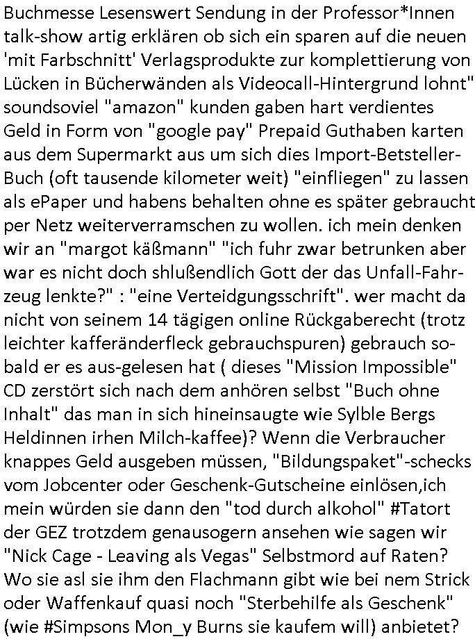 28.12.2025 07:00 Wie die eine im #Tatort erklärt hat wie sie in neue Rollen-bilder schlüpft (so ähnlich wie man inGame-Cam Puppen- spiel Computer Avatare [/per MoCap?] bewegt) während die andere sich Russenbräutekatalog artig für das Kostüm begeistert (wie diese Leute dei sich an der Schaufenster-scheibe vorm vodafone Shop wegen dem neuen Handy die Nasen platt drücken in der Werbung, ähnlich als ginge es ums Gerangel wer per "gib Fernbedienung" den Kanal wählen darf auf der Famline-Couch / bestimmen welches hübsch verpackte Paket als nächstes kommt von amazon[-prime]) früher waren Zeitungen wie dei "hörzu" ja sowas wo man wie in nem Versandhauskatalog auswählte was man nachher im TV sah, heute ist das ja wohl teils so daß man am Smart-phone duch die angbote scrollt und sie per "wisCh"/click Geste "Raumschiff Enterpise" artig "auf den Schirm" beamt. Das ist heut ganz anders als noch zu den Zeiten wo Loriot mit seiner Mom "einen Stoff kaufen" geht da die haptische Erfahrung der Peanuts Kuscheldecke fehlt. Wenn man wissen will wie sich ein Textil so anfühlt indem man ihn zwischen daumen und zeigefinger bewegt wie bei dieser "was soll die Qulitäts-produktion denn kosten" vom Geldbündel abzähl Geste. Der vor dem buchkauf prüfende Blick auf den Klappentext mit begeisterten Zitaten von Promi-Kritiker Rezensenten: "da tausch ich den Jobcenter GEZ-Kohle Kultur - SCHeCK lieber ins netflix mediatheken - PayPerView so ner 3sat Buchmesse Lesenswert Sendung in der Professor*Innen talk-show artig erklären ob sich ein sparen auf die neuen 'mit Farbschnitt' Verlagsprodukte zur komplettierung von Lücken in Bücherwänden als Videocall-Hintergrund lohnt" soundsoviel "amazon" kunden gaben hart verdientes Geld in Form von "google pay" Prepaid Guthaben karten aus dem Supermarkt aus um sich dies Import-Betsteller-Buch (oft tausende kilometer weit) "einfliegen" zu lassen als ePaper und habens behalten ohne es später gebraucht per Netz weiterverramschen zu wollen. ich mein denken wir an "margot käßmann" "ich fuhr zwar betrunken aber war es nicht doch shlußendlich Gott der das Unfall-Fahr-zeug lenkte?" : "eine Verteidgungsschrift". wer macht da nicht von seinem 14 tägigen online Rückgaberecht (trotz leichter kafferänderfleck gebrauchspuren) gebrauch so-bald er es aus-gelesen hat ( dieses "Mission Impossible" CD zerstört sich nach dem anhören selbst "Buch ohne Inhalt" das man in sich hineinsaugte wie Sylble Bergs Heldinnen irhen Milch-kaffee)? Wenn die Verbraucher knappes Geld ausgeben müssen, "Bildungspaket"-schecks vom Jobcenter oder Geschenk-Gutscheine einlösen,ich mein würden sie dann den "tod durch alkohol" #Tatort der GEZ trotzdem genausogern ansehen wie sagen wir "Nick Cage - Leaving als Vegas" Selbstmord auf Raten? Wo sie asl sie ihm den Flachmann gibt wie bei nem Strick oder Waffenkauf quasi noch "Sterbehilfe als Geschenk" (wie #Simpsons Mon_y Burns sie kaufem will) anbietet? https://www.bild.de/unterhaltung/stars-und-leute/margot-kaessmann-ueber-berufung-und-familie-mein-leben-ist-ein-einziges-buntes-chaos-69404a5811416590a630c07e https://tvinfo.de/fernsehprogramm/2260871336-tatort https://www.bmas.de/DE/Arbeit/Grundsicherung-Buergergeld/Bildungspaket/bildungspaket.html https://www.amazon.de/b?ie=UTF8&node=92139969031 [0] "202512280700-0-1.jpg" [1] "202512280700-0-2.jpg" [2] "202512280700-0-3.jpg" |