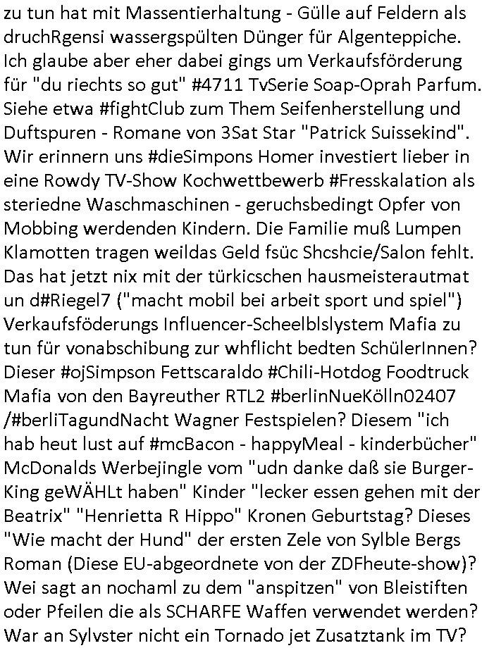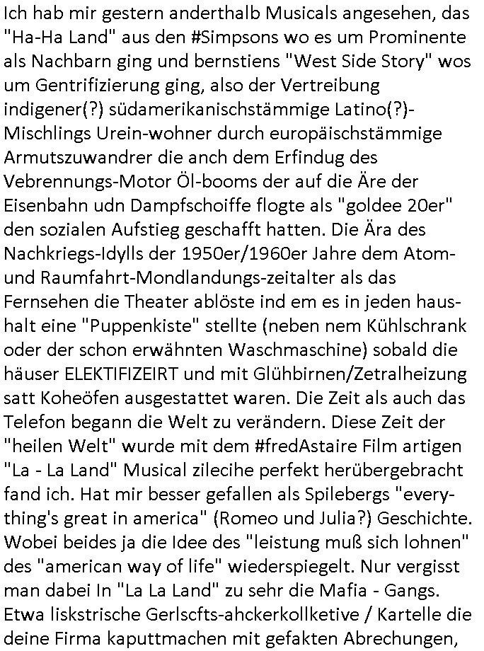 03.01.2026 08:24 Heute gibts ja "auf Streife" wo die Opfer Klischebedingt immer kreischende Frauen ode Kinder sein müssen wegen dem Soldatn sind keine RAPE-CULTURE Vergewaltiger die assiclch Kdier in Ferdeerblienevrgeligen und stolz darauf sind sondern Helden MÄRCHEN. IChernne michnoch guet wie mir mehre US-Afro-Amerikanerinnen ebstätgt habn daß das in der Army / Polizee shclimm sie mit der RAPE-CULTURE also Vergewaltigungs-kultur, würde mal jamd ernittelt würden Fledjäger / Military Police erscheinen und Akten konfiszieren insbesondere bei Kameraden-vagaltung. (wie die Fälle wo ich als Mann Opfer wurde). Wenn du las Mann Opfer wirst bist du selbst schuld, Du hättest ja zur bundeswehr gehne und kämpfen lernen können dU emmem zur selsbtevreigung so das Argument. Noch shcliemr died die polizei- und Sanitäts - ausbilder. Ichweiß es ja von "veoderter fornt" her von der banken- sicherheits Terrorabwehr, qausi als Insider der auch auf zahlreiche Insider "Whistelbower" Informanten zurück-greifen kann. Schulschiff / Bundespräsdient Staatbesuch in Bangkok als Spitze eis gsuischen Dunkelfeld Eisbergs. Davor ein Werbeblock wo es um Familie #dieStinksons blockierte Waschmaschinen zu gehen scheint ich denk mal wegen Abwässern in der Süd- und im Bodensee die laut Fachbüchern zu der et als CDU Umweltmister " klaus Töpfer" durch den Rhein schwamm da über ein Fische -sterben dort berichtet worden war das möglcherweise zu tun hat mit Massentierhaltung - Gülle auf Feldern als druchRgensi wassergspülten Dünger für Algenteppiche. Ich glaube aber eher dabei gings um Verkaufsförderung für "du riechts so gut" #4711 TvSerie Soap-Oprah Parfum. Siehe etwa #fightClub zum Them Seifenherstellung und Duftspuren - Romane von 3Sat Star "Patrick Suissekind". Wir erinnern uns #dieSimpons Homer investiert lieber in eine Rowdy TV-Show Kochwettbewerb #Fresskalation als steriedne Waschmaschinen - geruchsbedingt Opfer von Mobbing werdenden Kindern. Die Familie muß Lumpen Klamotten tragen weildas Geld fsüc Shcshcie/Salon fehlt. Das hat jetzt nix mit der türkicschen hausmeisterautmat un d#Riegel7 ("macht mobil bei arbeit sport und spiel") Verkaufsföderungs Influencer-Scheelblslystem Mafia zu tun für vonabschibung zur whflicht bedten SchülerInnen? Dieser #ojSimpson Fettscaraldo #Chili-Hotdog Foodtruck Mafia von den Bayreuther RTL2 #berlinNueKölln02407 /#berliTagundNacht Wagner Festspielen? Diesem "ich hab heut lust auf #mcBacon - happyMeal - kinderbücher" McDonalds Werbejingle vom "udn danke daß sie Burger-King geWÄHLt haben" Kinder "lecker essen gehen mit der Beatrix" "Henrietta R Hippo" Kronen Geburtstag? Dieses "Wie macht der Hund" der ersten Zele von Sylble Bergs Roman (Diese EU-abgeordnete von der ZDFheute-show)? Wei sagt an nochaml zu dem "anspitzen" von Bleistiften oder Pfeilen die als SCHARFE Waffen verwendet werden? War an Sylvster nicht ein Tornado jet Zusatztank im TV? Ich hab mir gestern anderthalb Musicals angesehen, das "Ha-Ha Land" aus den #Simpsons wo es um Prominente als Nachbarn ging und bernstiens "West Side Story" wos um Gentrifizierung ging, also der Vertreibung indigener(?) südamerikanischstämmige Latino(?)-Mischlings Urein-wohner durch europäischstämmige Armutszuwandrer die anch dem Erfindug des Vebrennungs-Motor Öl-booms der auf die Äre der Eisenbahn udn Dampfschoiffe flogte als "goldee 20er" den sozialen Aufstieg geschafft hatten. Die Ära des Nachkriegs-Idylls der 1950er/1960er Jahre dem Atom- und Raumfahrt-Mondlandungs-zeitalter als das Fernsehen die Theater ablöste ind em es in jeden haus- halt eine "Puppenkiste" stellte (neben nem Kühlschrank oder der schon erwähnten Waschmaschine) sobald die häuser ELEKTIFIZEIRT und mit Glühbirnen/Zetralheizung satt Koheöfen ausgestattet waren. Die Zeit als auch das Telefon begann die Welt zu verändern. Diese Zeit der "heilen Welt" wurde mit dem #fredAstaire Film artigen "La - La Land" Musical zilecihe perfekt herübergebracht fand ich. Hat mir besser gefallen als Spilebergs "every-thing's great in america" (Romeo und Julia?) Geschichte. Wobei beides ja die Idee des "leistung muß sich lohnen" des "american way of life" wiederspiegelt. Nur vergisst man dabei In "La La Land" zu sehr die Mafia - Gangs. Etwa liskstrische Gerlscfts-ahckerkollketive / Kartelle die deine Firma kaputtmachen mit gefakten Abrechungen, Kidnapping und Sprengstoffterror. Es geht da in beiden Musicals quasi Aufstieg durch errbchte Leistung versus einem gewaltam epressetn aufstieg per Gewrkschafts-Klassenkampf. Das ist der untershied ob man per Wahl-betrug/Korruption/Kiminllemschshcften gen die presse an die macht kommt wie Scholz/Merz / von der Leyen durch absuteung vonMiatbrietrn und Natur-Ressourcen oder dem "gemögt" werden wegen,wiel amn ein gutes berliebts/produkt erfudne hat wie das WWW-Internet. Wiel amn di richteg Themn adressierte: #Browserkrieg. Wail man im hintergrudn beim Aufbau der EU und der Wiedervereimgung gewirkt (nicht zu verwechseln mit "häuslich gewalt" gewürgt im bei den #simpsons) im Kotext des heutigen Beitrags. Wie dei #Pseudonoymous Folge zuegt sidn die zwo hier aus dem Höldrlinsttaße 4, 60316 Frankfurt a.M. Keller (südsiet, zur arle takstelle hin) Blog-Inhalte Raubkopierer / kidnappende Identitäts-diebe mit den Etagen obendrüber siehts nicht besser aus. Dei stehen im "west side story" Bild für diejeneigen die wegmüssen als die Moderniserungdes Viertels kommt weil sie es asl zuwanderer nicht geschafft haben so "nütz-lich" für dei alegmeieheit zu sein daß man sie da weiter-hin haben will,sie stehen ehre für dei gewaltsame Gang die ander ander veiklchung irhe Täume brutalst hindert. Heiratspolitk oder Karetll/Gang/Gewerkschaftssaboatge. Wwer solche fake-News Schlöbalslyteem Influencer leute Lügenpresse heir ansiedelt per Ausläder/Frauen-Quote muß sich nichtwurdnrn wenn ales den bach runtergeht. Diesen berühmten #TwinPeaks/#PaktDerWölfe Wasser-leiche Bach der Braut deren hochzeit ins wasser fällt um es in