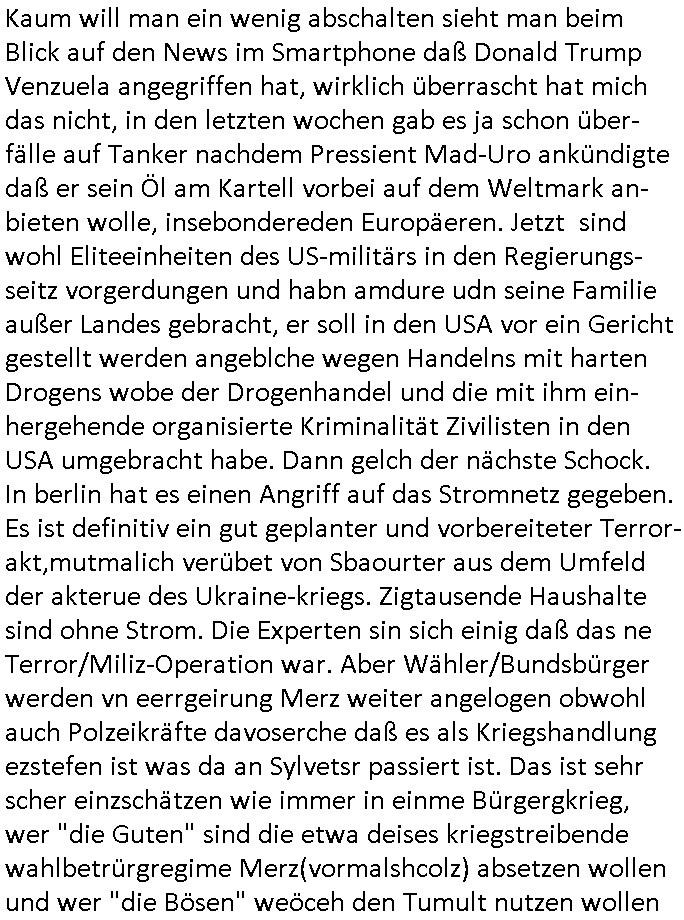 03.01.2026 17:30 Kaum will man ein wenig abschalten sieht man beim Blick auf den News im Smartphone daß Donald Trump Venzuela angegriffen hat, wirklich überrascht hat mich das nicht, in den letzten wochen gab es ja schon über-fälle auf Tanker nachdem Pressient Mad-Uro ankündigte daß er sein Öl am Kartell vorbei auf dem Weltmark an-bieten wolle, insebondereden Europäeren. Jetzt sind wohl Eliteeinheiten des US-militärs in den Regierungs- seitz vorgerdungen und habn amdure udn seine Familie außer Landes gebracht, er soll in den USA vor ein Gericht gestellt werden angeblche wegen Handelns mit harten Drogens wobe der Drogenhandel und die mit ihm ein- hergehende organisierte Kriminalität Zivilisten in den USA umgebracht habe. Dann gelch der nächste Schock. In berlin hat es einen Angriff auf das Stromnetz gegeben. Es ist definitiv ein gut geplanter und vorbereiteter Terror-akt,mutmalich verübet von Sbaourter aus dem Umfeld der akterue des Ukraine-kriegs. Zigtausende Haushalte sind ohne Strom. Die Experten sin sich einig daß das ne Terror/Miliz-Operation war. Aber Wähler/Bundsbürger werden vn eerrgeirung Merz weiter angelogen obwohl auch Polzeikräfte davoserche daß es als Kriegshandlung ezstefen ist was da an Sylvetsr passiert ist. Das ist sehr scher einzschätzen wie immer in einme Bürgergkrieg, wer "die Guten" sind die etwa deises kriegstreibende wahlbetrürgregime Merz(vormalshcolz) absetzen wollen und wer "die Bösen" weöceh den Tumult nutzen wollen um eine lksstsrsisch stalsisteh Rotarmisten-Terroristen Invasion odersowas in der Richtung durchzuführen, ich kann dei Angst der Venzuelansche Bevölkerung sehr gut nachvollziehen, suereldäer werdn zuspeilballder glaben Öl-Kartelle-Kriegs-Politik. Trump etwa hat bereist ganz offen den Chinesenumsie zuebsäftge angoten ihnen eien teil von Venezuelas/Maduros Öl der Kriegsbeute zu geben wenn sie sich auf seine von US-Inländischen Experten als Kriegsverbrecher eingeschätzen Seite schlagen, man sieht daß die Politik immer skrupelloser wird und üerbahupt nicht mehr zuksiernverushct daßes ihr um nichst als das ausplündern anderer Volksstämme geht. Das sind nicht Leute wie ich die sich aldsuche im für sie (nicht fürfrmd-stämmge) legitimen im Artikle 20 Absatz 4 Grundgesetz Abwehrkampf befinden. Das sind Möder/Plündrerhorden. VANdALEN, die Brandschatzen wie es im Mittealter hieß. Sihe 06. respetive 07. Oktober 2020 hier im Blog / Haus. https://www.bild.de/politik/ausland-und-internationales/trump-veroeffentlicht-aufnahme-das-erste-foto-der-geheim-mission-maduro-6959432ff6fc544dba9bb542 https://www.bild.de/politik/ausland-und-internationales/us-coup-in-venezuela-diktator-endlich-weg-aber-durfte-trump-das-6958f9e8441b06c4906d1d78 https://www.bild.de/politik/ausland-und-internationales/liveticker-zu-venezuela-militaerschlag-auf-caracas-6958d314f6fc544dba9baf2f https://www.bild.de/politik/ausland-und-internationales/prozess-gegen-maduro-geplant-drogen-anklage-in-new-york-69591c94cf4737ac6059ae15 https://www.bild.de/regional/berlin/stromausfall-in-berlin-stoerung-dauert-noch-bis-donnerstag-69592131666ac1993e7cc3f3 https://www.bild.de/news/stromanschlag-in-berlin-bekennerschreiben-bei-polizei-eingegangen-6959406bcf4737ac6059afec https://www.bild.de/news/inland/stromausfall-berlin-polizei-warnt-bevoelkerung-695930c6666ac1993e7cc501 [0] "202601031730-0-1.jpg" [1] "202601031730-0-2.jpg" [2] "202601031730-0-3.jpg" [3] "202601031730-0-4.jpg" |