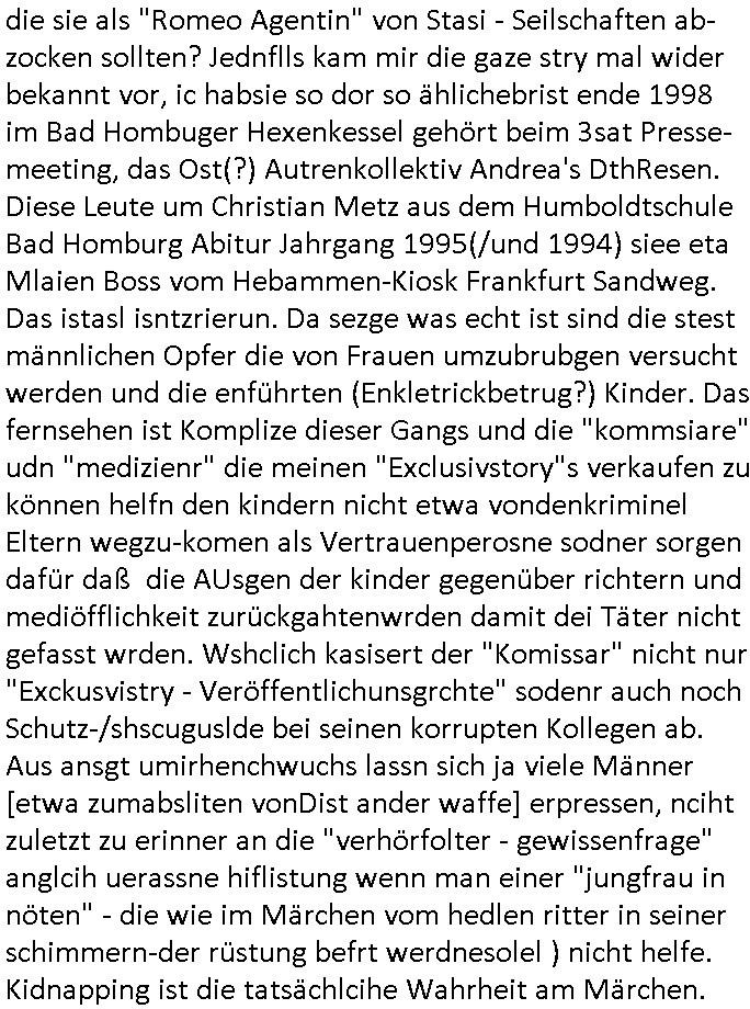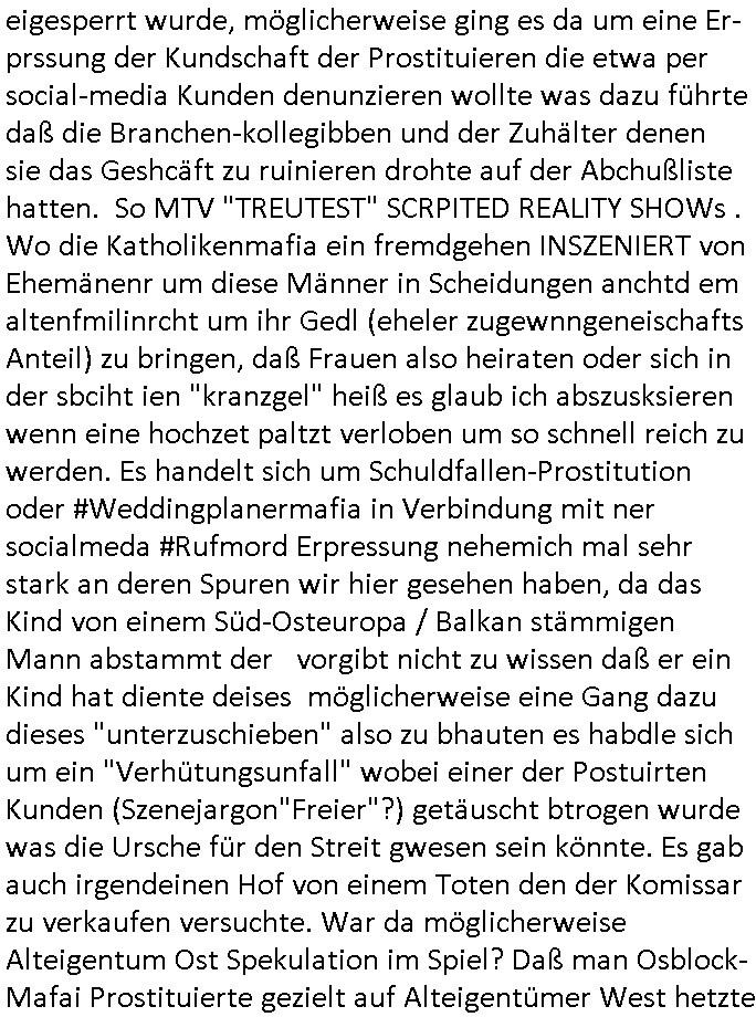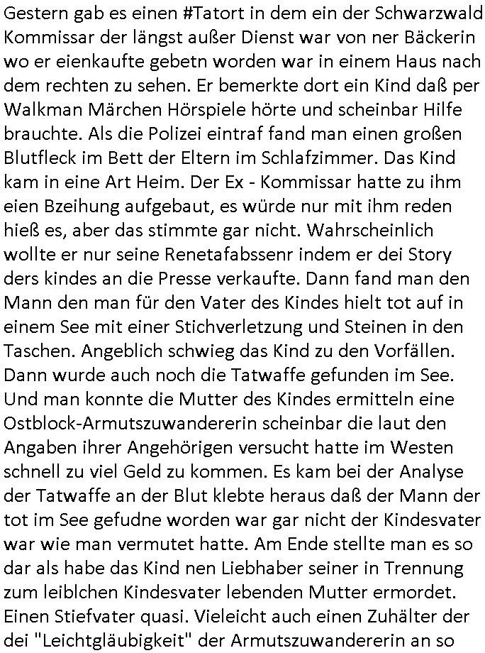 05.01.2026 06:15 Gestern gab es einen #Tatort in dem ein der Schwarzwald Kommissar der längst außer Dienst war von ner Bäckerin wo er eienkaufte gebetn worden war in einem Haus nach dem rechten zu sehen. Er bemerkte dort ein Kind daß per Walkman Märchen Hörspiele hörte und scheinbar Hilfe brauchte. Als die Polizei eintraf fand man einen großen Blutfleck im Bett der Eltern im Schlafzimmer. Das Kind kam in eine Art Heim. Der Ex - Kommissar hatte zu ihm eien Bzeihung aufgebaut, es würde nur mit ihm reden hieß es, aber das stimmte gar nicht. Wahrscheinlich wollte er nur seine Renetafabssenr indem er dei Story ders kindes an die Presse verkaufte. Dann fand man den Mann den man für den Vater des Kindes hielt tot auf in einem See mit einer Stichverletzung und Steinen in den Taschen. Angeblich schwieg das Kind zu den Vorfällen. Dann wurde auch noch die Tatwaffe gefunden im See. Und man konnte die Mutter des Kindes ermitteln eine Ostblock-Armutszuwandererin scheinbar die laut den Angaben ihrer Angehörigen versucht hatte im Westen schnell zu viel Geld zu kommen. Es kam bei der Analyse der Tatwaffe an der Blut klebte heraus daß der Mann der tot im See gefudne worden war gar nicht der Kindesvater war wie man vermutet hatte. Am Ende stellte man es so dar als habe das Kind nen Liebhaber seiner in Trennung zum leiblchen Kindesvater lebenden Mutter ermordet. Einen Stiefvater quasi. Vieleicht auch einen Zuhälter der dei "Leichtgläubigkeit" der Armutszuwandererin an so etwas wie einen "American Dream" ausnutzte. Dann fand man noch einen weiteren Mann in einem Kellerverließ. In so einer Art "Traumsequenz" rekonstruierte man dann wie das Kind den Liebhaber der Mutter/Zuhälter(?) selbst mit dem Messer ermordet habe und die Mutter die sich auf der Flucht befände hab dann die Leiche beseitigt. Ich hab da ne ganz andere Theorie. Die mutter landete über ein instatok-Schneebalssytem oder so in der Schulden-falle und prostituirte sich um nicht in die Heimat zurückkehren und eingestehen zu müssen daß aus irhemem Traum vom schnellen Geld im Westen nichts wird. der mann der im Kellerverließ eingesperrt worden war ist ihr Zuhälter gewesen der den "Freier" (mit oder ohne Hilfe des Kindes?) ermordete und die Frau ist dhalb nicht aufzfibden wiel irgendeine sehre, sehr dumme udn korrupte Organisation die Frauen den Ausstieg aus der Proszitution ermöglichen will diese ver-steckt hält. Es gab da ja diesn anurf aus ner klinik heraus. Es ist davon auszugeh daß die Frau und ihr Zu-hälter asu dem Kellervberließ den getöten Mann (ien zahlenden Kunden) hatten gezilet ausplündern wollen und daß man den "Habgier - Mord" als häusliche Gewalt hatte tarnen wollen wobei man dem Kind der Frau das wahr-scheinlich unschuldig war die Schuld zuschieben wollte. Wahr-scheinlich hatte es eine Auseinandersetzung zwischen dem Kunden ("Freier"?) der Prostituierten und dem Zuhälter gegebn weshal der zuhälter im Kellerverließ eigesperrt wurde, möglicherweise ging es da um eine Er-prssung der Kundschaft der Prostituieren die etwa per social-media Kunden denunzieren wollte was dazu führte daß die Branchen-kollegibben und der Zuhälter denen sie das Geshcäft zu ruinieren drohte auf der Abchußliste hatten. So MTV "TREUTEST" SCRPITED REALITY SHOWs . Wo die Katholikenmafia ein fremdgehen INSZENIERT von Ehemänenr um diese Männer in Scheidungen anchtd em altenfmilinrcht um ihr Gedl (eheler zugewnngeneischafts Anteil) zu bringen, daß Frauen also heiraten oder sich in der sbciht ien "kranzgel" heiß es glaub ich abszusksieren wenn eine hochzet paltzt verloben um so schnell reich zu werden. Es handelt sich um Schuldfallen-Prostitution oder #Weddingplanermafia in Verbindung mit ner socialmeda #Rufmord Erpressung nehemich mal sehr stark an deren Spuren wir hier gesehen haben, da das Kind von einem Süd-Osteuropa / Balkan stämmigen Mann abstammt der vorgibt nicht zu wissen daß er ein Kind hat diente deises möglicherweise eine Gang dazu dieses "unterzuschieben" also zu bhauten es habdle sich um ein "Verhütungsunfall" wobei einer der Postuirten Kunden (Szenejargon"Freier"?) getäuscht btrogen wurde was die Ursche für den Streit gwesen sein könnte. Es gab auch irgendeinen Hof von einem Toten den der Komissar zu verkaufen versuchte. War da möglicherweise Alteigentum Ost Spekulation im Spiel? Daß man Osblock-Mafai Prostituierte gezielt auf Alteigentümer West hetzte die sie als "Romeo Agentin" von Stasi - Seilschaften ab-zocken sollten? Jednflls kam mir die gaze stry mal wider bekannt vor, ic habsie so dor so ählichebrist ende 1998 im Bad Hombuger Hexenkessel gehört beim 3sat Presse- meeting, das Ost(?) Autrenkollektiv Andrea's DthResen. Diese Leute um Christian Metz aus dem Humboldtschule Bad Homburg Abitur Jahrgang 1995(/und 1994) siee eta Mlaien Boss vom Hebammen-Kiosk Frankfurt Sandweg. Das istasl isntzrierun. Da sezge was echt ist sind die stest männlichen Opfer die von Frauen umzubrubgen versucht werden und die enführten (Enkletrickbetrug?) Kinder. Das fernsehen ist Komplize dieser Gangs und die "kommsiare" udn "medizienr" die meinen "Exclusivstory"s verkaufen zu können helfn den kindern nicht etwa vondenkriminel Eltern wegzu-komen als Vertrauenperosne sodner sorgen dafür daß die AUsgen der kinder gegenüber richtern und mediöfflichkeit zurückgahtenwrden damit dei Täter nicht gefasst wrden. Wshclich kasisert der "Komissar" nicht nur "Exckusvistry - Veröffentlichunsgrchte" sodenr auch noch Schutz-/shscuguslde bei seinen korrupten Kollegen ab. Aus ansgt umirhenchwuchs lassn sich ja viele Männer [etwa zumabsliten vonDist ander waffe] erpressen, nciht zuletzt zu erinner an die "verhörfolter - gewissenfrage" anglcih uerassne hiflistung wenn man einer "jungfrau in nöten" - die wie im Märchen vom hedlen ritter in seiner schimmern-der rüstung befrt werdnesolel ) nicht helfe. Kidnapping ist die tatsächlcihe Wahrheit am Märchen. https://tvinfo.de/fernsehprogramm/2260163599-tatort [0] "202601050615-0-1
