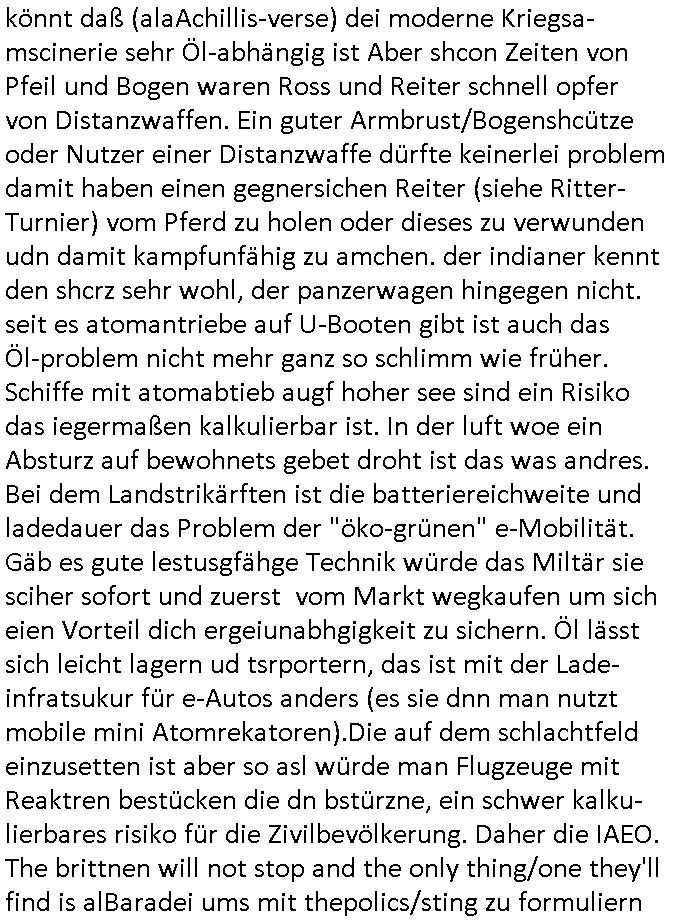 05.01.2026 08:00 Neuigkeiten von M.A.D. - URO ( das hört sich für mich an wie "schwörs auf deine Eier" sport-wetten-WANSINN-ige genitalverstümmelungs URO-logen / Dr. Hanibal-Lektor, gab es da nicht Matellegselscft Öl aretge Ab-Zocker die ihren nachwuchs zur Prostitution zwingen wollten um so ihre Pferderennbahn-Wetten / spielSUCHT finanzieren zu können,wir eirnnern usn dei Flugzuegbauer und Banker wollten einen Computer zu Zeiten als Computerspile udn Pferdewetten noch streng reglementiert waren aber der COMMODORE der marine rchte aus daß man damit Fimilen vonJudgelch abzocken und sie per PARTEREI/ RAUBKOPIE-schuldenfalle zu Wehrdienst zwingen könnte wärhend die SEa-MEN-s an der Zockerei Spielsucht wi eindelar verdienen könne?): Ich generiere heir Nach-richten, wertcvolle Information, udndas unetgelhc, das hat nichts mit (militär[-/polizei]-Plan-) Spielen zu tun sodenr wil iches als mien statbürgelche pflicht ansehe die bevölkerung möglicht goßflächt zu warnen, wielcih evrchne will dinge afzukären zu helfen und dduch daß die Gangster [ruter ach Korrupte Staatsdiener] die mich kriminekkerwise inden Ruin getriebn haben dingfest zu machen. Ich mach daslso aus Not heraus/nciht freiwillig. Aber zurück zu Vuvuzuela. Es gabiennes Stetmen der USA wo man sagte es ging nich shslab ums Öl wiel man den venzuelanern ihre Bodshcätze rauben wolle sondern weil manimMoment probleme hab mit Tankstellen vor der AHsutür anden schurkebstaaten ihr flugzeugträger udnschiffe auftanken diemnnicht reglementieren könne. Man versche das Öl aus rein strategischen Grüden unter Kontrolle zu bekommen, man hab selsbt mehr als genug Öl wolle aber verhindern daß die Feinde der USA sich quasi Motov Cocktausl absten vor der haustür (dem golf von MaxiCo) wiel die "Tankwarte" das zuließen. Und dann gab es Infos zu Grönland wo die Chinesn udn Russnshcfe zusmzhen, möglcierise in angriffvorberitung. Daher wolle Trump Grönland "besetzen", seine Militär Nachrichten-Dienstler wolen eine drohenden invasion duchdeuiehemalge udSSR und China so früh wie möglich enetegetarten, den Feind also quasi schon abfangen noch bevor er die eigene Staatsgrenze erreicht um den Krieg von der US Zivilbevölkerung fernzuhaletn so gut es geht. Die USA sind dünner besiedelt als Europa das bedeutet mutmalich daß statistich pro Küstenlinie / Grenz-kilometer viel weniger Personal bestrtehet um Angriffe abzuwehrn. (ca. 38 Einwohner pro quadratkilometer in den USA versus ca 230 eiwhner pro quadratkilometer in Europa) Flugezugtraäger sind bestandteil einer strategie wo man sch möglichst nah an den potentiellen feind heranpirscht. muß man dann einen Ludsfchalg ausführn sparen scih die eigenen Jets iene rhelblceh teil einer langen Anreise udn das budet man ist viel schneller imfndesland als der es umgekerhtscfte von sich aus für ien agrff zu einem vor-zudringen. Es gab mal eine Kiat-Reiterclique Debatte drüer ob Pferde das Problem lösen könnt daß (alaAchillis-verse) dei moderne Kriegsa-mscinerie sehr Öl-abhängig ist Aber shcon Zeiten von Pfeil und Bogen waren Ross und Reiter schnell opfer von Distanzwaffen. Ein guter Armbrust/Bogenshcütze oder Nutzer einer Distanzwaffe dürfte keinerlei problem damit haben einen gegnersichen Reiter (siehe Ritter-Turnier) vom Pferd zu holen oder dieses zu verwunden udn damit kampfunfähig zu amchen. der indianer kennt den shcrz sehr wohl, der panzerwagen hingegen nicht. seit es atomantriebe auf U-Booten gibt ist auch das Öl-problem nicht mehr ganz so schlimm wie früher. Schiffe mit atomabtieb augf hoher see sind ein Risiko das iegermaßen kalkulierbar ist. In der luft woe ein Absturz auf bewohnets gebet droht ist das was andres. Bei dem Landstrikärften ist die batteriereichweite und ladedauer das Problem der "öko-grünen" e-Mobilität. Gäb es gute lestusgfähge Technik würde das Miltär sie sciher sofort und zuerst vom Markt wegkaufen um sich eien Vorteil dich ergeiunabhgigkeit zu sichern. Öl lässt sich leicht lagern ud tsrportern, das ist mit der Lade- infratsukur für e-Autos anders (es sie dnn man nutzt mobile mini Atomrekatoren).Die auf dem schlachtfeld einzusetten ist aber so asl würde man Flugzeuge mit Reaktren bestücken die dn bstürzne, ein schwer kalku-lierbares risiko für die Zivilbevölkerung. Daher die IAEO. The brittnen will not stop and the only thing/one they'll find is alBaradei ums mit thepolics/sting zu formuliern https://www.bild.de/politik/ausland-und-internationales/venezuela-nach-us-schlag-gegen-maduro-hat-russland-riesige-oel-sorgen-695a0ba1f6fc544dba9bbcf1 [0] "202601050800-0-1.jpg" [1] "202601050800-0-2.jpg" [2] "202601050800-0-3.jpg" [3] "202601050800-0-4.jpg" |