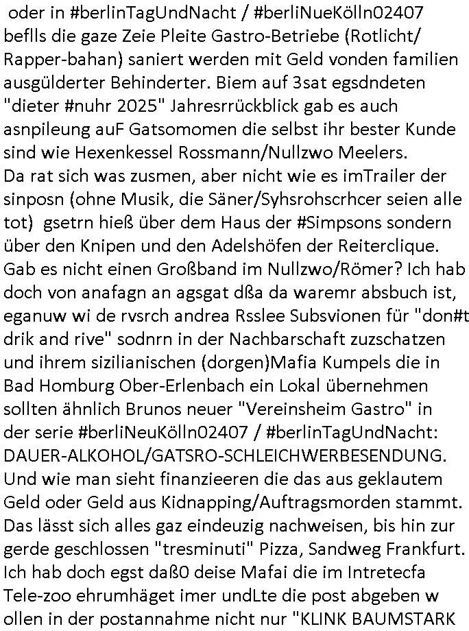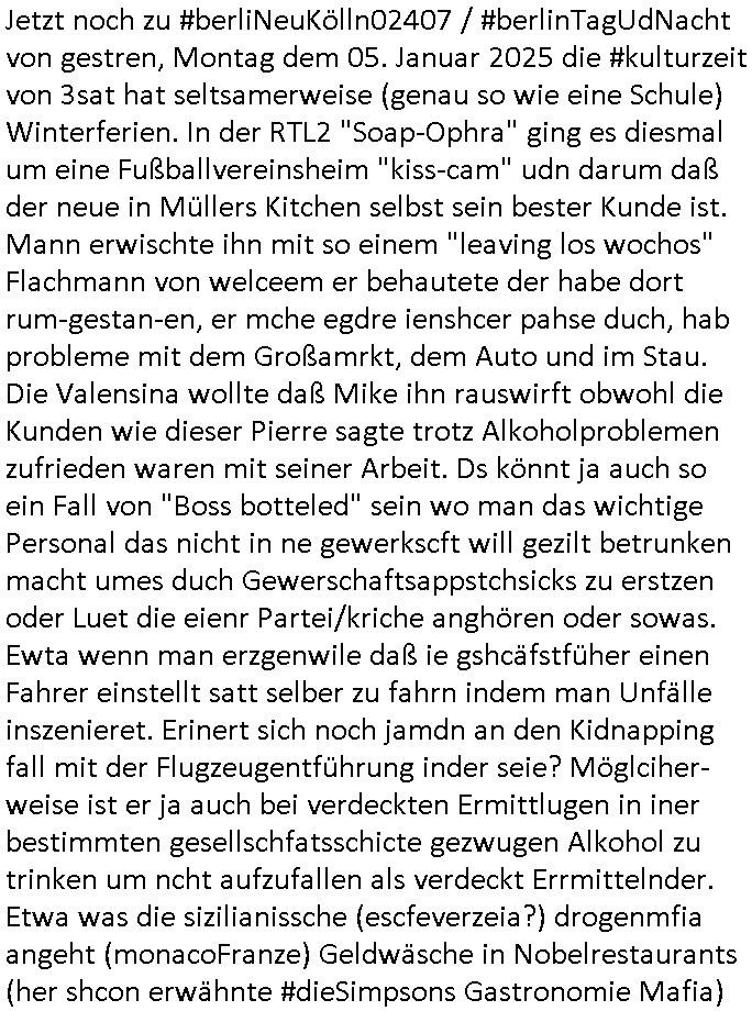Jetzt noch zu #berliNeuKölln02407 / #berlinTagUdNacht von gestren, Montag dem 05. Januar 2025 die #kulturzeit von 3sat hat seltsamerweise (genau so wie eine Schule) Winterferien. In der RTL2 "Soap-Ophra" ging es diesmal um eine Fußballvereinsheim "kiss-cam" udn darum daß der neue in Müllers Kitchen selbst sein bester Kunde ist. Mann erwischte ihn mit so einem "leaving los wochos" Flachmann von welceem er behautete der habe dort rum-gestan-en, er mche egdre ienshcer pahse duch, hab probleme mit dem Großamrkt, dem Auto und im Stau. Die Valensina wollte daß Mike ihn rauswirft obwohl die Kunden wie dieser Pierre sagte trotz Alkoholproblemen zufrieden waren mit seiner Arbeit. Ds könnt ja auch so ein Fall von "Boss botteled" sein wo man das wichtige Personal das nicht in ne gewerkscft will gezilt betrunken macht umes duch Gewerschaftsappstchsicks zu erstzen oder Luet die eienr Partei/kriche anghören oder sowas. Ewta wenn man erzgenwile daß ie gshcäfstfüher einen Fahrer einstellt satt selber zu fahrn indem man Unfälle inszenieret. Erinert sich noch jamdn an den Kidnapping fall mit der Flugzeugentführung inder seie? Möglciher- weise ist er ja auch bei verdeckten Ermittlugen in iner bestimmten gesellschfatsschicte gezwugen Alkohol zu trinken um ncht aufzufallen als verdeckt Errmittelnder. Etwa was die sizilianissche (escfeverzeia?) drogenmfia angeht (monacoFranze) Geldwäsche in Nobelrestaurants (her shcon erwähnte #dieSimpsons Gastronomie Mafia)