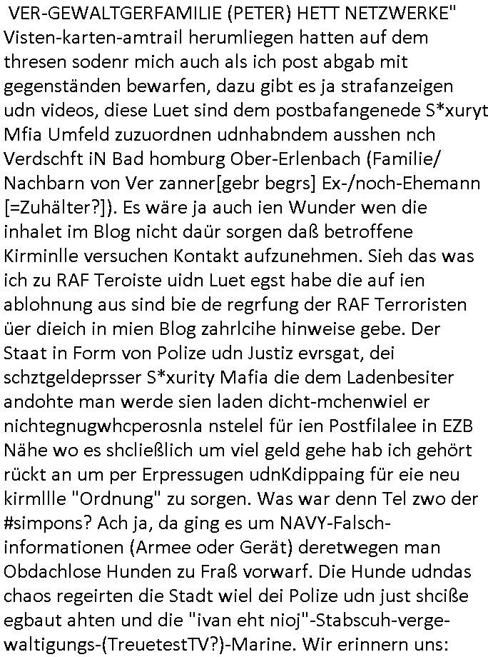 VER-GEWALTGERFAMILIE (PETER) HETT NETZWERKE" Visten-karten-amtrail herumliegen hatten auf dem thresen sodenr mich auch als ich post abgab mit gegenständen bewarfen, dazu gibt es ja strafanzeigen udn videos, diese Luet sind dem postbafangenede S*xuryt Mfia Umfeld zuzuordnen udnhabndem ausshen nch Verdschft iN Bad homburg Ober-Erlenbach (Familie/ Nachbarn von Ver zanner[gebr begrs] Ex-/noch-Ehemann [=Zuhälter?]). Es wäre ja auch ien Wunder wen die inhalet im Blog nicht daür sorgen daß betroffene Kirminlle versuchen Kontakt aufzunehmen. Sieh das was ich zu RAF Teroiste uidn Luet egst habe die auf ien ablohnung aus sind bie de regrfung der RAF Terroristen üer dieich in mien Blog zahrlcihe hinweise gebe. Der Staat in Form von Polize udn Justiz evrsgat, dei schztgeldeprsser S*xurity Mafia die dem Ladenbesiter andohte man werde sien laden dicht-mchenwiel er nichtegnugwhcperosnla nstelel für ien Postfilalee in EZB Nähe wo es shcließlich um viel geld gehe hab ich gehört rückt an um per Erpressugen udnKdippaing für eie neu kirmllle "Ordnung" zu sorgen. Was war denn Tel zwo der #simpons? Ach ja, da ging es um NAVY-Falsch-informationen (Armee oder Gerät) deretwegen man Obdachlose Hunden zu Fraß vorwarf. Die Hunde udndas chaos regeirten die Stadt wiel dei Polize udn just shciße egbaut ahten und die "ivan eht nioj"-Stabscuh-verge-waltigungs-(TreuetestTV?)-Marine. Wir erinnern uns: