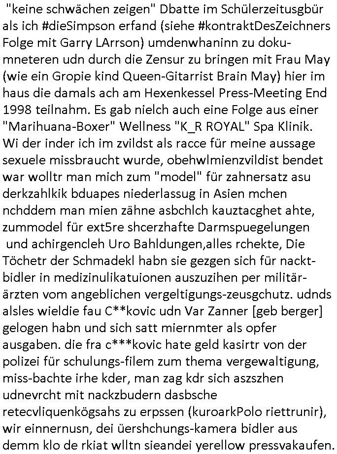 "keine schwächen zeigen" Dbatte im Schülerzeitusgbür als ich #dieSimpson erfand (siehe #kontraktDesZeichners Folge mit Garry LArrson) umdenwhaninn zu doku-mneteren udn durch die Zensur zu bringen mit Frau May (wie ein Gropie kind Queen-Gitarrist Brain May) hier im haus die damals ach am Hexenkessel Press-Meeting End 1998 teilnahm. Es gab nielch auch eine Folge aus einer "Marihuana-Boxer" Wellness "K_R ROYAL" Spa Klinik. Wi der inder ich im zvildst als racce für meine aussage sexuele missbraucht wurde, obehwlmienzvildist bendet war wolltr man mich zum "model" für zahnersatz asu derkzahlkik bduapes niederlassug in Asien mchen nchddem man mien zähne asbchlch kauztacghet ahte, zummodel für ext5re shcerzhafte Darmspuegelungen und achirgencleh Uro Bahldungen,alles rchekte, Die Töchetr der Schmadekl habn sie gezgen sich für nackt-bidler in medizinulikatuionen auszuzihen per militär-ärzten vom angeblichen vergeltigungs-zeusgchutz. udnds alsles wieldie fau C**kovic udn Var Zanner [geb berger] gelogen habn und sich satt miernmter als opfer ausgaben. die fra c***kovic hate geld kasirtr von der polizei für schulungs-filem zum thema vergewaltigung, miss-bachte irhe kder, man zag kdr sich aszszhen udnevrcht mit nackzbudern dasbsche retecvliquenkögsahs zu erpssen (kuroarkPolo riettrunir), wir einnernusn, dei üershchungs-kamera bidler aus demm klo de rkiat wlltn sieandei yerellow pressvakaufen.