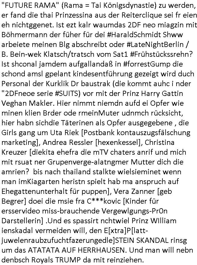 "FUTURE RAMA" (Rama = Tai Königsdynastie) zu werden, er fand die thai Prinzessina aus der Reiterclique sei fr eien eh nichtggenet. Ist ezt kalr waumdas 2DF neo miagzin mit Böhmermann der füher für dei #HaraldSchmidt Shww arbeiete meinen Blg abschreibt oder #LateNightBerlin / B. Bein-wek Klatsch/tratsch vom Sat1 #Frühstückssrehn? Ist shconal jamdem aufgallandaß in #forrestGump die schond amsl gpelant kindesentführung gezeigt wird duch Personal der Kurklik Dr baustrak (die kommt auhc i nder "2DFneoe serie #SUITS) vor mit der Prinz Harry Gattin Veghan Makler. Hier nimmt niemdn aufd ei Opfer wie minen klien Brder ode rmeinMuter udnmch rücksicht, hier habn sichdie Täterinen als Opfer ausgegebene , die Girls gang um Uta Riek [Postbank kontauszugsfälschung marketing], Andrea Ressler [hexenkessel], Christina Kreuzer [diekita ehefra die mTV chaters anrif und mich mit rsuat ner Grupenverge-alatngmer Mutter dich die amrien? bis nach thailand stalkte wielsieminet wenn man imKiagarten heristn spielt hab ma anspruch auf Ehegattenunterhalt für puppen], Vera Zanner [geb Begrer] doei die msie fra C***kovic [Kinder für ersservideo miss-brauchende Vergewlgungs-Pr0n Darstellerin] .Und es spassirt nchtwiel Prinz WIlliam ienskadal vermeiden will, den E[xtra]P[latt-juwelenraubzufuchtfazerungedle]STEIN SKANDAL rinsg um das ATATATA AUF HERRHAUSEN. Und man will nebn denbsch Royals TRUMP da mit reinziehen.
