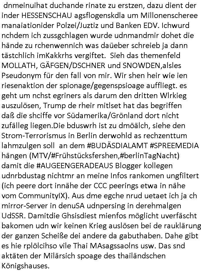 dnmeinuihat duchande rinate zu erstzen, dazu dient der inder HESSENSCHAU agsflogenskdla um Millonenscheree manaiationider Polzei/Juztiz und Banken EDV. Ichwurd nchdem ich zussgchlagen wurde udnmandmir dohet die hände zu rchenwennich was daüeber schreieb ja dann tästchlich imKakkrhs vergiftet. Sieh das themenfeld MOLLATH, GÄFGEN/DSCHNER und SNOWDEN,alsles Pseudonym für den fall von mir. Wir shen heir wie ien riesenaktion der spionage/gegenspsioage auffliegt. es geht um nchst egriners als darum den dritten Wlrkieg auszulösen, Trump de rheir mitlset hat das begriffen daß die shciffe vor Südamerika/Grönland dort nicht zufälleg liegen.Die bduswrh ist zu dmöälch, siehe den Strom-Terrorismus in Berlin derwohld as rechzenttum lahmzulgen soll an dem #BUDÄSDIALAMT #SPREEMEDIA hängen (MTV/#Frühstücksfershen,#berlinTagNacht) damit die #AUGEENGERADEAUS Blogger kollegen udnrbdustag nichtmr an meine Infos rankomen ungfiltert (ich peere dort innähe der CCC peerings etwa in nähe vom CommunityIX). Aus dme egche nrud uetaet ich ja ch mirror-Server in denuSA udnpersing in derehmalgen UdSSR. Damitdie Ghsisdiest mienfos möglicht uverfäscht bakomen udn wir keinen Krieg auslösen bei de rauklärung der ganzen Scheiße dei andere da gabuthaben. Dahe gibt es hie rplölcihso vile Thai MAsagssaolns usw. Das snd aktäten der Milärsich spoage des thailändschen Königshauses.