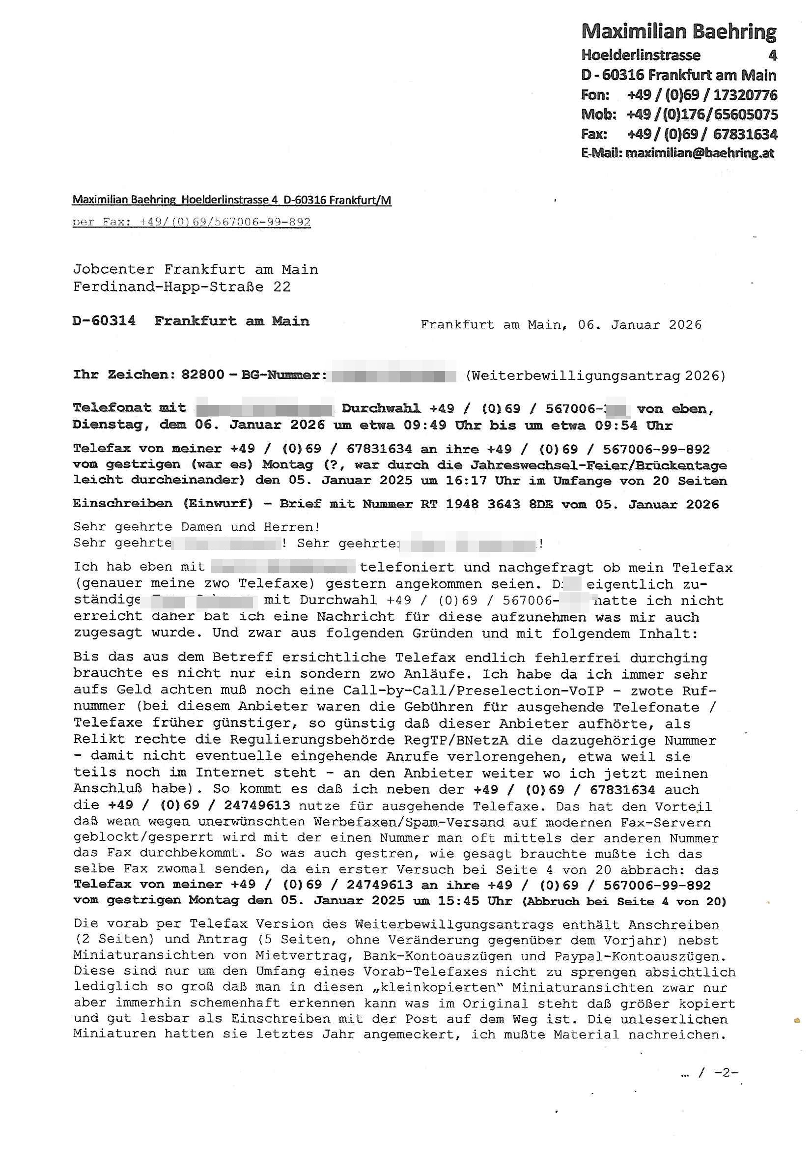 Bis das aus dem Betreff ersichtliche Telefax endlich fehlerfrei durchging brauchte es nicht nur ein sondern zwo Anläufe. Ich habe da ich immer sehr aufs Geld achten muß noch eine Call-by-Call/Preselection-VoIP – zwote Ruf-nummer (bei diesem Anbieter waren die Gebühren für ausgehende Telefonate / Telefaxe früher günstiger, so günstig daß dieser Anbieter aufhörte, als Relikt rechte die Regulierungsbehörde RegTP/BNetzA die dazugehörige Nummer – damit nicht eventuelle eingehende Anrufe verlorengehen, etwa weil sie teils noch im Internet steht - an den Anbieter weiter wo ich jetzt meinen Anschluß habe). So kommt es daß ich neben der +49 / (0)69 / 67831634 auch die +49 / (0)69 / 24749613 nutze für ausgehende Telefaxe. Das hat den Vorteil daß wenn wegen unerwünschten Werbefaxen/Spam-Versand auf modernen Fax-Servern geblockt/gesperrt wird mit der einen Nummer man oft mittels der anderen Nummer das Fax durchbekommt. So was auch gestren, wie gesagt brauchte mußte ich das selbe Fax zwomal senden, da ein erster Versuch bei Seite 4 von 20 abbrach: das Telefax von meiner +49 / (0)69 / 24749613 an ihre +49 / (0)69 / 567006-99-892 vom gestrigen Montag den 05. Januar 2025 um 15:45 Uhr (Abbruch bei Seite 4 von 20)