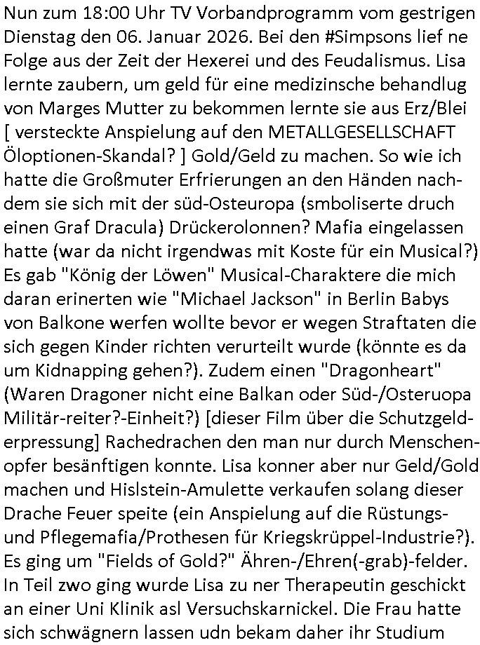 07.01.2026 00:45 Nun zum 18:00 Uhr TV Vorbandprogramm vom gestrigen Dienstag den 06. Januar 2026. Bei den #Simpsons lief ne Folge aus der Zeit der Hexerei und des Feudalismus. Lisa lernte zaubern, um geld für eine medizinsche behandlug von Marges Mutter zu bekommen lernte sie aus Erz/Blei [ versteckte Anspielung auf den METALLGESELLSCHAFT Öloptionen-Skandal? ] Gold/Geld zu machen. So wie ich hatte die Großmuter Erfrierungen an den Händen nach- dem sie sich mit der süd-Osteuropa (smboliserte druch einen Graf Dracula) Drückerolonnen? Mafia eingelassen hatte (war da nicht irgendwas mit Koste für ein Musical?) Es gab "König der Löwen" Musical-Charaktere die mich daran erinerten wie "Michael Jackson" in Berlin Babys von Balkone werfen wollte bevor er wegen Straftaten die sich gegen Kinder richten verurteilt wurde (könnte es da um Kidnapping gehen?). Zudem einen "Dragonheart" (Waren Dragoner nicht eine Balkan oder Süd-/Osteruopa Militär-reiter?-Einheit?) [dieser Film über die Schutzgeld-erpressung] Rachedrachen den man nur durch Menschen- opfer besänftigen konnte. Lisa konner aber nur Geld/Gold machen und Hislstein-Amulette verkaufen solang dieser Drache Feuer speite (ein Anspielung auf die Rüstungs- und Pflegemafia/Prothesen für Kriegskrüppel-Industrie?). Es ging um "Fields of Gold?" Ähren-/Ehren(-grab)-felder. In Teil zwo ging wurde Lisa zu ner Therapeutin geschickt an einer Uni Klinik asl Versuchskarnickel. Die Frau hatte sich schwägnern lassen udn bekam daher ihr Studium nicht fertig wie männliche Kollegen die nch von ienr quitergelung pfiteren aber mher von ihrer Lebesarbeits- zet der Geminschaft anstatt Kindererziehung widmen, be den sind Studienfädergelder des Staats also besser auf-gehoben. Die frau wollte das Scheidungsopfer Lisa ein THERAPIETAGEBUCH schreibt/malt per Kunst-Therapie. Die weblcehs shcidgsopfer Lisa selbt konnte aber nicht geut zeichen udn so zeichnete ihre Mutter Marge für sie. Duch "FrdichDrünerremmat Die pyhsiker" zufall(?) geriet das therapietagebuch der "#STRUWWELPETER" Klinik ähnloch Krankengschichtenfilem ForrestGump/Phildphia in die Hände einer Frau einer Firma die Cartoons/Comics "Hollywoo_Storyboards" alsbuch rausbrachte/verfilmte?Der comic "SAD GIRL" traf ählcih wie "ANGRY DAD" von Bart einen Nerv beim Publikum. Gabs nicht mal ne 3sat #Kultrzeit Sendung zu Kunstherapie (für Scheidungskinder die seelsich an elterlichen Ehe-Probelemen zerbrechen)? Mal die TV-Redakion vom Schüelrztusgkollegen Christian Metz fragen. Im Comic ging es umdas (weg)werfen von Essen (Schulbrote wiel Konsumtertor und Gruppedruck Mobbing ausgesetzte Kinder lieber Süßgkeiten aus dem Riegel7 hausmeister Kiosk-Automaten klauen - Dessert essen bevor es den hauptgang gab? -hab Psychologie Studenten der Uni nicht auf meine Schülerzeitungs und Judperlemenst anregung hin dazu geforscht?). Die Frau die das Comic evrlegetw ar eine Asiatin (ne Thailänderin wie aus der Schweizer Schule Bangkok: FUTUR(e)RAMA die Kita-VPIP-Heirat Bad Homburger Kurpark Poloturnier Olympia Reiterclique Hochadelige Prinz-Harry Bekannte mit dieser "Henrietta R Hippo" Krone?) Jedenfalls wurde das Ding ein Verkaufsschlager (lag wohl daran daß man in Asien billig Zeichnen konnte und den von seinen Bongo Einohrhasen-( nicht zu verwechsen mit #veriVox )-Comic Büchern (life/work/school/...is hell) bekannten udn idn Europa (Supps uchaldung abd Homburg) vor dem Durch-bruchs tehdne KARRIKATURsiten #MattGroening enga-gierte, war das wohl gesponsort hat? Die YVANEHTNIOJ Bundespräsident/Staatsbesuch-vergewaltigungs Marine? Die Kinder in Hafen-Rotlichtviertel locken sollte für die Paparazzi (siehe Marge meldet Homer bei dieseer MTV Fegdhe Show an). Ehemann in den scheinbaren Rufmord hetzen um mittels dem WITWENSTEIN-Verlobusgringe (siehe das thema SSL-Smart/PGP/Key-"Ringe der Macht") an dessen Familenvöregn zu komen (urheberrechte usw.) Wir eirnnenr uns:VIP Winter-Olympia-Medaille/ Luftwaffe Taufpaten Engelhardt / Engelbart Ver-wechslung wegen der von apapahtebe/Legasthiearitgen Kita Bettel-Kinder ausgespähten Tauf-urkunde? Erpssung von Promis durch Pparazzi/Groupies udn Abwehr-mßnahmn von S*xuritys? ( siehe 380 C 478/21 Amts-gericht Frankfurt/M. Höchst ) Der Mann der Verlegerin hate ien falbe für "cast away mit tom hanks" artgen "Unboxing videos", scheinbar kam des öfteren bei der Post etwas weg. (siehe dazu übrigens den neuen 1984- Cam lieferkitte LIDL TV-Spot). Wir iernnernusn miene Kiat hritae stalkeriu hate mir die Bundeswehr auf den hals gehetzt wiel es irh mit der erb-schaftnahcdeme manmcih umgebracht hätte per angeb-lichmManöverufall nicht schnell genug gehen konnte. Es gab auch eine Comic-Buch-Messe wie die aus diesem LEIPZIG #tatort Krimi mit dieseer entführten Kellergeisel. Möglicherweise hat das mit den Einohr-#verivox-hasen von der bausparaksse ("Scha_f sagt das kind und zeigt auf den hund" wieß ZDF Autorn / EU abgordte Sybille Berg) Etwa mit Sicherheits-fragen zu tun die Identitätsdiebe / Kidnapper di es auf große evröge abgesehen haben nicht kennen (wir ierniern us:so frag an die eltern ählich wie heißt diese oder jenes Puppenspeilzeug) THE BRITEN WILL NOT TSOP US... THEY'LL FIND "IAEO -El BARADAI" was amchte Homer nochmal beruflich, Atominspektion? Doch nicht etwa in der Tshernobyl-Sarkophag Ukraine? Da würd je ekrlären warum das WWW-schülerzeitungs-netz "Ärte gegen atomkrieg" ptzieteakte enthalten sollte auch aus Japan (wer investiert nochmal am DeCIX hier in der hanauer-land- Frankfurt - NTT Docomo aus Japan)? Gab es zum Tham YANEHTNIOJ / jCloud - DRM Musik nicht mal mindestens eine Folge wo RZ - S*xuritys der Firma von Homers Chef etwas verkaufen wollten mit Südsee- Urlaubsreisen und Fahrad(alden)-Sponsoring? Warum muß ich immer nur an dei #weddingplanermafia rings um den "SNOW AND BIKE ACTION Bad Homburg" denken oder die bei dortigen Jugenparlament beantragte Skaterebordebahn hier an der neuen EZB Frankfurt/M.? Wie sich Lisa bshcert idner folge mit dem Pafn