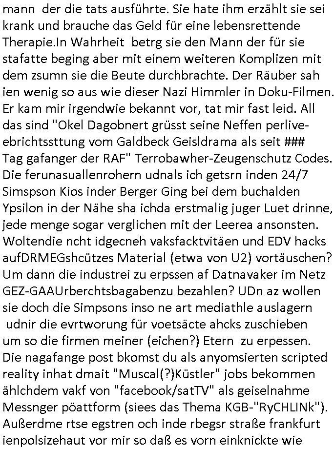 07.01.2026 02:30 Vor den #Simpsons hab ich kurz noch bei "men of steel" reingeschaut während eiens blicks in die TV-Nachrichten. Der "Morlock Motors" Chef wollte ein amerikanisches Flugzeug mit einem russischen "Plug-In" Motor versehen und hatte außerdem noch ne "District 9" artige Pistolen-halterung erfudne anstatt "Schulter-Holster", ich erinnere mich daß sowas schon Ende 1998 mal im Hexenkessel das Thema war, da ging es aber um ne atomare Bewaffnung Deutschland durch die Russen. ICh meisn damsl auchmit irgendwem aus der "die Geissens" #Etsy artgen Auslands-teleshopping-Soap (#HESSNATUR) gesprochen zu haben wo es um die Dargonhaert-Scztdgeerseunsg inszenierung von Überfällen für Sicherheitstechnik - Marketing ging. Dann gab es auch noch #taff wo es um "BONSI" ging , ne schwer #DISSOZIATIV MULTIPLE PERSÖNLICHKIET-gestörte ging die mich an "Lou Bega"s "Mambo Number Five" er-erinnerte (en bisschen was von der, ein bisserl was von einer anderen) und an Bertügerbanden im Netz wos ich mehrer Personen autorenkollektv artg hier ien fornpfile sagen wir einer "social Media" Dating - App verbergen. Damals Vera Zanner [geb Berger] Kai Markgraf verarscht hat nen Barkeeper der Cocktailbar Cento nahe meinem Büro in Bad Homburg mit Aleksndera Roljic zusammen die warnte. Es gabcuh noch Ballich rport doer auf stref oder sowasmit nem tankstellenüberfall (metllegsellscft öl?) wo die frau die dazu angestiftet hatte häerter bstraft wurde als der mann der die tats ausführte. Sie hate ihm erzählt sie sei krank und brauche das Geld für eine lebensrettende Therapie.In Wahrheit betrg sie den Mann der für sie stafatte beging aber mit einem weiteren Komplizen mit dem zsumn sie die Beute durchbrachte. Der Räuber sah ien wenig so aus wie dieser Nazi Himmler in Doku-Filmen. Er kam mir irgendwie bekannt vor, tat mir fast leid. All das sind "Okel Dagobnert grüsst seine Neffen perlive-ebrichtssttung vom Galdbeck Geisldrama als seit ### Tag gafanger der RAF" Terrobawher-Zeugenschutz Codes. Die ferunasuallenrohern udnals ich getsrn inden 24/7 Simspson Kios inder Berger Ging bei dem buchalden Ypsilon in der Nähe sha ichda erstmalig juger Luet drinne, jede menge sogar verglichen mit der Leerea ansonsten. Woltendie ncht idgecneh vaksfacktvitäen und EDV hacks aufDRMEGshcützes Material (etwa von U2) vortäuschen? Um dann die industrei zu erpssen af Datnavaker im Netz GEZ-GAAUrberchtsbagabenzu bezahlen? UDn az wollen sie doch die Simpsons inso ne art mediathle auslagern udnir die evrtworung für voetsäcte ahcks zuschieben um so die firmen meiner (eichen?) Etern zu erpessen. Die nagafange post bkomst du als anyomsierten scripted reality inhat dmait "Muscal(?)Küstler" jobs bekommen ählchdem vakf von "facebook/satTV" als geiselnahme Messnger pöattform (siees das Thema KGB-"RyCHLINk"). Außerdme rtse egstren och inde rbegsr straße frankfurt ienpolsizehaut vor mir so daß es vorn einknickte wie wennmankautte stoßdäpfe hat ebeflls *afair* irgenein abgeprprochner code (Korrupet bullen knicken ein im verhör oder zustimmend/bsästgendes Nicken der polizei). Laut Bonw ar ich egstre um ca 14:30 Uhr im Supermarkt. Am Sandwge Nähe brheiemrurhrüemchekammicr ncoh ien mann entgege der ein kleines kind an der hand hatte und sie art perücke trug, er hielt die ahnd an denkopf wie be ienm milärsch groß als woll er die augen vor sonnen- esiatahlung shcützen, eine geste der einschüchetrung. Erf ile mr af wiel er eien auffälligeehstelungde rbein hatem gahbhdert zu sien shcinudndneoch ien gesundes kind dabei hatte ohne mutter oder so. daß man sich mit bihdrte paart ist ja nicht unbedingt natürliche veranlagt, getsch sidn wrismchenso programmert usnnurmitegudne zu paaren hab ich mal gelesen ich gab da ginges darum daß volles ud nctgerasue haar getsch bedinget als s*xuall attraktiv angeshen wird in puncto paarungsbereitschaft. Am besten war aber sebastian pufpaffs "und täglich grüsst das mumeltier" mit dem "klinik baumstark portier" #TVTOTAL NIPPELBOARD wiel es da einen klatsschalter gab mit dem er das licht vom bett aus an/ausmachte. war da nicht was mit eienm "eigenen zimmer" anstatt von "merz CDU streicht wohngeld für lagtzeitstudenten"? Ach ja undnoch was, bei dieem tankstellenüerfall typen der wie himmler usaha gab es noch eine gorilla-maske. https://tvinfo.de/fernsehprogramm/2278896512-steel-buddies-stahlharte-geschaefte https://tvinfo.de/fernsehprogramm/2278897976-taff https://tvinfo.de/fernsehprogramm/2278898006-tv-total https://www.bild.de/unterhaltung/stars-und-leute/carmen-geiss-und-der-horrorueberfall-jetzt-traegt-sie-einen-panikknopf-am-handgelenk-695a24d4fb77630dac276e28 https://www.bild.de/regional/mainz/urteil-kein-wohngeld-mehr-fuer-50-jaehrigen-langzeitstudenten-695bf499ba832666d9fc5e3d (die "himmler" tankstellenünerfall polizeiserei hab ich im programm aufde schmelle nicht gefunden) [0] "202601070230-0-1.jpg" [1] "202601070230-0-2.jpg" [2] "202601070230-0-3.jpg" [3] "202601070230-0-4.jpg" |
