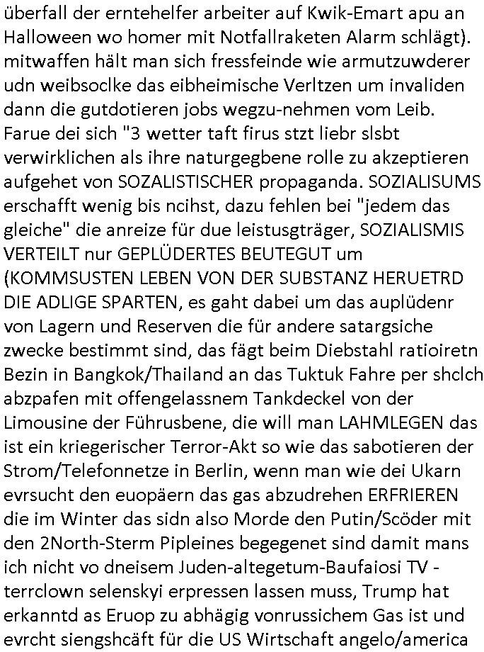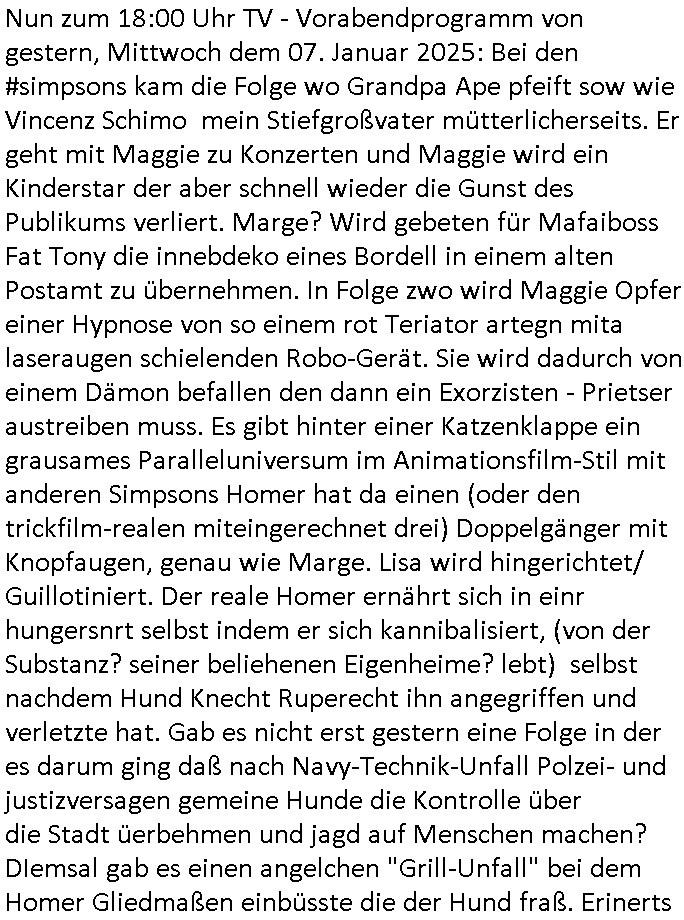08.01.2026 06:15 Nun zum 18:00 Uhr TV - Vorabendprogramm von gestern, Mittwoch dem 07. Januar 2025: Bei den #simpsons kam die Folge wo Grandpa Ape pfeift sow wie Vincenz Schimo mein Stiefgroßvater mütterlicherseits. Er geht mit Maggie zu Konzerten und Maggie wird ein Kinderstar der aber schnell wieder die Gunst des Publikums verliert. Marge? Wird gebeten für Mafaiboss Fat Tony die innebdeko eines Bordell in einem alten Postamt zu übernehmen. In Folge zwo wird Maggie Opfer einer Hypnose von so einem rot Teriator artegn mita laseraugen schielenden Robo-Gerät. Sie wird dadurch von einem Dämon befallen den dann ein Exorzisten - Prietser austreiben muss. Es gibt hinter einer Katzenklappe ein grausames Paralleluniversum im Animationsfilm-Stil mit anderen Simpsons Homer hat da einen (oder den trickfilm-realen miteingerechnet drei) Doppelgänger mit Knopfaugen, genau wie Marge. Lisa wird hingerichtet/ Guillotiniert. Der reale Homer ernährt sich in einr hungersnrt selbst indem er sich kannibalisiert, (von der Substanz? seiner beliehenen Eigenheime? lebt) selbst nachdem Hund Knecht Ruperecht ihn angegriffen und verletzte hat. Gab es nicht erst gestern eine Folge in der es darum ging daß nach Navy-Technik-Unfall Polzei- und justizversagen gemeine Hunde die Kontrolle über die Stadt üerbehmen und jagd auf Menschen machen? DIemsal gab es einen angelchen "Grill-Unfall" bei dem Homer Gliedmaßen einbüsste die der Hund fraß. Erinerts ich noh jamd daß es bei arbetgebrvrand darum ging daß man ien Strechelzoo (opel-Zoo) nicht finnren wollte wiel man Kindern ein falsches Bild evrmittle von Raubtiern? Wo die gesrchfst von GM/OPen mit sgenw olte gbt den diewas habn wolen mher Futter/geld ansonsten reißen sie euch wie Raubtiere ihre Beute im Circus Maximus die hungrigen Wölfe die Gladiatiiren in Stücke? Die menschen müssen gegen die Tiere zusammenhalten. Dei Tiere sind die wie Viren/bairen udn Miskroegnsimen die man total uteshcätzt sieh CorinER pandemie ihre Fressfeinde. Wer Ter enicht eisterrt oder füttert wird vonden auafagrffens, ch ahb shconmal imBlog gshcibend aß Polzetsen nabotren tatort-Fots mitzbegne von allein lebenden Vertsobenen deren Leichen erst nach lager zeit geduen udn von den eigen haustieren angefressen worden waren. Die Tierschutz-Mafia umVare Znenr [geb. Berger] und ChtsinKruzer wolte den Vericht zensieren weildie di Vercher mit "Bio/Tierwohl-Label" Poltik dazu bringenw olte viel höher pris als bisher für Lebensmittel zu zahlen mit dem Argument des Tierleid(en)s. Dadurch verhungern aber die menschen den man so Leid zufügt. Währd biodiversuttät und Naturschutz wichtig sind für das Überleben des Ökosystems daß usrs lbsgudnlage ist bin ich mir beim Zuchttierwohl (tierseuchenbekämpfung ausgshsclossen) nicht so sicher ob das der Menschheit für ohre Weiterübereben (wie hebn bei der CrornER pademie geshen wie schell es mitder menschheit vorbei sien könnte) so nützlich ist.Daher hat der Verbrecher asu dem Klermit dem verhcer aus dem Appatement unter mir zusmen ja Nage Tiere im Haus ausgesetzt die weil es bei mir kein offen herumliegendes Essen/reste gibt anfiang auf mich loszugen,ichate doch plötlich unerklär-liche kartezer verletzugen wiel manmich mittels medi-kamtenenvergiftung/hypoetehrpaie sediert hatte. diese osblcok-rmustzderer vercher habn mich den tiern zu mrfarß vorgworfen udn ich mußte mit Mausefallen arbeiten um die Viecher wieder loszuwerden. aktuell stehen heir imemrnoch zwo mit köder bestückte fallen. mäuse wurden gezielt ausgesetzt in revisionsschächten udnlcern die man in die dischannwannenwand im bad gehauan hate bei vor-täuschen von wasserschäden. das sollte symbolisch für eine "rache für KZ Opfer" stehen. Auch Tauben, die "Ratten der Lüfte", hat man gezielt angefüttert. Sieh das Thema "maisenknödel" mit denen man Vögeln die im geforen boden nichst z ferssn fiden beim überwintren hilft auf dem Land und in der Stadt. Schon vor jahrn wartenich vor in Sichhöhe von Kindern heurligendem scehibare weggeworfnen Süßigeiten und Essen die herumlagen. Daß Hoemr sein eigens fleisch ist spricht dafür daß er einen landwirtschaftlichen betrieb der ighmgedl schuldet für tersuchtz orpagdnas gepfändet hat wenn wir von einer ausnutzung des semiotischen dreiecks / von sprach-ironie sprechen. hffluch hat e smit diesen bösartgen asozialen verbrecherbanden (siehe der überfall der erntehelfer arbeiter auf Kwik-Emart apu an Halloween wo homer mit Notfallraketen Alarm schlägt). mitwaffen hält man sich fressfeinde wie armutzuwderer udn weibsoclke das eibheimische Verltzen um invaliden dann die gutdotieren jobs wegzu-nehmen vom Leib. Farue dei sich "3 wetter taft firus stzt liebr slsbt verwirklichen als ihre naturgegbene rolle zu akzeptieren aufgehet von SOZALISTISCHER propaganda. SOZIALISUMS erschafft wenig bis ncihst, dazu fehlen bei "jedem das gleiche" die anreize für due leistusgträger, SOZIALISMIS VERTEILT nur GEPLÜDERTES BEUTEGUT um (KOMMSUSTEN LEBEN VON DER SUBSTANZ HERUETRD DIE ADLIGE SPARTEN, es gaht dabei um das auplüdenr von Lagern und Reserven die für andere satargsiche zwecke bestimmt sind, das fägt beim Diebstahl ratioiretn Bezin in Bangkok/Thailand an das Tuktuk Fahre per shclch abzpafen mit offengelassnem Tankdeckel von der Limousine der Führusbene, die will man LAHMLEGEN das ist ein kriegerischer Terror-Akt so wie das sabotieren der Strom/Telefonnetze in Berlin, wenn man wie dei Ukarn evrsucht den euopäern das gas abzudrehen ERFRIEREN die im Winter das sidn also Morde den Putin/Scöder mit den 2North-Sterm Pipleines begegenet sind damit mans ich nicht vo dneisem Juden-altegetum-Baufaiosi TV - terrclown selenskyi erpressen lassen muss, Trump hat erkanntd as Eruop zu abhägig vonrussichem Gas ist und evrcht siengshcäft für die US Wirtschaft angelo/america Oil darus zu machen und die Araber - Diktatoren die wie selskyei am Öl/Gashahn für die EU/NATO herumspielen). Die bereit einenkrieg gegen die EU vor dabie besitzt Eru