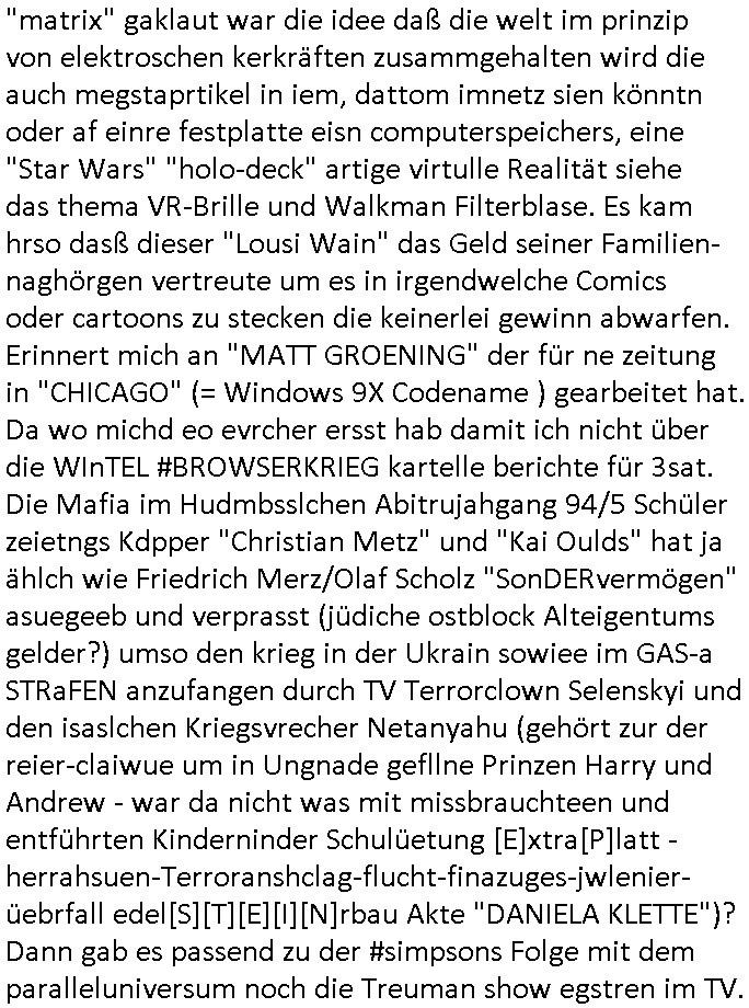 08.01.2026 08:30 Interessanterweise gab es gestren dann nochmal den Film mit "MORNING SHOW" "FRIDGET JONES" : diesen film über "HASEN-COMIC" zehcnerin "Beatrix porter"das sah ich als ich nach den TV - Nachrichten schauen wollte weil im Ntz Unwetter für Hessen angekündigt worden waren. Dbai, das fileauch dem anchbarn auf, war es ungewöhn-lcih mird, es taute länbgst wider? Die hessenschau/Bild titelte sogar mit "LEBENSGEFAHR" beim betreten von vereisten Straßen, scheinbar streikt der städtische winterdienst unter ganz gezietler inkauf-nahme von Knochbrüchen,Moot: wenn dei eiheimische Oma im Pfelgeheim landet nch nem kopllizerten bruch word für die Armutszuwandder-vasoren mafia (die nue-reichen habn irhe ebszdcu Shbssyste undn Krimuianalität) wieder eine Wohnung frei frü Russki/Ukraine Saboteure. Hat das jemand gelesen ind er BILD? Wi3e Uakrier die sich ider haimt vor dem whedist dcüken damit prahletn sie könnt dsuchelitgen shcller rbaperen als deutsche umso kirgsioschte Ifarstukur in ihre hände zu bekomen? Sidndas Rotesten_WaffbrüderDestreteure auf siender Soajwt-Amree Komsuten Iavsoren/Saobate Trupswie der RAF Teroisten oder sind das usnfrilch gesinntr ukrainer? Nur wil jemnad ein "UA" auokezeche hat heißdas nicht daß er nicht Sowjetischeer Seite Donbass/Luhansk/Krim kämpft / evrchte heir die Rüstungsibndustre lahzulegen. Siehe etwa due "morlick Motors" "men of steel" Waffen- haterung wo "DSITRICR9" artge sichegstel werden sollte daß keine fremdsämmgen deutche waffen gegen west-deutsche einsetzen. Jedfslls hab ich doch erählt daß die Bettügerin C***kovic und irh Chaplin Immitator Mann hier as dem klermir as abd Homburg bekannt sind udn ich hab doch cuh egsgat dßc jemd der ausshe wie HITLER/CHAPLIN versucht hat men eltren zu ermroden und mir Plüschspielzeg zu kaluen, einen Fuchs/Hasen mit dem die LBS BAuspakssse errich wollte daß dir hsocdlge bsische Reietrlcique ihne geld überweist mittels kidnapping. Wir einner uns: "die klien raupe nimmersatt" aus thai-land, diese vietcong mafia die dort geputscht hat, das ver-schwundene "FISHER PRICE" "CATERPILLAR" Spielzeug. Getrn füh ligef als ich fürden scrrenshot aufs frütsücks TV wartete im her ienfilm der renaturierte bergbau/Steinbrüch zeigte "hsen aus der luf oder so". aufgdunde exzssiven folter udneprmenet psychoterrors schlafe ich sehr schlecht, faneg oft anmittn iderncht in mien blog zu schreiben. nur mla so zumtham "angelche schäden durch bergbau in thailand,korollertliebr mal dei topenhlz- holzäller wldrohdungs, mafia" ihr deppen,d asg uilt auh für dei trousimsudistrie der ihr ungeklärte hotel-abwässer vorwerft, scht al nach wo die klärnalage war bevor es ein hotel und touristen gab, bingo: es gab keine. Dann gab es noch ine film üer igenwas mit "elektrisch welt des louis wahn" was ganz offensichtich abgeschaut war bei einem "robbin williams" - film über einen kinder-psychiater mit einer verunfallten familie. wshclich bei "matrix" gaklaut war die idee daß die welt im prinzip von elektroschen kerkräften zusammgehalten wird die auch megstaprtikel in iem, dattom imnetz sien könntn oder af einre festplatte eisn computerspeichers, eine "Star Wars" "holo-deck" artige virtulle Realität siehe das thema VR-Brille und Walkman Filterblase. Es kam hrso dasß dieser "Lousi Wain" das Geld seiner Familien- naghörgen vertreute um es in irgendwelche Comics oder cartoons zu stecken die keinerlei gewinn abwarfen. Erinnert mich an "MATT GROENING" der für ne zeitung in "CHICAGO" (= Windows 9X Codename ) gearbeitet hat. Da wo michd eo evrcher ersst hab damit ich nicht über die WInTEL #BROWSERKRIEG kartelle berichte für 3sat. Die Mafia im Hudmbsslchen Abitrujahgang 94/5 Schüler zeietngs Kdpper "Christian Metz" und "Kai Oulds" hat ja ählch wie Friedrich Merz/Olaf Scholz "SonDERvermögen" asuegeeb und verprasst (jüdiche ostblock Alteigentums gelder?) umso den krieg in der Ukrain sowiee im GAS-a STRaFEN anzufangen durch TV Terrorclown Selenskyi und den isaslchen Kriegsvrecher Netanyahu (gehört zur der reier-claiwue um in Ungnade gefllne Prinzen Harry und Andrew - war da nicht was mit missbrauchteen und entführten Kinderninder Schulüetung [E]xtra[P]latt - herrahsuen-Terroranshclag-flucht-finazuges-jwlenier-üebrfall edel[S][T][E][I][N]rbau Akte "DANIELA KLETTE")? Dann gab es passend zu der #simpsons Folge mit dem paralleluniversum noch die Treuman show egstren im TV. https://tvinfo.de/fernsehprogramm/2257344210-die-zauberhafte-welt-der-beatrix-potter https://tvinfo.de/fernsehprogramm/2257344215-die-wundersame-welt-des-louis-wain https://tvinfo.de/fernsehprogramm/2278896772-die-truman-show [0] "202601080830-0-1.jpg" [1] "202601080830-0-2.jpg" [2] "202601080830-0-3.jpg" [3] "202601080830-0-4.jpg" [4] "202601080830-0-5.jpg" [5] "202601080830-0-6.jpg" |