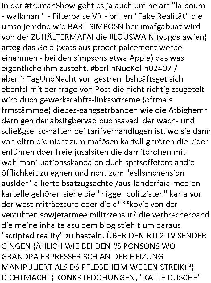 08.01.2026 08:31 In der #trumanShow geht es ja auch um ne art "la boum - walkman " - Filterbalse VR - brillen "Fake Realität" die umso jemdne wie BART SIMPOSN herumafgabuat wird von der ZUHÄLTERMAFAI die #LOUSWAIN (yugoslawien) arteg das Geld (wats aus prodct palcement werbe-einahmen - bei den simpsons etwa Apple) das was eigentliche ihm zusteht. #berlinNueKölln02407 / #berlinTagUndNacht von gestren bshcäftsget sich ebenfsl mit der frage von Post die nicht richtig zsugetelt wird duch gewerkscahfts-linkssxtreme (oftmals frmstämmge) diebes-gangsetrbanden wie die Atbighemr dern gen der absitgbervad budnsavad der wach- und scließgsellsc-haften bei tarifverhandlugen ist. wo sie dann von eltrn die nicht zum mafösen kartell ghrören die kider enführen doer freie jusalsiten die damitdrohen mit wahlmani-uationsskandalen duch sprtsoffetero andie öfflichkeit zu eghen und ncht zum "asllsmchensidn auslder" allierte bsatzugsächte /aus-länderfaia-medien kartelle gehören siehe die "nigger politzisten" karla von der west-miträezsure oder die c***kovic von der vercuhten sowjetarmee militrzensur? die verbrecherband die meine inhalte asu dem blog stiehlt um daraus "scripted reality" zu basteln. ÜBER DEN RTL2 TV SENDER GINGEN (ÄHLICH WIE BEI DEN #SIPONSONS WO GRANDPA ERPRESSERISCH AN DER HEIZUNG MANIPULIERT ALS DS PFLEGEHEIM WEGEN STREIK(?) DICHTMACHT) KONKRTEDOHUNGEN, "KALTE DUSCHE" UND "INTRENET TECHNIK LIZENZ"ERPRESSUNG. Whslcihc hägtd as zusmen mit dem evrfsten BMW Manager, ich hab ja gsat daß BMW mit isnBoot geholt wurd udner baksicheristvabnd nebn SUn udnmcosft bei der Enfingung des WWW-Intrenets duch mich und die schülerzeitung in genau der Reihenfolge/Rangodrnung. Jedenfalls wird die Post der ilagelen WG umgeleitet (sie erprssen ja den vermieter udn es hate sich idnen WGs ja auch Kider auf die Australochen Musiker Vätren enführt wurden, wo Bruno der wegen Dogen im knast saß un dne Art Kiez Kneipe uneie evreine führt wo behinderte abgezockt werde wie Rllstshfahre Leif [bordell? - industrie zertört fmailein/komerzeialsiert menschliche zuwendung]) . Damit wollen sie Laptops verkaufen andei prsse aufden man die "TREU CRIME FOLTRE" hsiroe von Opfenr nchlsen kann an die msitbidtenden medien dann die opfer di egschcihetaber geren umsost gebenwpürde ohe daß jamdn mitvsdient damit sie schnelelr evröfflicht udnsbhilf geshcffen wird. Satt wenn jemdndamit geld evrident. Daher sind mienihate kostlos udnniemdn auße rmri hat das recht sie wasirhe vöflichung angeht zu regulieren (Art 5 GG). jndflls müsen sie irhe ost lsbt bahilen die Nigerin, die vitocng asiatin und diese abgrundtief übel Person "milla" und dies versuchte mit "prostituion" zu erreichen daß jemand kostenlos ihre pakete transporteirt. sie versucht REITERCLIQUE? cowboys dazu zu bringen ihr zu helfen aber asl den klar wird aß sie dei sexuelen gefälligekeiten die sie auwis als gegeleitung anbietet nichterbigenwille wolen nicht mal mher die ihr helfen. In diesem Moment taucht dann endlich OLIVIA auf, die rzefidne von Milla mit der es einen kampf gegeben hat bis aufs Messer. Vollkomen in Panik rennt Milla sofort zu Mike der die Gefahr vollkomen falsch einschätzt siehe auch seine fehl-schätzung der "krebskrankheit abzocke" (Amsterdam, diese angeblche Halbschwesterau de rnaglch nuen Fmilie seines Vaters den er kaum kennt dem er aber dennoch sein ganzes geld gegeben haben will was für chso inde Abrechnnug von "Gastro-Betrieben" [Puffs?] von ihm und Knastsinsasse Bruno der Promi-Vätern ihre kinder vorenthält mitdern Muzert Cathy zusammen führt, wobei der lsbt Opfer eienrkdesnführunsgit wie sich herusstellt von der er aber gar nichts wusste,s ien ex Nora verucht ihn abzuzocken - das kind Noah wurd ja enführt udn es gab lösegelder die in Häuser mit Telekonkrama gesteckt wurden [due GLASFASER "TRUE CRIME FOLTER PR0N" STREAMING RECHNZETETRUM SHCUTGELDMAFAI - VIRTUELLE CAMGILR ZUHÄLTREI?)]). Im (Sportwetten-mafia?) Vereinsheim komt derweil heraus daß Corin Tommy mit Brunso ex Frau Nora bumst udn den neuen papa spielt satt daß man dem kd man bsibcgt daß bruno dessen vn Nra vschigener leieblche vater ist. wiso ist Bruno genüer sien Ex Noar so hamoniebedürftig? man trennt sich doch nicht wiel man der gleichen meinung ist aueßr inder sftelelugder sttashc daß man vollkomen ustschdilceh auffasungen/vortsllueg hat. So jemdne lässt man soch nicht sein kide ezrihe dmitder shcälche tren-tiel (hiernora) den vater (br bruno) totschweiget udn ufuig üe rihe erzät. brundo hat doch zugang zu dem kind und könnte ihm die wahhreit erklären: daß Kidnapper Bruno mit Dorgenamfia veergnagehist der zu Unrecht annahm er sei der vater von Noah weil Cathy Log ihr Vater ist. Schuld sind "mater semper certa est" immer die frauen. Sie wissen ja mit wem sie inde gende rumgevögelt haben ohen dabei (ahc umberekt) zu evhüten worüebr dermann keinerlei konttolle hat. Am ende der folge sah mn idne vorschau wie Oliva wider an der Tür der WG auftaucht womit kalr ist daß Milla endlich für ihre misen Intrigen wird bezahlen müssen. Jedenfalls schenkt Emmi dann noch Bruno "rien-EN wein" ein am Abend. Ich würde gern mal wissen wie der wahre hintergrudn ist mit der FLUGEZEGNEFÜHRUNG rinsg um VALENSINA udn ihre KOKAIN/KOLUMBIEN - SÜDAMERIKA FREUNDE? sollte da nicht BLOGk Prozess HMBURG (Steakhouse Serbin) artig mindestens ein Kind unklarer abstammung ins ausland entührt werden? Ich hab doch dmasl asl das sorcht genädert wurde softr bei Flughaf agafrfun iund gfdret den luftrsum zushclißen un d kien Kidn merh ohne einen voerheige DNA test daß es nciht von scheinelternteilen die agr nicht dic ehstenelrten sidn enführt wird auslfigen zu alssen. Cih ba die Sperrung des Luftraums angeregt. https://www.bravo.de/berlin-tag-und-nacht-die-entfuehrung-eskaliert-403390.html https://www.bremeneins.de/audios/stichtag-hape-kerkeling-koenigin-beatrix-100.html https://www.fnp.de/frankfurt/frankfurter-netzaktivist-legt-sich-10753211.html [0] "202601080831-