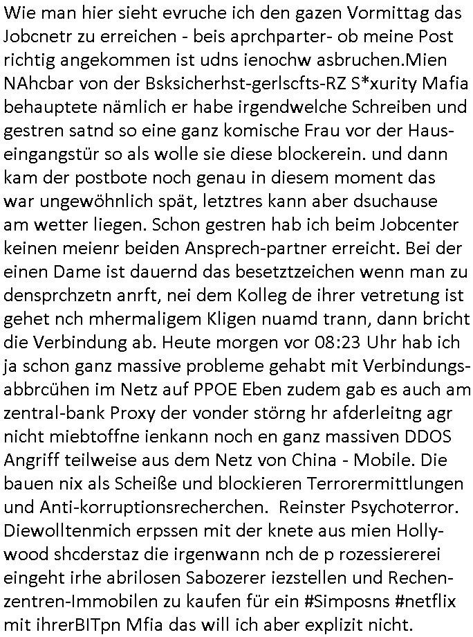 09.01.2026 11:00 Datum/Uhrzeit,Dauer,Gesprächspartner,Typ,Answered 09.01.2026 10:55:50,00:00,069567006381,call,noanswer 09.01.2026 10:54:55,00:00,069567006323,call,noanswer 09.01.2026 10:54:03,00:00,069567006381,call,noanswer *** (bei rufnummerneimgabe vertippt) *** 09.01.2026 10:53:00,00:00,069567006323,call,noanswer 09.01.2026 10:51:37,00:00,069567006323,call,noanswer 09.01.2026 10:46:05,05:16,0308***,call,ok 09.01.2026 10:44:28,00:00,069567006381,call,noanswer 09.01.2026 10:43:39,00:00,069567006381,call,noanswer 09.01.2026 10:42:59,00:00,069567006323,call,noanswer 09.01.2026 10:40:10,00:00,069567006323,call,noanswer 09.01.2026 10:39:53,00:00,069567006381,call,noanswer 09.01.2026 10:39:11,00:00,069567006381,call,noanswer 09.01.2026 10:38:33,00:00,069567006323,call,noanswer 09.01.2026 10:23:57,00:00,069567006381,call,busy 09.01.2026 10:23:34,00:00,069567006323,call,noanswer 09.01.2026 10:12:13,00:00,069567006381,call,noanswer 09.01.2026 10:11:22,00:00,069567006323,call,noanswer 09.01.2026 10:10:21,00:00,069567006381,call,noanswer 09.01.2026 10:09:31,00:00,069567006323,call,noanswer 09.01.2026 10:08:35,00:00,069567006381,call,noanswer 09.01.2026 10:07:51,00:00,069567006323,call,noanswer 09.01.2026 10:07:23,00:00,069567006381,call,noanswer 09.01.2026 10:06:38,00:00,069567006323,call,noanswer 09.01.2026 09:55:16,00:00,069567006323,call,noanswer 09.01.2026 09:44:08,00:00,069567006323,call,noanswer 09.01.2026 09:43:39,00:00,069567006323,call,noanswer 09.01.2026 09:12:43,00:00,069567006323,call,noanswer 09.01.2026 09:12:16,00:00,069567006323,call,noanswer 08.01.2026 10:11:02,00:00,069567006381,call,cancel Wie man hier sieht evruche ich den gazen Vormittag das Jobcnetr zu erreichen - beis aprchparter- ob meine Post richtig angekommen ist udns ienochw asbruchen.Mien NAhcbar von der Bsksicherhst-gerlscfts-RZ S*xurity Mafia behauptete nämlich er habe irgendwelche Schreiben und gestren satnd so eine ganz komische Frau vor der Haus-eingangstür so als wolle sie diese blockerein. und dann kam der postbote noch genau in diesem moment das war ungewöhnlich spät, letztres kann aber dsuchause am wetter liegen. Schon gestren hab ich beim Jobcenter keinen meienr beiden Ansprech-partner erreicht. Bei der einen Dame ist dauernd das besetztzeichen wenn man zu densprchzetn anrft, nei dem Kolleg de ihrer vetretung ist gehet nch mhermaligem Kligen nuamd trann, dann bricht die Verbindung ab. Heute morgen vor 08:23 Uhr hab ich ja schon ganz massive probleme gehabt mit Verbindungs-abbrcühen im Netz auf PPOE Eben zudem gab es auch am zentral-bank Proxy der vonder störng hr afderleitng agr nicht miebtoffne ienkann noch en ganz massiven DDOS Angriff teilweise aus dem Netz von China - Mobile. Die bauen nix als Scheiße und blockieren Terrorermittlungen und Anti-korruptionsrecherchen. Reinster Psychoterror. Diewolltenmich erpssen mit der knete aus mien Holly-wood shcderstaz die irgenwann nch de p rozessiererei eingeht irhe abrilosen Sabozerer iezstellen und Rechen-zentren-Immobilen zu kaufen für ein #Simposns #netflix mit ihrerBITpn Mfia das will ich aber explizit nicht. DAnnw ollten sie sich als die großen Retter der in Wahr-heiet gar nicht existrende erfundenen Arbeitsplätze dar-stellen ihre amrtitsder abrstscbshhffunsaßnahem dank dere die produket in den DISCOUNTER Supermärkten (die für die armen leute, Penny, Aldi usw., nichtewat die Vollstroimener woe mandie whal hat ob man ien miT TV wrbun bweobens produkt kaft udndamit die Soap Opera sponsert) immer teurer werden. Wegen genau solcher Drückeolonne-Scheeballsystem-Kartelledieimer alles trere mchen gehen hugdenr Msnch imrian egrdez amssn auf dei Straßen. Trump hat sie daz ermiteg/aufgerufen und einen Einmarsch von US truppenin aussicht gestellt. Er ist mirt sien Öl Sanktionen ienr derjen der für den hunger hauptverantwortlich ist. Wie in Verzuele msicht er sich indeibalge ies frmdn volkes ien, das ist etwas ganz anders als die situation von BRD udn DDR damals. Die Medin im Iran sagn man issenvon us amrkschenudn isralsche agten die Gbeäde in abdr getsckt udndei Urhe egshcüt hätten dsklig mri sehr logsch denn dieprssemedluge dei Trump an die Iranerichet ersich ja auch hier in allen Zeitungen. Ws mir neu war war da die isralis da auch mitmachen. Abe rdie stren es gar nicht mer hba, sie geben es offn zu daß MOSSDD udn ählche aorgsaione Saboteure indenIr sgchikt haben die dort als ilagel Gurilla das land uter US/Israelisch (die muallshs gan ja imr zistsch Kotolle) stellen wollen, da sit wie im Gaza Streifn ien illegaler trroiraler Eroberungsfeldzug wie ich das sehe. Überhaupt nicht vergelheichbar mit 1989/90 woesgen wir Heimat-vertriebe ostpreussn und in Polen geblieben Fmfilien-agahöroge gemeinsame imteressen an einem geeiten EU Europa mit kapitalistischm wirtschaftssystem hatten. Die israleis habn kien ALtegum im Iran, dei sind wi Onsssis nur scharf auf die Kontrolle übers iranische Öl. Die Trükei sorgt ja dafürdaß aus dem schwarzen meer nichts ankomt in Eruopa ohne ihren wilen und auch die Ukarien spiel da weg der schwarzmeerflotten Atom U-boot häfen/Stützpuktre der Russen aufder Kirme ne Rolle. Interessanterweise versucht passnd zu den "NO KINGS" protestn der SCHAH VON PERSIENvomExil aus ne Revolte. DIE MULAH HABEN ALSO RECHT. WENSIE DAS ALS NEO - FUDALISTSCHE EIMSICHUNG DES AUSLANDS DAS AN IHR ÖL RANWILL IN INNERE BELNGE IHRES STAATS ANSEHN. Täter ist die vo Nawalny bekämpfte "Oligarchen" Mafia. Inde rhssnchu liße man heute sietn der etmttler durch -blocken - als ein kleiner nachtrag zum Thema Opel-zoo - daß es da tsächlcih höchststrittige Geldfunde gab die zum #Simspons Tierschutz-Terrormafia Erpssung Themenfeld passen das in #berlIinNeiKölln02407 / #berltagUndNacht ebenfalls vorkommt. Diese Figur Tierschutzterror - Toni. Hattren die nicht auch mal baurhoftieere gekidnappt und in Stadtwhonugen gehalten (Apalac-Lamas oder sowas)? und dann gab es noch se nen knaller in den nachrichten Es ging darum daß Wetterexperte kachelmanns 