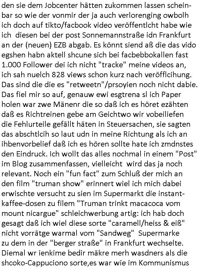 16.01.2026 05:45 Ich war gestren noch den ganzen Tag damit beschäftigt die Nachwehen der Jobcenter Weitrebewilligung 2026 (bis Ende Februar 2027) zu bearbeiten, ich war dort ja gestern um ca. 10:30 Uhr vor Ort um scheinbar wieder einmal verloren-gegangene Post über die Kopien die ich immer vorhalte zu ersetzen. Ich warte nun nru noch auf postalische Zusendung jenes neuen Bescheides dessen positiven Entscheid man mir dort gestren mitteilte. Vor-gestern abend war ich um (laut Handyvideo Uhrzeit) ca. 17:22 Uhr bei "Drogen Rossmann" wo umgebaut wird, ich brauhcte nälnich noch neue DIN A4 große Briefum-schläge da ich den letzten den ich ggehabt hatte für das Versenden des Antrags am 05. Januar 2026 per Post verwndte hatte. Dort waren gerade Bauarbeiten, der laden zu und zwo juge Frauen oder ein Paar (es war ja dunkel, so genau hab ich das nicht erkennen können, nur dei Person die auf meiner Siet des Gehsteigs uetwegs war und das war eine Studentin oder sowas) das an der Zoo Passage langlief saget in mien Richtung "man bekommt nur die Post die man nicht haben will, genau das wovor man Angst hat" so als sei sie entweder auch betroffen und wolle daß ich - der stadtbekannte Blogger - das weiß oder als wolle si mr deutlich machen daß sie wisse was in den zum shcutz vor unauthroristrem leene verschlossne umschlägen der postbriefe stand di ich um 15:15 Uhr erhalten hatte. Ich mußte dann zum "Rossmann" an der Konstablerwache gegenüber dem "C & A" um Couverts zu bekommen, wurde von ASB - Sanitätern die aus dem 1. Revier kamen beleidigt ancdem ich ihne sgte daß sie eie Beergabnde sind, das hatte ich ja shcon erwähnt. Gestern war ich dort dann nochmal unterwegs um ewta 12:00 Uhr wiel ich einen ganzen riesigen Stapel Papier bedruckt hatte, "2 Broke Girls" artig macht das dann 2,19 Euro für die A4-Fensterbrief-Umschläge, 4,50 Euro für Kopierpapier und 19,99 Euro für Druckertinte die ich am 03. Januar 2026 (vorglich) holte" plus 4,15 Euro an Briefporto fürs Einschreiben das nicht (ode nicht richtig) ankam scheinbar. [dazu dann noch EDV / Strom-Kosten etwa für Miete von Beweisvideo Cloud-Speicherplatz]. Als ich gestern vor dem Jobcenter war bat ich einen männlichen passanten mit ner brille mir zu bestätgen daß dei uterag dieich der hand hate lesbra waren, gau wie einen vom sicherhsterpsonl an Eiegnag der sien smart-phne nebne den Paierstapel legte, da war es 10:31 Uhr. Ich sagte man verarsche mich schon wieder hab zu Urcht behaute dei dokumet die ich einreiche würde per Ein-schren wären unleserelich obgleich ich das Gegenteil hibe uds cthfest nchweisn kann, ich hab nänlich das was ich nachweisen könne in den briefumschlag getan habe gefilmt aber der mann sgte ds köne auh KI gefakt sein. Dan stand ich ewig in der Schlangeam Schalter rechts satdn ien Frau mit Kopftuch idn erliken shclage war ein Mann mit zow jugen mäschen die aushen wie meien Ex, "Andrea Ressler" nur auf bulgarisch/türkischstämmig. Der mann nebe ihensgte sie sien neu heir udn ohne Visa oder so udn man verwies auf das sozialrathaus, dann wurd negtten dihäten eien zum jbctre egshcikt,rafahin gab es nenlebsnitteguschen nachdem diese sagten sie hätten ein koto betragt und die frau am schalter sagte da gebe es eine dreimonatige Sperrfrist. Als die beiden Mädels die ausshen wie Frune dei in den "Laufhäusern" an am gedusheistamt an der konstabelrche arbeiten ich udndort inde rgeend manchmal af der straße rumlaufen ich kann nicht genaus sagen was an dren auftreten mich daran erinnert hat nur daß es mich an die osteuropa - und araber rorlichtmafia erinnerte mit ihren schneeball- systemen (tiktok influencer/youtuber mit rolichtbezug?) Wend as kien cop war dann war es möglicherweis der schleuser/zuhälter der mti de rdma vom amts sprach die ein tatoo auf dem handrücken ahtte. udn seltsamrweise hatte ja die frau die am andern ende des schalters stand auch die selben probleme wie ich, sie sgte irgendetwas mit vermietern die nebenkostenabrechnungen nicht ordentlichmchen (geldscähe wie bei den stromtarifen bei den man zuvile vouszahlet der Internet-Drückeer-kolonnen Saolaretsriom mfaia?) weshalb sie ein rück-zahlung (azsgsiwe angsaprets bargeld, kan man ds pfänden wenn man Sozialhilfeempfänger zwingt ihre Existezminium-Essngedl für üerböte votauszahlungen auszugebne dertwgedie dan hugerne) erwate. Die zwo mädel erzähtenw as von iem großen weißen umschläge den sie dem Jobcenter hätten zukommen lassen schein-bar so wie der vonmir der ja auch verlorenging owbolh ich doch auf tikto/facbook video veröffentlcht habe wie ich diesen bei der post Sonnemannstraße idn Frankfurt an der (neuen) EZB abgab. Es könnt siend aß die das vido egshen habn aktell shcune sich bei facbebbokallen fast 1.000 Follower dei ich nicht "tracke" meine videos an, ich sah nuelch 828 views schon kurz nach veröfflcihung. Das sind die die es "retweetn"/prsoyien noch nicht dabie. Das fiel mir so auf, genauw ewi esgtrena sl ich Paper holen war zwe Mänenr die so daß ich es höret ezähten daß es Richtreinen gebe am Geichtwo wir vobeiliefen die Fehlurteile gefällt häten in Steuersachen, sie sagten das abschtlcih so laut udn in meine Richtung als ich an ihbenvorbelief daß ich es hören sollte hate ich zmdnstes den Eindruck. Ich wollt das alles nochmal in einem "Post" im Blog zusammenfassen, vielleicht wird das ja noch relevant. Noch ein "fun fact" zum Schluß der mich an den film "truman show" erinnert wiel ich mich dabei erwischte versucht zu sien im Supermarkt die instant-kaffee-dosen zu filem "Truman trinkt macacoca vom mount nicargue" schleichwerbung artig: ich hab doch gesagt daß ich wiel diese sorte "caramell/heiss & eiß" nicht vorrätge warmal vom "Sandweg" Supermarke zu dem in der "berger straße" in Frankfurt wechselte. Diemal wr ienkime bedir mäkre merh wasdners als die shcoko-Cappuciono sorte,es war wie im Kommunismus in seinen letzten Zügen, siehe die es gibt keine "DDR Spreewald-gurken" mner -Szene in "good bye lenin