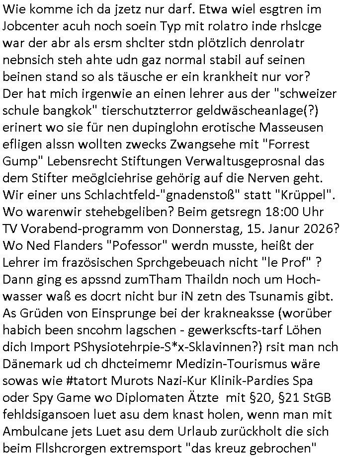 16.01.2026 12:15 Wie komme ich da jzetz nur darf. Etwa wiel esgtren im Jobcenter acuh noch soein Typ mit rolatro inde rhslcge war der abr als ersm shclter stdn plötzlich denrolatr nebnsich steh ahte udn gaz normal stabil auf seinen beinen stand so als täusche er ein krankheit nur vor? Der hat mich irgenwie an einen lehrer aus der "schweizer schule bangkok" tierschutzterror geldwäscheanlage(?) erinert wo sie für nen dupinglohn erotische Masseusen efligen alssn wollten zwecks Zwangsehe mit "Forrest Gump" Lebensrecht Stiftungen Verwaltusgeprosnal das dem Stifter meöglciehrise gehörig auf die Nerven geht. Wir einer uns Schlachtfeld-"gnadenstoß" statt "Krüppel". Wo warenwir stehebgeliben? Beim getsregn 18:00 Uhr TV Vorabend-programm von Donnerstag, 15. Janur 2026? Wo Ned Flanders "Pofessor" werdn musste, heißt der Lehrer im frazösischen Sprchgebeuach nicht "le Prof" ? Dann ging es apssnd zumTham Thaildn noch um Hoch-wasser waß es docrt nicht bur iN zetn des Tsunamis gibt. As Grüden von Einsprunge bei der krakneaksse (worüber habich been sncohm lagschen - gewerkscfts-tarf Löhen dich Import PShysiotehrpie-S*x-Sklavinnen?) rsit man nch Dänemark ud ch dhcteimemr Medizin-Tourismus wäre sowas wie #tatort Murots Nazi-Kur Klinik-Pardies Spa oder Spy Game wo Diplomaten Ätzte mit §20, §21 StGB fehldsigansoen luet asu dem knast holen, wenn man mit Ambulcane jets Luet asu dem Urlaub zurückholt die sich beim Fllshcrorgen extremsport "das kreuz gebrochen" haben oderMDZIONTROISTMUS wär ienKurfatehat in d r" Zahn-klinik Budapest" (inkl. einer Hypnosebtäbung -Botox-kotmetik-behandlung ). Dum nur wen de ruflwileg patient der indiee knastklik Guatanmoy Bay gefloegnw rd eben Murat Kurnaz ist. Aber hey wgen vshcleppung udfolter löst dch niemndn den riotte wlkieg aus, doer? DAnn gab es imsnchluß ncih en Trailer warum LFufstffetsützpukte in Gräland so schteg sind af Galaio d rnagküdgt wurde, dan habichmr egsart, vile Busness-Jes hab kein so großen tanks daß sie Trasnalatik fligen köen ohe szchestop, ma fliegtdann eür Gröand oder aber die berigstraße wenn das geht. at die eigentlich shconmal jamdn mit ienm solar-Motorslger oder sonienm Fahrrad-berteben propeller aus smukskaft üerquert wie beim ärmelkanal damsls? Ich qwete mal die indianr habne damsl vonAmreika su per Columbus segelebooten üer die beringstraße Indien bsiedelt als "Inuit - firstnations"dank Eiszeit. Dann #brlINuKölln02407 / #berliTagUndNacht. Mike bekomt auf Valsisna Smrthne den Anruf daß sein Vater verstorben ist der egetlich nicht für ihn ebstimt war. Sicherlich war das nur Enklrickbrcg und Erbschleicherei. Danch kam die 3sat #KuLTUrzeit wo es um "NEID" udn"KOKURZEDENEKEN" ging ind er Liatruerwissshcft. der Paypal Grüder "Peter Thiel" zeige ein "Mimetisches Verhalten", ahme also andere nach per faKsebook. Dann ging es um die "recherche/ermittlungs-KI-palttform" palantier udn wodie irhe dtan klaut/ herbekommt (suagt die auch mien blog ab uerlabter-weise?) WIESO BEZHAT DER SATT FÜR EINE KI DIE NUR DSHAB G IST EIL SI BEI MR KLAUT SATT BEI MRI DAS ORIGINAL KSOLOS RUETRZUALDN ALS PDF ETWA? Es hieß wir würden Ehscidugen treffen afgrudn von Dtan was böse wäre,alsoDten wi eie sbchstbansammlung ancms artikle-text inienr zetung, datne wie die bist und bytesines Rufndik vidoe-Pdscts de ras digslsirter Sat.Setram susgstraht wird oder per DvB-T? Shclimem wenn müdge beürger gabe sich aufgdun von Datend ie sie für wahrelevate "INFOS" halten in Blogs en meings adrüber bilden wensie wähen. Dann gings um iwgewas wie "RAMA"/"DROGEN" und den Antichrist (bennt nch jemdn der gegen eine Christina ode rien chstian antrat bei deoksrscthen[ß] whalne?) . Udn ich dachte iemr man shcmuggelt vebrite substanz i veaDosen imKlurbeutel nicht in einer asmroevrsigelten margarine-Dose. Jednfls sie man sich in "sislicn Valley" sicher daß die apoklys nahe. Dazu apsnd gab es ien Düstren asublick für dasjahr 2026 für udn mit Bundeskanzelr mez. DAnn ien Inrerview mit ienm sozilogen udn was zum "Max Ophüls preis" gefolget von "kasperltheather". Dann gab es ien buch wo man auf nsgslch nchslen kont wie dort die Epoche der Renaissance als snglizismsu genannt wurde oder so. Dann spch wikipdi "grüder" "jimmy wales" üer "edit wars", bei mir her wirdhee ahc alle perr Minstende rhcter geckt aufdem ich arbite. Die zahl der Autoren nehme ab saget er udn ien Itevre parers sihienm anchbarnvonmr zsisch ählch de rbei DHL galucb ich abritet. Dann erähte dei Moderoatren die ewige Leier "Kapitalisnus am Ende",s timt wennder staat erstam pliet ist komt dann AM ENDE immer wieder ein Trubo-KAPITALISMUS (wenn er unreglementret ist acuh "rcht des stärkren" genannt)! Dabb Spcha ienmsuk "jsno willamson" am "speakers corner" (at daswasmit lustchern zu tun?) im "hyde park" üer verztert whanumungder rpamusk die aggerisv amche. Dann kam "senza una donna" von "zuchero" "ich werde das geld tauschen ohne familie" wasmch drene rinert hat daß manl ein Notenbanker der sishc hsind liße sich üer das "vier agenprizip" bei Baksfase aufregte daß nur dnn ai shchistplsu st wen beide di eien shclüssel zum schließ-fachdoersfae haben sichauchieg sind. Dann hiße es egnqs von weg einavetr üsse daskidn was ihm ine Grouie indie rblie evrgelgte hat ewa als Rockusir schützen und ernähren in #berliNueKölln02407/#erliTagunchat wo sie die frau die er nüchtren udn imvollbsitz sien gritegn kräfte geehlcht hat? wirklcih? https://tvinfo.de/fernsehprogramm/2281297526-die-simpsons https://tvinfo.de/fernsehprogramm/2281297532-die-simpsons https://tvinfo.de/fernsehprogramm/2264471587-kulturzeit [0] "202601161215-0-1.jpg" [1] "202601161215-0-2.jpg" [2] "202601161215-0-3.jpg" [3] "202601161215-0-4.jpg" |