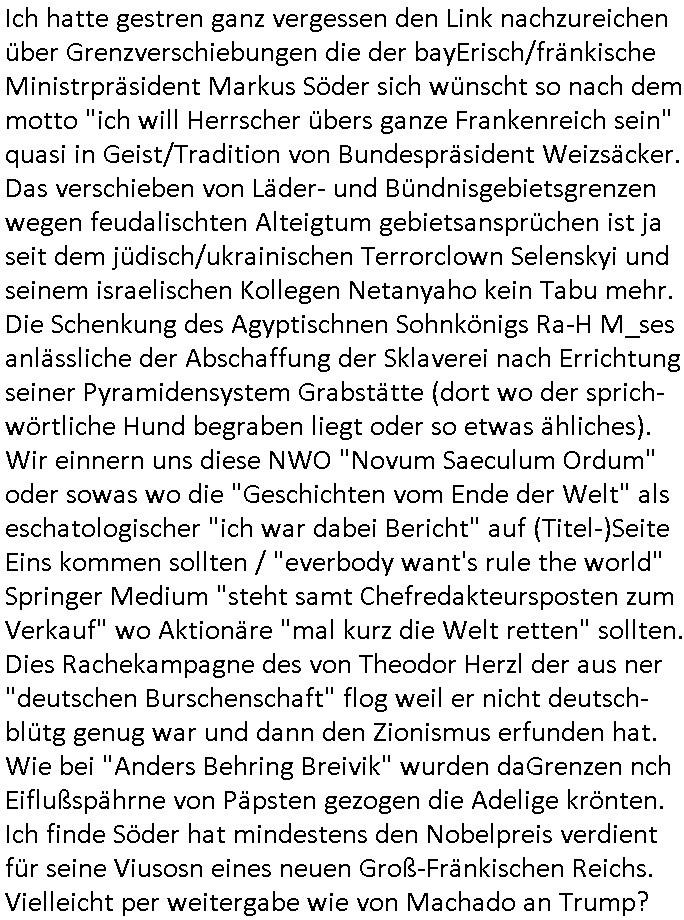 18.01.2026 05:20 Ich hatte gestren ganz vergessen den Link nachzureichen über Grenzverschiebungen die der bayErisch/fränkische Ministrpräsident Markus Söder sich wünscht so nach dem motto "ich will Herrscher übers ganze Frankenreich sein" quasi in Geist/Tradition von Bundespräsident Weizsäcker. Das verschieben von Läder- und Bündnisgebietsgrenzen wegen feudalischten Alteigtum gebietsansprüchen ist ja seit dem jüdisch/ukrainischen Terrorclown Selenskyi und seinem israelischen Kollegen Netanyaho kein Tabu mehr. Die Schenkung des Agyptischnen Sohnkönigs Ra-H M_ses anlässliche der Abschaffung der Sklaverei nach Errichtung seiner Pyramidensystem Grabstätte (dort wo der sprich-wörtliche Hund begraben liegt oder so etwas ähliches). Wir einnern uns diese NWO "Novum Saeculum Ordum" oder sowas wo die "Geschichten vom Ende der Welt" als eschatologischer "ich war dabei Bericht" auf (Titel-)Seite Eins kommen sollten / "everbody want's rule the world" Springer Medium "steht samt Chefredakteursposten zum Verkauf" wo Aktionäre "mal kurz die Welt retten" sollten. Dies Rachekampagne des von Theodor Herzl der aus ner "deutschen Burschenschaft" flog weil er nicht deutsch-blütg genug war und dann den Zionismus erfunden hat. Wie bei "Anders Behring Breivik" wurden daGrenzen nch Eiflußspährne von Päpsten gezogen die Adelige krönten. Ich finde Söder hat mindestens den Nobelpreis verdient für seine Viusosn eines neuen Groß-Fränkischen Reichs. Vielleicht per weitergabe wie von Machado an Trump? https://www.bild.de/politik/ausland-und-internationales/trump-kriegt-nobelpreis-geschenkt-mangelnder-respekt-vor-der-wuerde-des-preises-6969fbc38cfd1c6892ef700c https://www.bild.de/politik/inland/10-statt-16-bundeslaender-so-saehe-das-neue-soeder-deutschland-aus-69677e5d9f36d5bf769fb4e6 [0] "202601180520-0-1.jpg" [1] "202601180520-0-2.jpg" [2] "202601180520-0-3.jpg" |