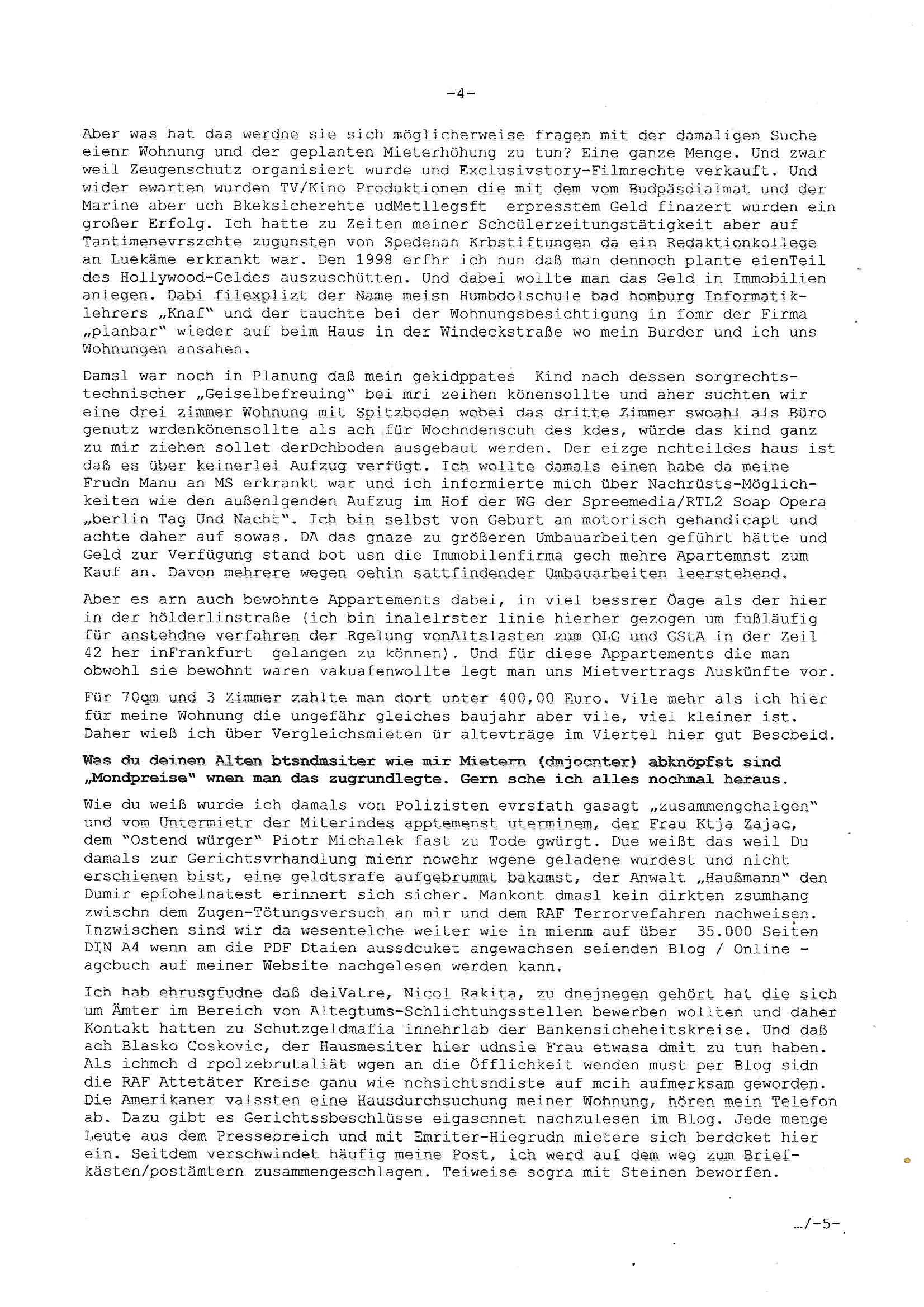 18.01.2026 18:30 Beweismittelvernichtung / Sicherung nach Solarstromanlagen-zählerstandsmanipulation, Erpressungen/lebensgefährliche Brände nach unsachgemäßer Wartung von Heizung / Aufzug tätlicher Angriffe deines Hausmeisters Coskovic auf mich siehe Video vom 06. November 2025 auf http://tiktok.maximilian.baehring.at Bin inzwischen nach Blutverlusten / Medikamentenvergiftung nach Polizei-brutalistätsexzessen (es gab Razzien gegen 17 Beamte) Rechrschteibinvalide trotz früheren Germanistik-Studiums. Maximilian Baehring Hoelderlinstrasse 4 D-60316 Frankfurt/M vorab per Fax: +49/(0)6172/2532220 Mile Rakita Kälberstücksweg 34 D-61350 Bad Homburg v.d. Höhe Frankfurt/M., den 18. Januar 2026 Mein Schreiben vom 04. Dezember 2025 (Einschreiben RT 0792 0777 2DE) vorab per Fax an die +49/(0)6172/2532220 am 04. Dezember 2025 um etwa 17:34 Uhr Ihr Schreiben hier soeben 04. Dezember 2025 ca. 14:15 Uhr eingegangen per Einschreiben Einwurf mit Post-Aufkleber Absendedatum des 28. November 2025 tragend mit Brief, insgesamt 3 Blatt je nur vorderseitig bedruckt, davon 2 Seiten Schreiben datiert auf den 27. November 2025 und 1 Rückantwort-Bogen Mein Schreiben vom 07. November 2025( Einschrieben RT 1019 3610 0DE vorab per Fax an die +49/(0)6172/2532220 am 07. November 2024, ca. 05:59 Uhr) Einschreiben RT 1019 3609 5DE vom 07. November 2025 an das LKA in Wiesbaden vorab per Fax an die +49/(0)611/327669122 am 06. November 2025 um 13:49 Uhr Onlinewache Strafanzeige Az.:2025-1106-1336-8161 Polizei Frankfurt 1257611/2025 „Whatsapp“ Nachrichten mit +49/(0)177/7777393, 13. Oktober 2025, 13:07–13:16 Uhr Mein Schreiben vom 05. Februar 2024( Einschrieben RR 9333 4210 4DE vorab per Fax an die +49/(0)6172/2532220 am 05. Februar 2024, ca 16:31 Uhr) An die Scheibe des im Hof parkendem schrzem Mercedes Gelädnewagen HG XX 9500 am 25. Mai 2022 nagebrchtes Schreiben sowei Mile Kovac persönlich mitgeteilt Mein Schreiben vom 23. März 2022( Einschrieben RR 9714 1735 5DE vorab per Fax an die +49/(0)6172/2532220 am 23. März 2022, ca 10:05 Uhr) Mein Schreiben vom 27. Februar 2022( Einschrieben RR 7963 6591 4DE vorab per Fax an die +49/(0)6172/2532220 am 27. Februar 2022, ca 11:23 Uhr) Mein Schreiben vom 20. Februar 2022( Einschrieben RR 7963 6517 1DE vorab per Fax an die +49/(0)6172/2532220 am 20. Februar 2022, ca 10:33 Uhr) Vermisstenanzeige vom 15. Februar 2022( Einschrieben RR 9215 9557 9DE vorab per Fax an die +49/(0)6172/120-189 am 15. Februar 2022, ca 12:09 Uhr und in Kopie per Fax an die +49/(0)6172/2532220 am 15. Februar, ca 12:13 Uhr) Schreiben an Nicola Rakita vom 31. Januar 2022( Einschrieben RR 7963 6224 6DE vorab per Fax an die +49/(0)6172/2532220 am 31. Januar 2022, ca 08:40 Uhr) Mein Schreiben vom 22. Januar 2022( Einschrieben RR 7963 6117 0DE vorab per Fax an die +49/(0)6172/2532220 am 12. Januar 2022, ca 17:58 Uhr) Telefonat von der +49/(0)174/3639226 auf die +49/(0)177/7777393 am 19. Januar 2022 von ca. 13:20 Uhr bis ca. 13:25 Uhr (Dauer 04:50 min) Mein Schreiben vom 14. Januar 2022( Einschrieben RR 9215 8587 7DE vorab per Fax an die +49/(0)6172/2532220 am 14. Jnauar 2022, ca 16:11 Uhr) Mein Schreiben vom 30. Dezember 2021( Einschrieben RR 9215 8099 9DE vorab per Fax an die +49/(0)6172/2532220 am 30. Dezember 2021, ca 11:58 Uhr) Mein Schreiben vom 10. Dezember 2021( Einschrieben RR 7963 5489 9DE vorab per Fax an die +49/(0)6172/2532220 am 10. Dezember 2021, ca 17:12 Uhr) Ihr Schreiben vom 08. hier eingegangen am 10. Dezemebr 2021 wegen eienr Mieterhöhung für meine Wohnung Hölderlinstraße 4, 60136 Frankfurt am Main Mile (Rakita), Herr Nicola Rakita, Mile Kovac, Familie Rakita! b.(itte) w.(enden) Am 04. Dezember 2025 habe ich im umseitigen Betreff zuerst aufgelistetes Antwort -Schreiben auf ihren Brief datiert auf den 28. November 2025 versendet und zwar vorab per Telefax, per Deutsch Post Einschreibebrief, per E-Mail / Blog-Internet und als PDF ausgehende „Whatsapp“ Messenger Nachricht an die +49/(0)177/7777393 [eingehende Nachrichten sind für den „Whatsapp“ Dienst sind bei mir aus formal- juristischen Gründen blockiert, genau wie Nachrichten andrer Messaging-Dienste]. In ihrem Brief vom 28. November 2026 erbitten sie meine Stellungnahme/Zustimmung für eine neue monatliche Zusatzzahlung, von Ihnen „Mietanpassung“ genannt. Dabei führen sie an daß die angestrebte Miete ortsüblich sei und die Kosten gestiegen. Um ostüblche Vergleichsmieten zu belegen führen sie drei andere Mietvertrags-Verhältnisse hier im Hause – alles Verträge mit Ihnen als dem Vermieter – auf von, wie sie behaupten, vergleichbaren Wohnungen. Ich stell hierzu folgend fest: Die anderen Wohnungen hier haben (anders als mein Dachgeschoss Appartement) oft-mals einen Balkon, keinerlei die qm-Zahl der Wohnfläche mindernden Dachschrägen und zudem eine Zustiegsmöglichkeit zum Fahrstuhl / Aufzug die „ebenerdig“ ohne zusätzliche Treppen zu steigen wie in meiner Etage erreicht werden kann. Man hat dort zudem überwiegende ein Tageslicht-Fenster in einer richtigen Küche anstatt wie bei mir nur eine extrem enge Kochniesche in die keine Stanrdgröße Einbau-geräte passen. Die Bäder in den anderen Wohnungen sind Wannenbäder und von der Fläche her vile üppiger bemessen, dort ist platz für Waschmaschinen, ich aber habe lediglich ein extrem eng bemessenes Duschbad, derart eng das am Heizkörper nicht mal ein richtiger Thermostat verbaut werden konnte. Von vergleichbar kann also nicht im geringsten die Rede sein. Die Mietsteigerung die sie begehren ist seit ich die Wohnung Mai 2006 anmietete (damals war hier noch überall Baustelle, ich mußte daher damals oft bei meiner damaligen Lebensgefährtin Manuela Nowatius, Edith-Stein-Straße, Heusenstamm das Bad in Anspruch nehmen und übernachten) die inzwischen Dritte, die erste Miet-erhöhung kam versteckt per Einbau einer Photovoltaikanlage als der vorher im Pauschal/Komplett-Mietpreis (Sie vermieteten die Appartemens als all-inclusive Rundum Sorglos Paket