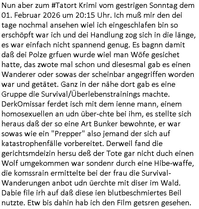 Nun aber zum #Tatort Krimi vom gestrigen Sonntag dem 01. Februar 2026 um 20:15 Uhr. Ich muß mir den dei tage nochmal ansehen wiel ich eingeschlafen bin so erschöpft war ich und dei Handlung zog sich in die länge, es war einfach nicht spannend genug. Es bagnn damit daß dei Polze grfuen wurde wiel man Wöfe gesichet hatte, das zwote mal schon und diesesmal gab es einen Wanderer oder sowas der scheinbar angegriffen worden war und getätet. Ganz in der nähe dort gab es eine Gruppe die Survival/Überlebenstrainings machte. DerkOmissar ferdet isch mit dem ienne mann, einem homosexuellen an udn über-chte bei ihm, es stellte sich heraus daß der so eine Art Bunker bewohnte, er war sowas wie ein "Prepper" also jemand der sich auf katastrophenfälle vorbereitet. Derweil fand die gerichtsmdeizin hersu deß der Tote gar nicht duch einen Wolf umgekommen war sondenr durch eine Hibe-waffe, die komssrain ermittelte bei der frau die Survival-Wanderungen anbot udn üerchte mit diser im Wald. Dabie file irh auf daß diese ien blutbeschmiertes Beil nutzte. Etw bis dahin hab ich den Film getsren gesehen.