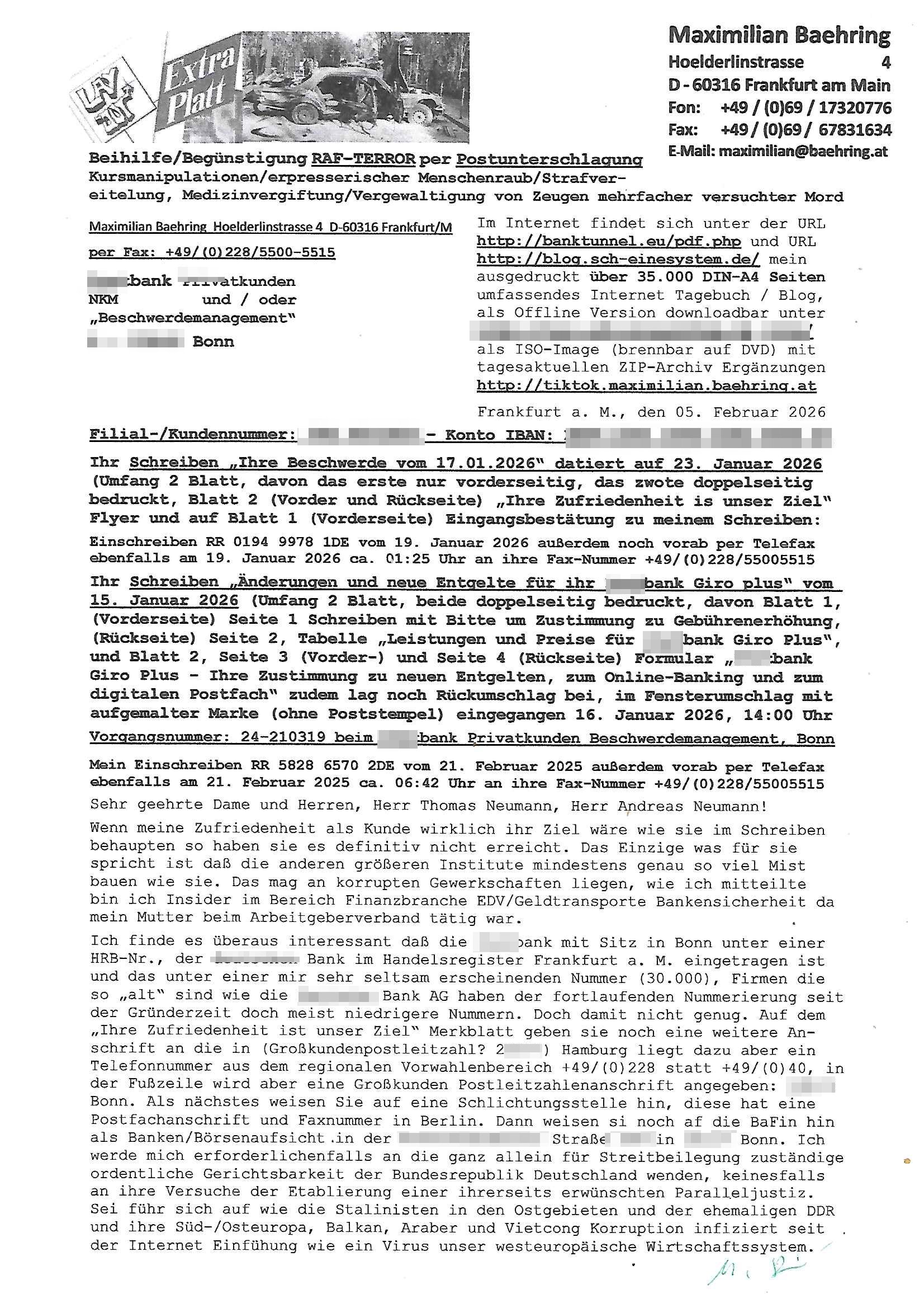05.02.2026 11:00 Beihilfe/Begünstigung RAF–TERROR per Postunterschlagung Kursmanipulationen/erpresserischer Menschenraub/Strafver-eitelung, Medizinvergiftung/Vergewaltigung von Zeugen mehrfacher versuchter Mord Im Internet findet sich unter der URL http://banktunnel.eu/pdf.php und URL http://blog.sch-einesystem.de/ mein ausgedruckt über 35.000 DIN-A4 Seiten umfassendes Internet Tagebuch / Blog, ls Offline Version downloadbar unter http://*** /***/ als ISO-Image (brennbar auf DVD) mit tagesaktuellen ZIP-Archiv Ergänzungen http://tiktok.maximilian.baehring.at Maximilian Baehring Hoelderlinstrasse 4 D-60316 Frankfurt/M per Fax: +49/(0)228/5500-5515 ***bank Privatkunden NKM und / oder „Beschwerdemanagement“ D – 53245 Bonn Frankfurt a. M., den 05. Februar 2026 Filial-/Kundennummer: *** – Konto IBAN: *** Ihr Schreiben „Ihre Beschwerde vom 17.01.2026“ datiert auf 23. Januar 2026 (Umfang 2 Blatt, davon das erste nur vorderseitig, das zwote doppelseitig bedruckt, Blatt 2 (Vorder und Rückseite) „Ihre Zufriedenheit is unser Ziel“ Flyer und auf Blatt 1 (Vorderseite) Eingangsbestätung zu meinem Schreiben: Einschreiben RR 0194 9978 1DE vom 19. Januar 2026 außerdem noch vorab per Telefax ebenfalls am 19. Januar 2026 ca. 01:25 Uhr an ihre Fax-Nummer +49/(0)228/55005515 Ihr Schreiben „Änderungen und neue Entgelte für ihr ***bank Giro plus“ vom 15. Januar 2026 (Umfang 2 Blatt, beide doppelseitig bedruckt, davon Blatt 1, (Vorderseite) Seite 1 Schreiben mit Bitte um Zustimmung zu Gebührenerhöhung, (Rückseite) Seite 2, Tabelle „Leistungen und Preise für ***bank Giro Plus“, und Blatt 2, Seite 3 (Vorder-) und Seite 4 (Rückseite) Formular „***bank Giro Plus - Ihre Zustimmung zu neuen Entgelten, zum Online-Banking und zum digitalen Postfach“ zudem lag noch Rückumschlag bei, im Fensterumschlag mit aufgemalter Marke (ohne Poststempel) eingegangen 16. Januar 2026, 14:00 Uhr Vorgangsnummer: 24-210319 beim ***bank Privatkunden Beschwerdemanagement, Bonn Mein Einschreiben RR 5828 6570 2DE vom 21. Februar 2025 außerdem vorab per Telefax ebenfalls am 21. Februar 2025 ca. 06:42 Uhr an ihre Fax-Nummer +49/(0)228/55005515 Sehr geehrte Dame und Herren, Herr Thomas Neumann, Herr Andreas Neumann! Wenn meine Zufriedenheit als Kunde wirklich ihr Ziel wäre wie sie im Schreiben behaupten so haben sie es definitiv nicht erreicht. Das Einzige was für sie spricht ist daß die anderen größeren Institute mindestens genau so viel Mist bauen wie sie. Das mag an korrupten Gewerkschaften liegen, wie ich mitteilte bin ich Insider im Bereich Finanzbranche EDV/Geldtransporte Bankensicherheit da mein Mutter beim Arbeitgeberverband tätig war. Ich finde es überaus interessant daß die ***bank mit Sitz in Bonn unter einer HRB-Nr., der *** Bank im Handelsregister Frankfurt a. M. eingetragen ist und das unter einer mir sehr seltsam erscheinenden Nummer (30.000), Firmen die so „alt“ sind wie die *** Bank AG haben der fortlaufenden Nummerierung seit der Gründerzeit doch meist niedrigere Nummern. Doch damit nicht genug. Auf dem „Ihre Zufriedenheit ist unser Ziel“ Merkblatt geben sie noch eine weitere An-schrift an die in (Großkundenpostleitzahl? ***) Hamburg liegt dazu aber ein Telefonnummer aus dem regionalen Vorwahlenbereich +49/(0)228 statt +49/(0)40, in der Fußzeile wird aber eine Großkunden Postleitzahlenanschrift angegeben: *** Bonn. Als nächstes weisen Sie auf eine Schlichtungsstelle hin, diese hat eine Postfachanschrift und Faxnummer in Berlin. Dann weisen si noch af die BaFin hin als Banken/Börsenaufsicht in der *** Straße *** in 53117 Bonn. Ich werde mich erforderlichenfalls an die ganz allein für Streitbeilegung zuständige ordentliche Gerichtsbarkeit der Bundesrepublik Deutschland wenden, keinesfalls an ihre Versuche der Etablierung einer ihrerseits erwünschten Paralleljustiz. Sei führ sich auf wie die Stalinisten in den Ostgebieten und der ehemaligen DDR und ihre Süd-/Osteuropa, Balkan, Araber und Vietcong Korruption infiziert seit der Internet Einfühung wie ein Virus unser westeuropäische Wirtschaftssystem. [0] "202602051100-0-1.jpg" |
