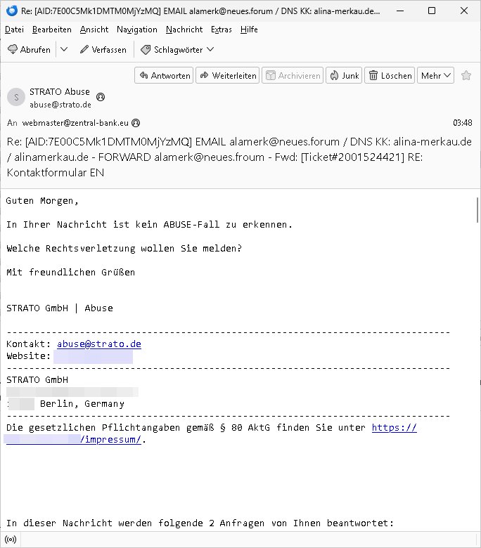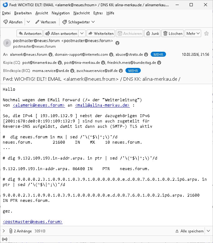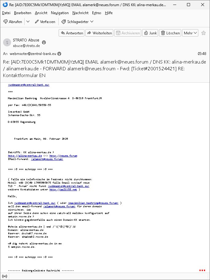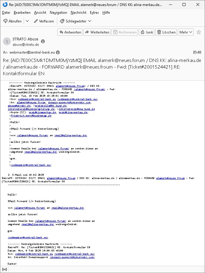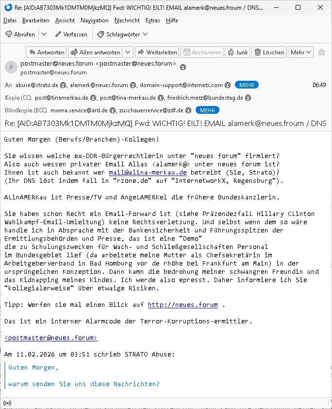 11.02.2026 06:49 -------- Nachricht -------- Betreff: Re: [AID:AB7303Mk1DMTM0MjkzMQ] Fwd: WICHTIG! EILT! EMAIL alamerk@neues.froum / DNS KK: alina-merkau.de / alinamerkau.de - FORWARD alamerk@neues.froum - Fwd: [Ticket#2001524421] RE: Kontaktformular EN Datum: Wed, 11 Feb 2026 06:49:51 +0100 Von: postmaster@neues.forum <postmaster@neues.forum> An: abuse@strato.de, alamerk@neues.forum, domain-support@internetx.com, abuse@strato.de, poststelle@bk.bund.de, internetpost@bundesregierung.de, internetpost@bpa.bund.de Kopie (CC): post@tinamerkau.de, post@tina-merkau.de, friedrich.merz@bundestag.de Guten Morgen (Berufs/Branchen)-Kollegen! Sie wissen welche ex-DDR-Bürgerrechtlerin unter "neues forum" firmiert? Also auch wessen privater Email Alias <alamerk@> unter neues forum ist? Ihnen ist auch bekannt wer mail@alina-merkau.de betreibt (Sie, Strato)? (Ihr DNS löst indem fall in "rzone.de" auf "InternetworkX, Regensburg"). ALinAMERKau ist Presse/TV und AngeLAMERKel die frühere Bundeskanzlerin. Sie haben schon Recht ein Email-Forward ist (siehe PräzendezfalL Hillary CLinton Wahlkampf-Email-Umleitung) keine Rechtsverletzung. Und selbst wenn dem so wäre handle ich in Absprache mit der Bankensicherheit und Führungsspitzen der Ermittlungsbehörden und Presse, das ist eine "Demo" die zu Schulungszwecken für Wach- und Schließgesellschaften Personal im Bundesgebiet lief (da arbeitete meine Mutter als Chefsekretärin im Arbeitgeberverband in Bad Homburg vor de rhöhe bei Frankfurt am Main) in der ursprüngelchen Konzeption. Dann kamn die bedrohung meiner schwangren Freundin und das Kidnapping meines Kindes. Ich werde also epresst. Daher informiere ich Sie "kollegialerweise" über etwaige Risiken. Tipp: Werfen sie mal einen Blick auf http://neues.forum . Das ist ein interner Alarmcode der Terror-Korruptions-ermittler. <postmaster@neues.forum> Am 11.02.2026 um 03:51 schrieb STRATO Abuse: > Guten Morgen, > > warum senden Sie uns diese Nachrichten? [...] === -------- Weitergeleitete Nachricht -------- Betreff: Re: [AID:7E00C5Mk1DMTM0MjYzMQ] EMAIL alamerk@neues.forum / DNS KK: alina-merkau.de / alinamerkau.de - FORWARD alamerk@neues.froum - Fwd: [Ticket#2001524421] RE: Kontaktformular EN Datum: Wed, 11 Feb 2026 03:48:21 +0100 Von: STRATO Abuse <abuse@strato.de> Antwort an: abuse@strato.de An: webmaster@zentral-bank.eu Guten Morgen, In Ihrer Nachricht ist kein ABUSE-Fall zu erkennen. Welche Rechtsverletzung wollen Sie melden? Mit freundlichen Grüßen STRATO GmbH | Abuse ------------------------------------------------------------------------------- Kontakt: abuse@strato.de Website: *** ------------------------------------------------------------------------------- STRATO GmbH *** *** Berlin, Germany ------------------------------------------------------------------------------- Die gesetzlichen Pflichtangaben gemäß § 80 AktG finden Sie unter https://***/impressum/ . In dieser Nachricht werden folgende 2 Anfragen von Ihnen beantwortet: === -------- Weitergeleitete Nachricht -------- Betreff: Re: [AID:7E00C5Mk1DMTM0MjYzMQ] EMAIL alamerk@neues.forum / DNS KK: alina-merkau.de / alinamerkau.de - FORWARD alamerk@neues.froum - Fwd: [Ticket#2001524421] RE: Kontaktformular EN Datum: Wed, 11 Feb 2026 03:48:21 +0100 Von: STRATO Abuse <abuse@strato.de> Antwort an: abuse@strato.de An: webmaster@zentral-bank.eu Guten Morgen, In Ihrer Nachricht ist kein ABUSE-Fall zu erkennen. Welche Rechtsverletzung wollen Sie melden? Mit freundlichen Grüßen STRATO GmbH | Abuse ------------------------------------------------------------------------------- Kontakt: abuse@strato.de Website: *** ------------------------------------------------------------------------------- STRATO GmbH *** *** Berlin, Germany ------------------------------------------------------------------------------- Die gesetzlichen Pflichtangaben gemäß § 80 AktG finden Sie unter https://***/impressum/ . In dieser Nachricht werden folgende 2 Anfragen von Ihnen beantwortet: 1. E-Mail vom 10.02.2026 Betreff: EMAIL alamerk@neues.forum / DNS KK: alina-merkau.de / alinamerkau.de - FORWARD alamerk@neues.froum - Fwd: [Ticket#2001524421] RE: Kontaktformular EN --------------------------------------------------------------------------- SSL auf 443 aktiv EMAIL/TLS (noch) nicht wird das benötgte (braucht wegen HTTPS abwärtkompatibilität jedesmal ne IPv4, da würde dann eine eigene sendmail instanz für laufen ) gez. <webmaster@zentral-bank.eu> -------- Weitergeleitete Nachricht -------- Betreff: Domain Control Validation for Order #*** (Reference #***) Datum: Sat, 07 Feb 2026 18:38:40 +0000 Von: Sectigo Certification Authority <noreply_support@trust-provider.com> An: webmaster@neues.forum <webmaster@neues.forum> SECTIGO Domain Control Validation Dear webmaster@neues.forum, We have received order #***. This order was placed by a person whose email address is webmaster@neues.forum *Domain Control Validation for Domain:* www.neues.forum *Organization:* Not Applicable To complete domain control validation for the above-mentioned domain, please click the button below to navigate to the webpage to enter the following "validation code": * <***> * Complete Domain Control Validation < https://secure.***/products/EnterDCVCode?orderNumber=*** > Please make sure *reference #**** matches the one you will see when entering the validation code. *PLEASE NOTE CHOOSING THE OPTION BELOW WILL REJECT THE CERTIFICATE!* If neither you nor a trusted colleague made this request for a certificate then you can reject it by browsing to Reject < https://secure.***/products/RejectDCVCode?orderNumber=***&dcvCode=***V > *Thank you for being a valued Sectigo customer. * twitter icon < https://***/SectigoHQ > linked icon < https://www.***/sectigo> youtube icon <https:// www.***/Sectigo > visit our website < http://www.***/ > get supported < https://support.***/ > Copyright © Sectigo Limited, All rights reserved. >-------- Weitergeleitete Nachricht -------- >Betreff: WITCHIG! EILT! EMAIL alamerk@n