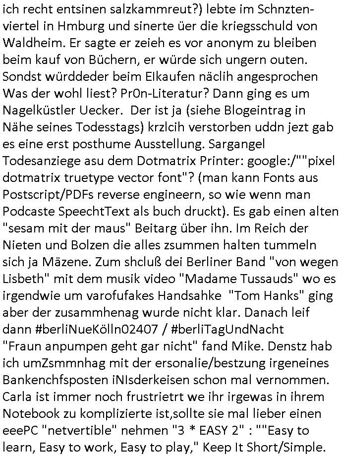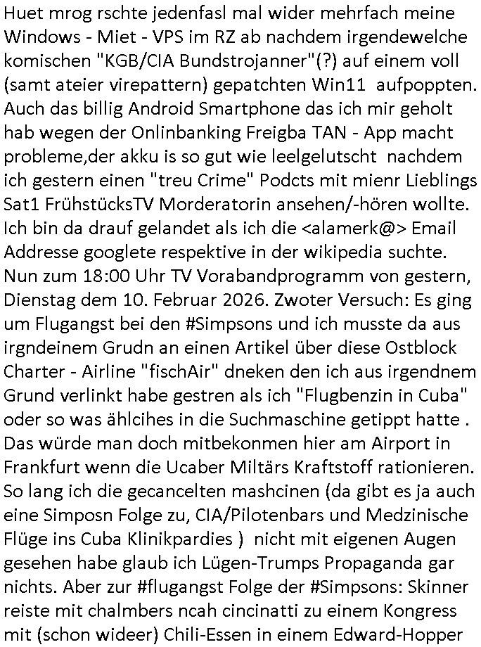 11.02.2026 08:15 Huet mrog rschte jedenfasl mal wider mehrfach meine Windows - Miet - VPS im RZ ab nachdem irgendewelche komischen "KGB/CIA Bundstrojanner"(?) auf einem voll (samt ateier virepattern) gepatchten Win11 aufpoppten. Auch das billig Android Smartphone das ich mir geholt hab wegen der Onlinbanking Freigba TAN - App macht probleme,der akku is so gut wie leelgelutscht nachdem ich gestern einen "treu Crime" Podcts mit mienr Lieblings Sat1 FrühstücksTV Morderatorin ansehen/-hören wollte. Ich bin da drauf gelandet als ich die <alamerk@> Email Addresse googlete respektive in der wikipedia suchte. Nun zum 18:00 Uhr TV Vorabandprogramm von gestern, Dienstag dem 10. Februar 2026. Zwoter Versuch: Es ging um Flugangst bei den #Simpsons und ich musste da aus irgndeinem Grudn an einen Artikel über diese Ostblock Charter - Airline "fischAir" dneken den ich aus irgendnem Grund verlinkt habe gestren als ich "Flugbenzin in Cuba" oder so was ählcihes in die Suchmaschine getippt hatte . Das würde man doch mitbekonmen hier am Airport in Frankfurt wenn die Ucaber Miltärs Kraftstoff rationieren. So lang ich die gecancelten mashcinen (da gibt es ja auch eine Simposn Folge zu, CIA/Pilotenbars und Medzinische Flüge ins Cuba Klinikpardies ) nicht mit eigenen Augen gesehen habe glaub ich Lügen-Trumps Propaganda gar nichts. Aber zur #flugangst Folge der #Simpsons: Skinner reiste mit chalmbers ncah cincinatti zu einem Kongress mit (schon wideer) Chili-Essen in einem Edward-Hopper "nighthawks" artigen Gastro-Betrieb. Beide hatten nen Zwischenstop bei ner Richterin, Anhalter mitgenommen, sich mit Bikern mit Trainingsdaten Computern angelegt. In teil zwo ging es um die entwicklerin von einem Navi Satellittensystem Gladys West zu der Lisa referierte. Sie spionieret außerdemaus daß ihre lehrerin bei der sie sich entschuldigen sollte Rückenprobleme hatte. Dann kam #berlinNueKölln02407 / #berlinTagUndNacht, Carlas Chfe strengt diszipliarrechtliche Ermittlungen gegen sie an und sie ist frustriert da sie den Computer - Fehler nicht findet deretwegen Akte verschwinden/geleakt werden. DAnn erfhren wir noch daß Bruno Blumeebstellt hat und emmi soch shcon freute aber die waren gar nicht für sie. Dann begann die 3sat #Kulturzeit. Es gehe ein "Riss durch Deutschland" besagte eine eingeblendte Stdio-Grafik. Die Autorin "Jana Hensel" stellte ihre neues Buch "es war einmal ein Land" vor, das voherieg das sie schrieb heißt "Zonenkinder" erfuhr man. Dann gab es ein Interview wo es hieß der AfD - Politiker "Timo Chrupalla" sei eiegech nur ein gescheiter-ter (glükloser doer unfäger?) Unter-nehmer der sich zusammen mit andern Ossi-Arbeitslosen radikalisiere. Dan zeigte man ne #berlinale" Retrospektiv" "win o change" wo 1992 inRumänine Caucescu mit dem Heli evakuiert werden musste voNSzialkärften vom Dach eines Regierungsgebäudes udn wie er danach trotzdem später erschossn im saatlchen Fernshen gezeigt wurde. Der annkam mir irgendwie bakannt vor. Spielt der denn vielleicht bei HBOmax SPY/Master mit oder sowas? Dann ginges um einen Film "der Kontrolleur" über den Personalabbau an der früheren Zonengrenze und die Angst vor Vandalismus an Grenzanlagen/Zäunen usw. . Ich mein wer will sowas schon haben, für wen ist das wert-voll? warende Luet amals nicht eher froh wenn das alle beseitget wurde? Ic muß gerade an #Schtonk denken die Anfangsszene mit dem Antiquitätenhandel. Dan ien beitrag "so schnell geht es nach Dresden" von Andreas Dresen. Und dann kam "hola rennt" mit "Bleibtreu" von "Tim Twyker" oder so. Der hat docjhso tolle Soundtracks beigesteuert zu "Babylohn Berlin", oder war das "Bar-dalimenti",ich galb ich verwechle gerade diesen Kapital-Flucht "brger kind geburtstagskrone" Juwelenraub Film mit irgendnem "pakt der Wölfe" Grenzregion - Morde Krimi. Sows häuft sich ja dier sich Grenzen verschieben, sihe Ukraine oder Gaza. Dann gabs nen "Bullet Tanz" in Dresdn von der Sempron (R)TM Oper "BY WAYS" wo eine "Frankfurt (oder?) ganz Kompanie" mitwirkte. Dann die Sängerin "Embassy of Sound" die "Sirens" von dem album "undRte" zum ebsten gab. Darauf folget dann ein asiattscher kinofilm "Winter in Sokcho" der i Kino kam. Damnach ging es um ein vehrdienst-kritischen Roman "im ertsen licht" von "noerbet gstrein". Er berichtete über ein Vater der den Sohn zum Invaldien verstümmelte um ihn vor dem Kriegsdienst zu retten. Man zeigte Bilder von "Gesichtsverletzten". Der östereichisch Autor (so ich recht entsinen salzkammreut?) lebte im Schnzten-viertel in Hmburg und sinerte üer die kriegsschuld von Waldheim. Er sagte er zeieh es vor anonym zu bleiben beim kauf von Büchern, er würde sich ungern outen. Sondst würddeder beim EIkaufen näclih angesprochen Was der wohl liest? Pr0n-Literatur? Dann ging es um Nagelküstler Uecker. Der ist ja (siehe Blogeintrag in Nähe seines Todesstags) krzlcih verstorben uddn jezt gab es eine erst posthume Ausstellung. Sargangel Todesanziege asu dem Dotmatrix Printer: google:/""pixel dotmatrix truetype vector font"? (man kann Fonts aus Postscript/PDFs reverse engineern, so wie wenn man Podcaste SpeechtText als buch druckt). Es gab einen alten "sesam mit der maus" Beitarg über ihn. Im Reich der Nieten und Bolzen die alles zsummen halten tummeln sich ja Mäzene. Zum shcluß dei Berliner Band "von wegen Lisbeth" mit dem musik video "Madame Tussauds" wo es irgendwie um varofufakes Handsahke "Tom Hanks" ging aber der zusammhenag wurde nicht klar. Danach leif dann #berliNueKölln02407 / #berliTagUndNacht "Fraun anpumpen geht gar nicht" fand Mike. Denstz hab ich umZsmmnhag mit der ersonalie/bestzung irgeneines Bankenchfsposten iNIsderkeisen schon mal vernommen. Carla ist immer noch frustrietrt we ihr irgewas in ihrem Notebook zu komplizierte ist,sollte sie mal lieber einen eeePC "netvertible" nehmen "3 * EASY 2" : ""Easy to learn, Easy to work, Easy to play," Keep It Short/Simple. Statt Blumen zubekomen solle Emmi IKEA-BANA japan steck-kunst artige welche zusammenstellen, ich habe