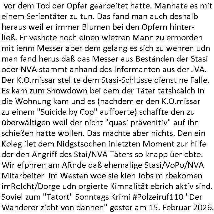 16.02.2026 06:00 Nun zum #Tatort Krimi gestern, es ging da um einen (auf den ersten Blick zumindest) Badeunfall wo ein Radio ins Badewasser gefallen zu sein schien. Aber dann kam auf-grund iens hakelnden Schlosses heraus Mann der sich als Hausmeister ausgab Nachschlüssel gehabt hatte die nicht mehr richtig passten weil noch jemand anders ebenfalls Nachschlüssel hatte. Der "Bart" des Nachschlüssels vom Hausmeister passte nicht ins Schloss. Es gab da eine Art Wasserschaden und der Hausmeister sagte er sei ja nur in der Wohnung gewesen um dort Wasser abzudrehen. Das erinnert mich an die Sabotageakte am Spülkasten und Abwasser sowie am Aufzug-Abstellraumschloss hier. Und an den Wasserschaden gegenüber dem Kolping-Haus wo früher der "pit-Stop" war und dann anschließend neu gebaut wurde am JÜDISCHEN FRIEDHOF/MUSEUM. Ich habe das im Film gestern nicht so richtig mitbekommen aber es gab noch ein zweiten Todesfall der nach einem Unfall aussah und dort tazchte ein Tagebuch auf wo von einem getauschten Schloss die Rede war und in beiden Fällen gab es somit Spuren die zu einem Schlüsseldienst führten. Der Ostblock-stämmge-Komissar erinnerte sich daran daß die "Stasi" Experten für Wohnungseinbrüche gehabt hate und er befragte einen Zeugen in einer JVA. Dieser bestätigte ihm daß Ostblock-Spione in Wohnungen einbrechen. Der asu dem Ostblock satmende Kommissar hatte die ganze Zeit schon so "ein Gefühl gehabt" daß da jemand an den ganzen Mord-Tatorten ein und ausge- gangen war der dort jeweils nicht zum Haushalt gehörte. Es kam heraus daß der potentielle Täter vom Schlüssel- dienst eine Bardnaare im Gesicht hatte ganz genau wie der "Schlüsselmeister" der Stasi nach dem man fahndete. Dann gab es noch eine Art Nebenspur/Handlung wo ne Frau auftauchte die in einer Selbsthilfgruppe war weil sie "nicht nein sagen konnte" bei Beziehugen, so wie das bei Opfern vorkommt die man mit denselben Psyochdrogen vergiftet hat wie mich beginnend 1998/99 als man mich quasi unter Ausnutzung dieser Vergiftung vergewaltigte um mich erpressen zu können mit entführten aus der Ver-gewaltigung hervorgegangenen Kindern. Diese wollte zu ihrer neuen bi- oder homosexuellen Freundin ziehen aus der Selbsthilfgruppe. Wahrscheinlich war von denen je-mand obachlos weil die Nymphomanie - Sucht an der diese Frau litt dazu führt daß Ehen zerbrechen und sich damit die nach dem altem Scheidungs-recht Ehebrecherin das auf dem Schuldprinzip am schcitern der ehe beruht ne neue Bleibe suchen muß. Ich hatte ja bereits einmal darauf hingewiesen daß per Scheidung/Trennung der Markt für Wohnungen dramatisch überbelastet ist. Die Frau kann aber auch kaum allein leben wie sie ausgenutzt wird. So wie eine Drogensüchtige die sich prostiuierte um so an Geld für Alkohol/Drogen/Zigaretten zu kommen. Es gab dann auf der Suche nach diesem "Schlüsselmann" nen weitern Keichenfund und man fand per Unterlagen seiner Buchhaltung heraus daß er an allen Fundorten kurz vor dem Tod der Opfer gearbeitet hatte. Manhate es mit einem Serientäter zu tun. Das fand man auch deshalb heraus weil er immer Blumen bei den Opfern hinter- ließ. Er veshcte noch einen wietren Mann zu ermorden mit ienm Messer aber dem gelang es sich zu wehren udn man fand herus daß das Messer aus Beständen der Stasi oder NVA stammt anhand des Informanten aus der JVA. Der K.O.missar stellte dem Stasi-Schlüsseldienst ne Falle. Es kam zum Showdown bei dem der Täter tatshcälch in die Wohnung kam und es (nachdem er den K.O.missar zu einem "Suicide by Cop" auffoerte) schaffte den zu überwältigen weil der nicht "quasi prävenitiv" auf ihn schießen hatte wollen. Das machte aber nichts. Den ein Koleg ilet dem Nidgstsochen inletzten Moment zur hilfe der den Angriff des Stai/NVA Täters so knapp üerlebte. Wir efphren am ARnde daß ehemalige Stasi/VoPo/NVA Mitarbeiter im Westen woe sie kien Jobs m rbekomen imRolcht/Dorge udn orgierte Kimnalität ebrich aktiv sind. Soviel zum "Tatort" Sonntags Krimi #Polzeiruf110 "Der Wanderer zieht von dannen" gester am 15. Februar 2026. https://tvinfo.de/fernsehprogramm/2288997141-polizeiruf-110 [0] "202602160600-0-1.jpg" [1] "202602160600-0-2.jpg" [2] "202602160600-0-3.jpg" |