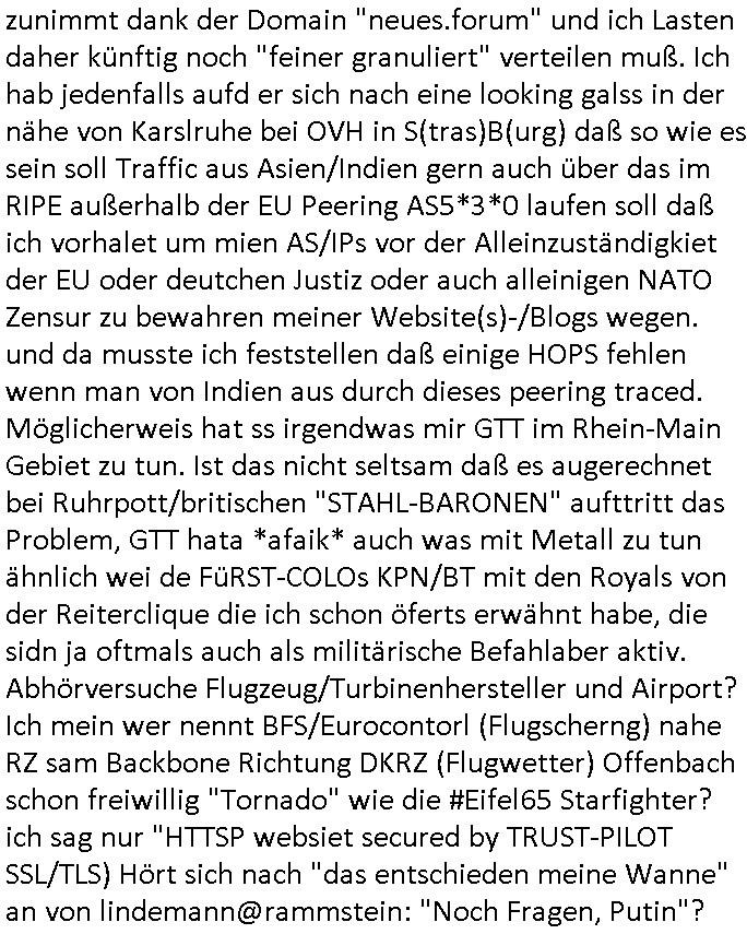 16.02.2026 10:00 Erinert sich noch jamadn ans Thema "Computer-Inder"? Die RAF Herrhausen Juwelenraub Inventur wo mien System den USP (als qaleisntellungsmerkmal] hatte daß es tehrostche in de Lage war per GUPTA-SQL Daten mit der Vercherunsgiscfts auszutauschen? Gupta ist Indisch. Genau wie der Telco-Provider TATA ähnlich "TATA STEEL". Multimilliardär TATA, eine Art "Krupp/Merton" versuhcte das selbe zu tun wie Konkurent ARCOR / MANNESMANN (heute: vodafone). Ich habe ja schon gesagt es gibt da einen Zusammenhang zur angeblichen Ölwett-Pleite der Metallgesellschaft AG. Von der im Prinzip all größeren Stahlwerke udn damit acuh die Rüstungindustriee abhängig sind, etwa "WOLFRAM" des Konzerns Jüdscher grder für "Israal Military Indusrty". Ich hab doch gesgat daß das HANSAviertel (wie Deutsche Lufthansa) AS6427 RIPE 6331 PROBE Looking Glass die Problemee ach daß IPv6 in Berlin [die 2001:678:de0::9 ] übers Ruhrgebiet (myloc/WIIT) umleitet unerlaubt [2001:678:de0::11]. Man muß sich mal anshen wer das ist,soweit ich entsinne vom WWW Erfindung Schüler-zeitungs-meeting in Bad Homburg her ist da einealte Mannesmann Logistik/Spedition : Deutsche Bahn und Bank. (sieh was ich zu CyrusOne/Börse sagte und dem zwotn NTT Standort neben Hanauer Land 30X [peeren am CIX da irgendwo Österreicher/Italiener?], mein alter Kunde hat sogar eigne TLDs wie .ferrari/.jobs) Jednfals hab ich mir das nochmal ange-sehen wie der taffic stark zunimmt dank der Domain "neues.forum" und ich Lasten daher künftig noch "feiner granuliert" verteilen muß. Ich hab jedenfalls aufd er sich nach eine looking galss in der nähe von Karslruhe bei OVH in S(tras)B(urg) daß so wie es sein soll Traffic aus Asien/Indien gern auch über das im RIPE außerhalb der EU Peering AS5*3*0 laufen soll daß ich vorhalet um mien AS/IPs vor der Alleinzuständigkiet der EU oder deutchen Justiz oder auch alleinigen NATO Zensur zu bewahren meiner Website(s)-/Blogs wegen. und da musste ich feststellen daß einige HOPS fehlen wenn man von Indien aus durch dieses peering traced. Möglicherweis hat ss irgendwas mir GTT im Rhein-Main Gebiet zu tun. Ist das nicht seltsam daß es augerechne bei Ruhrpott/britischen "STAHL-BARONEN" aufttritt das Problem, GTT hata *afaik* auch was mit Metall zu tun ähnlich wei de FüRST-COLOs KPN/BT mit den Royals von der Reiterclique die ich schon öferts erwähnt habe, die sidn ja oftmals auch als militärische Befahlaber aktiv. Abhörversuche Flugzeug/Turbinenhersteller und Airport?Ich mein wer nennt BFS/Eurocontorl (Flugscherng) nahe RZ sam Backbone Richtung DKRZ (Flugwetter) Offenbach schon freiwillig "Tornado" wie die #Eifel65 Starfighter? ich sag nur "HTTSP websiet secured by TRUST-PILOT SSL/TLS) Hört sich nach "das entschieden meine Wanne" an von lindemann@rammstein: "Noch Fragen, Putin"? Aber was hat das nur mit dem FjORD Peering problem am Ural zu tun? Für das ich ein LOOKING G_AS codete? https://de.wikipedia.org/wiki/Arcor https://www.openstreetmap.org/#map=17/51.26642882823944/6.814286112785339 https://www.datacentermap.com/germany/duesseldorf/am-gatherhof44/location/ https://de.wikipedia.org/wiki/Tata_Steel https://en.wikipedia.org/wiki/Tata_Communications https://de.wikipedia.org/wiki/Gupta_Technologies https://de.wikipedia.org/wiki/Umang_Gupta [0] "202602161000-0-1.jpg" [1] "202602161000-0-2.jpg" [2] "202602161000-0-3.jpg" [3] "202602161000-0-4.jpg" [4] "202602161000-0-5.jpg" [5] "202602161000-0-6.jpg" [6] "202602161000-0-7.jpg" [7] "202602161000-0-8.jpg" [8] "202602161000-0-9.jpg" |
