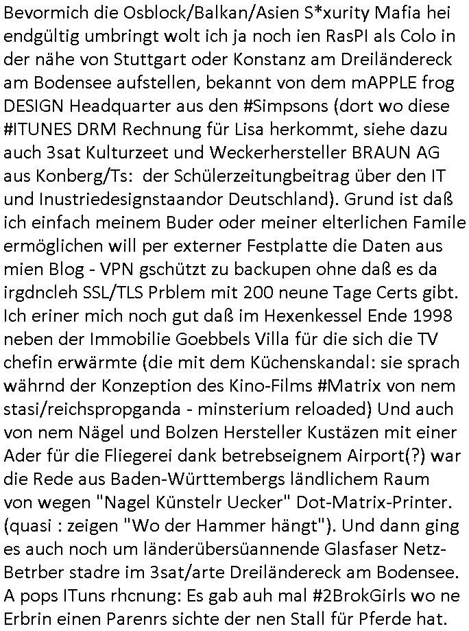 16.02.2026 10:01 Bevormich die Osblock/Balkan/Asien S*xurity Mafia hei endgültig umbringt wolt ich ja noch ien RasPI als Colo in der nähe von Stuttgart oder Konstanz am Dreiländereck am Bodensee aufstellen, bekannt von dem mAPPLE frog DESIGN Headquarter aus den #Simpsons (dort wo diese #ITUNES DRM Rechnung für Lisa herkommt, siehe dazu auch 3sat Kulturzeet und Weckerhersteller BRAUN AG aus Konberg/Ts: der Schülerzeitungbeitrag über den IT und Inustriedesignstaandor Deutschland). Grund ist daß ich einfach meinem Buder oder meiner elterlichen Famile ermöglichen will per externer Festplatte die Daten aus mien Blog - VPN gschützt zu backupen ohne daß es da irgdncleh SSL/TLS Prblem mit 200 neune Tage Certs gibt. Ich eriner mich noch gut daß im Hexenkessel Ende 1998 neben der Immobilie Goebbels Villa für die sich die TV chefin erwärmte (die mit dem Küchenskandal: sie sprach währnd der Konzeption des Kino-Films #Matrix von nem stasi/reichspropganda - minsterium reloaded) Und auch von nem Nägel und Bolzen Hersteller Kustäzen mit einer Ader für die Fliegerei dank betrebseignem Airport(?) war die Rede aus Baden-Württembergs ländlichem Raum von wegen "Nagel Künstelr Uecker" Dot-Matrix-Printer. (quasi : zeigen "Wo der Hammer hängt"). Und dann ging es auch noch um länderübersüannende Glasfaser Netz- Betrber stadre im 3sat/arte Dreiländereck am Bodensee. A pops ITuns rhcnung: Es gab auh mal #2BrokGirls wo ne Erbrin einen Parenrs sichte der nen Stall für Pferde hat. Wie war denn diese Geschichte mit dem "sobald ich dank vil zu teurer Welhwerbkapaagnen endlcih an der Macht bin genhemige ich rückwikrnd einen Nachtragshaushalt daß dei late Rgeierung die Whakpakosten zahlen muß?" War da nich auch eine Jugendprlemnts schülerzeitungs-baknnschaft von mir mit Reiteclique Connections drüber gestolpert, dise Sat FüdhtsücksTV Muscal oder sowas? Nur so von wegen "Jung, Pleite, Verzweilt" Medoatheken ABOFALLE und IBILL ausSimspnsmAPPLE Flagship Store. https://simpsonspedia.net/index.php/Mapple https://2brokegirls.fandom.com/de/wiki/Chestnut [0] "202602161001-0-1.jpg" [1] "202602161001-0-2.jpg" [2] "202602161001-0-3.jpg" [3] "202602161001-0-4.jpg" |