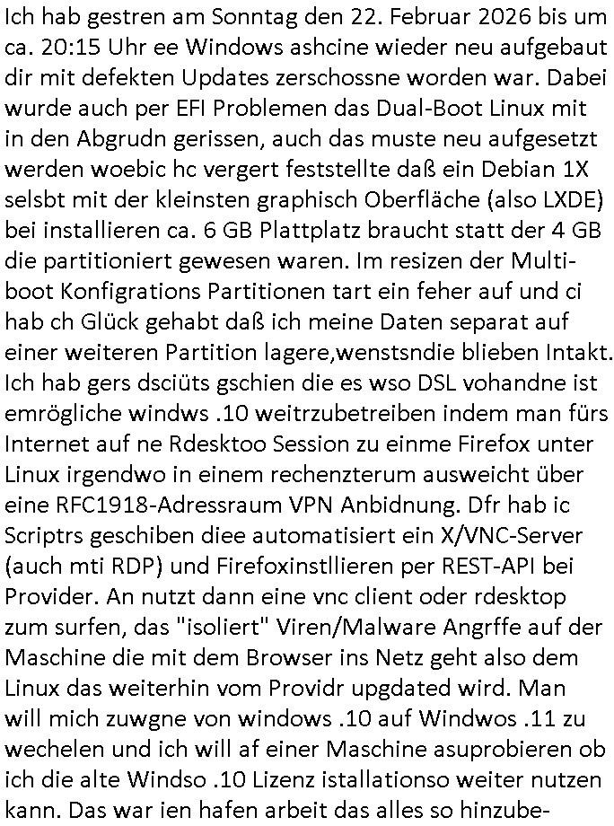 Ich hab gestren am Sonntag den 22. Februar 2026 bis um ca. 20:15 Uhr ee Windows ashcine wieder neu aufgebaut dir mit defekten Updates zerschossne worden war. Dabei wurde auch per EFI Problemen das Dual-Boot Linux mit in den Abgrudn gerissen, auch das muste neu aufgesetzt werden woebic hc vergert feststellte daß ein Debian 1X selsbt mit der kleinsten graphisch Oberfläche (also LXDE) bei installieren ca. 6 GB Plattplatz braucht statt der 4 GB die partitioniert gewesen waren. Im resizen der Multi-boot Konfigrations Partitionen tart ein feher auf und ci hab ch Glück gehabt daß ich meine Daten separat auf einer weiteren Partition lagere,wenstsndie blieben Intakt. Ich hab gers dsciüts gschien die es wso DSL vohandne ist emrögliche windws .10 weitrzubetreiben indem man fürs Internet auf ne Rdesktoo Session zu einme Firefox unter Linux irgendwo in einem rechenzterum ausweicht über eine RFC1918-Adressraum VPN Anbidnung. Dfr hab ic Scriptrs geschiben diee automatisiert ein X/VNC-Server(auch mti RDP) und Firefoxinstllieren per REST-API bei Provider. An nutzt dann eine vnc client oder rdesktop zum surfen, das "isoliert" Viren/Malware Angrffe auf der Maschine die mit dem Browser ins Netz geht also dem Linux das weiterhin vom Providr upgdated wird. Man will mich zuwgne von windows .10 auf Windwos .11 zu wechelen und ich will af einer Maschine asuprobieren ob ich die alte Windso .10 Lizenz istallationso weiter nutzen kann. Das war ien hafen arbeit das alles so hinzube-