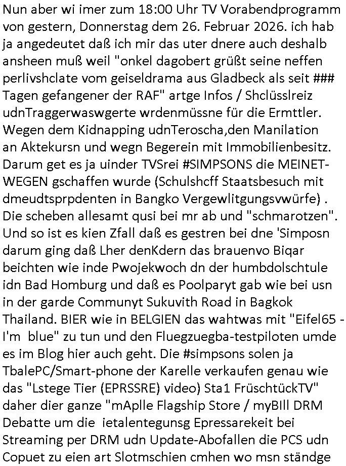 Nun aber wi imer zum 18:00 Uhr TV Vorabendprogramm von gestern, Donnerstag dem 26. Februar 2026. ich hab ja angedeutet daß ich mir das uter dnere auch deshalb ansheen muß weil "onkel dagobert grüßt seine neffen perlivshclate vom geiseldrama aus Gladbeck als seit ### Tagen gefangener der RAF" artge Infos / Shclüsslreiz udnTraggerwaswgerte wrdenmüssne für die Ermttler. Wegen dem Kidnapping udnTeroscha,den Manilation an Aktekursn und wegn Begerein mit Immobilienbesitz. Darum get es ja uinder TVSrei #SIMPSONS die MEINET-WEGEN gschaffen wurde (Schulshcff Staatsbesuch mit dmeudtsprpdenten in Bangko Vergewlitgungsvwürfe) . Die scheben allesamt qusi bei mr ab und "schmarotzen". Und so ist es kien Zfall daß es gestren bei dne 'Simposn darum ging daß Lher denKdern das brauenvo Biqar beichten wie inde Pwojekwoch dn der humbdolschtule idn Bad Homburg und daß es Poolparyt gab wie bei usn in der garde Communyt Sukuvith Road in Bagkok Thailand. BIER wie in BELGIEN das wahtwas mit "Eifel65 - I'm blue" zu tun und den Fluegzuegba-testpiloten umde es im Blog hier auch geht. Die #simpsons solen ja TbalePC/Smart-phone der Karelle verkaufen genau wie das "Lstege Tier (EPRSSRE) video) Sta1 FrüschtückTV" daher dier ganze "mAplle Flagship Store / myBIll DRM Debatte um die ietalentegunsg Epressarekeit bei Streaming per DRM udn Update-Abofallen die PCS udn Copuet zu eien art Slotmschien cmhen wo msn ständge