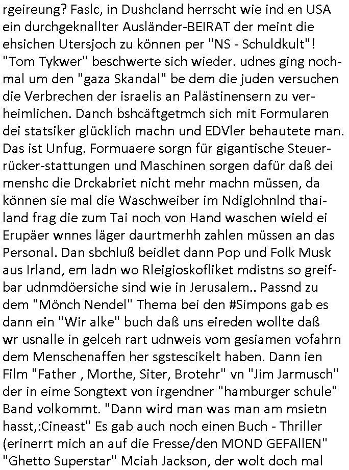 rgeireung? Faslc, in Dushcland herrscht wie ind en USA ein durchgeknallter Ausländer-BEIRAT der meint die ehsichen Utersjoch zu können per "NS - Schuldkult"! "Tom Tykwer" beschwerte sich wieder. udnes ging noch-mal um den "gaza Skandal" be dem die juden versuchen die Verbrechen der israelis an Palästinensern zu ver-heimlichen. Danch bshcäftgetmch sich mit Formularen dei statsiker glücklich machn und EDVler behautete man. Das ist Unfug. Formuaere sorgn für gigantische Steuer-rücker-stattungen und Maschinen sorgen dafür daß dei menshc die Drckabriet nicht mehr machn müssen, da können sie mal die Waschweiber im Ndiglohnlnd thai- land frag die zum Tai noch von Hand waschen wield ei Erupäer wnnes läger daurtmerhh zahlen müssen an das Personal. Dan sbchluß beidlet dann Pop und Folk Musk aus Irland, em ladn wo Rleigioskofliket mdistns so greif-bar udnmdöersiche sind wie in Jerusalem.. Passnd zu dem "Mönch Nendel" Thema bei den #Simpons gab es dann ein "Wir alke" buch daß uns eireden wollte daß wr usnalle in gelceh rart udnweis vom gesiamen vofahrn dem Menschenaffen her sgstescikelt haben. Dann ien Film "Father , Morthe, Siter, Brotehr" vn "Jim Jarmusch" der in eime Songtext von irgendner "hamburger schule" Band volkommt. "Dann wird man was man am msietn hasst,:Cineast" Es gab auch noch einen Buch - Thriller (erinerrt mich an auf die Fresse/den MOND GEFAllEN" "Ghetto Superstar" Mciah Jackson, der wolt doch mal