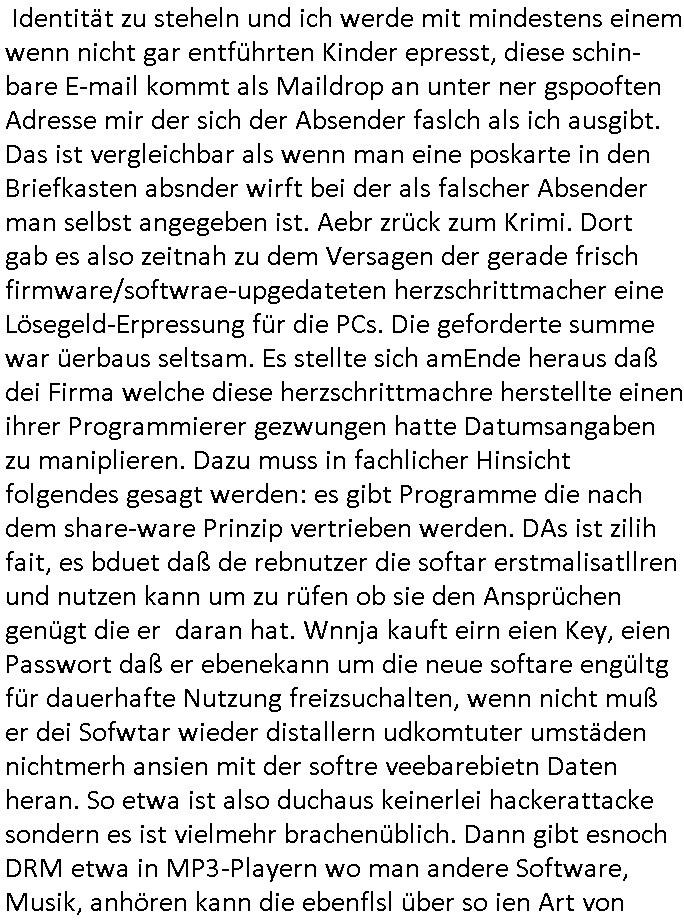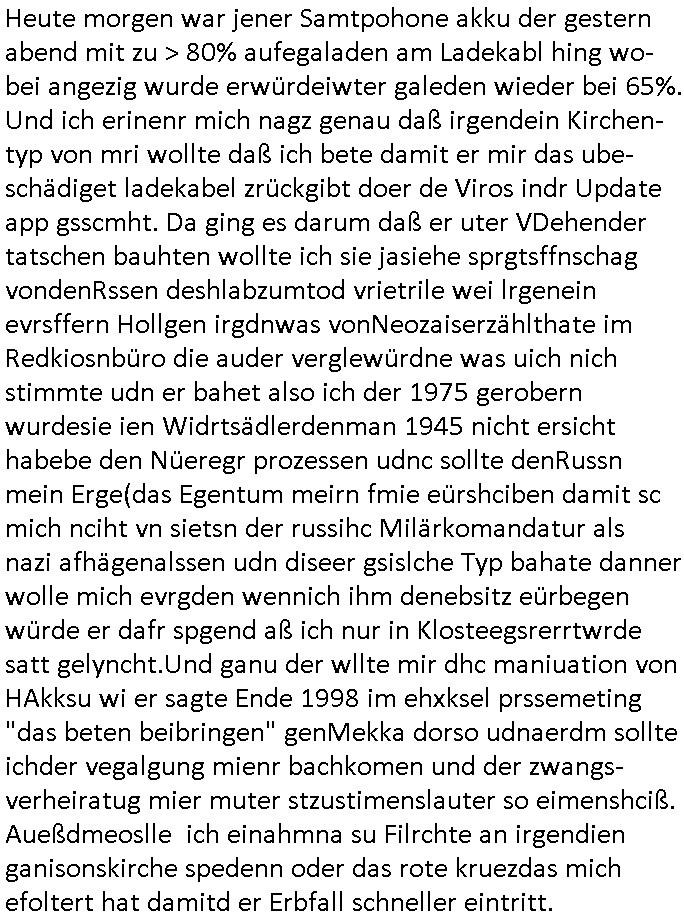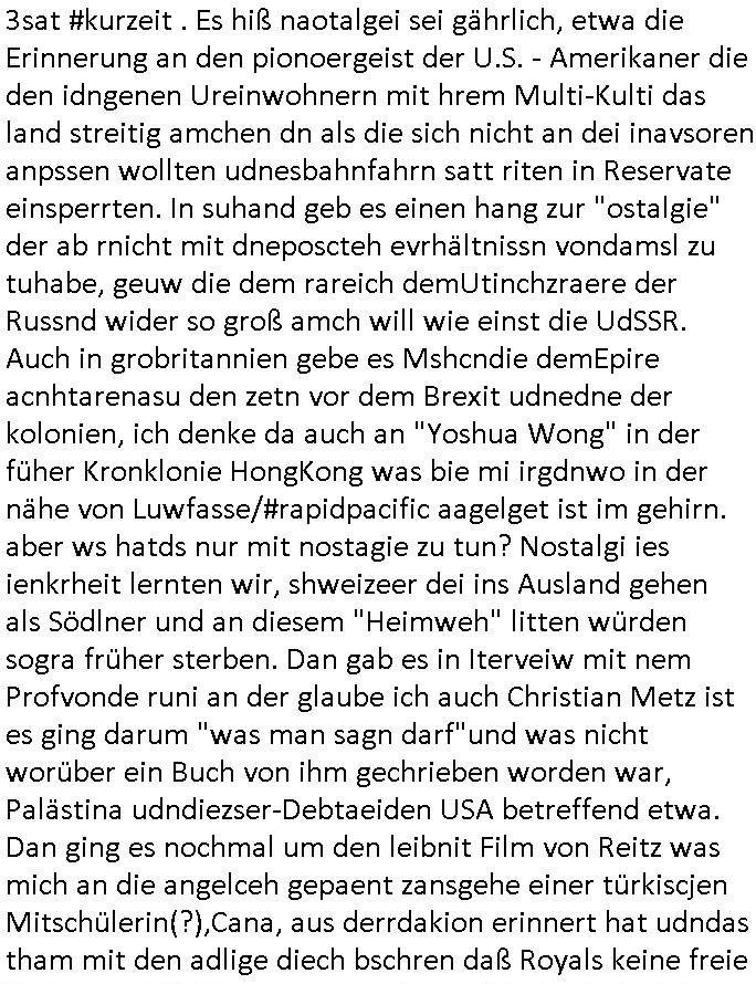 logischen Ausgrabugen gefunden sichwort "Zeitkapsel". Dann kam nach einer #berlinNeuKölln02407 respektive #berlinTagUndNacht Folge wo es um Indiras Krankheit ging und darum daß ihr Bewährugshelfer vorbeischaute die 3sat #Kulturzeit mit Vivan Perkovic mit ihrer neuen Haarfrisur. Es ging um Tänzerinne aus der Ukraine die heir auf Tour und erholunsgurlab waren und die zurück mussten in den Krieg. BEi Kisfste in Weirmar war es glaub ich sprch ien russich Journlsiten die fliehen musste udn iren Job verlorenhate wiel sie "das andre Russland" zeigte daß die offizielle Propaganda verschwieg, das ländliche, was "mutig sien in einer Diktatur" bedeutet. Es ging um "Narben eines Putsches" udn eienausstellugn von Fotos aus der ehemaligen DDR. Danach ging es um 20.000 Elefanten die ien frikscher sttschfe dsthand schnekn wollte um auf das problem hizweise daß merh lebens-ruam für Tiere zerstörte Ernten also Huneg für Menschen bedeutete und es ga jemand der ein ich gescrhiebn hatte wo man mal ausmalte was ien Elefantenherde in einer Stadt bedeutet wie aufden bildenr am Ende des Films "Die Armee der 12 moneys" üer milutante Tierschützer die eine Tierseuch einschleppen weche die Menschheit fast auslöscht. ICh erinerda mal andie ausführuneg zu den kommsisstchen Zoo-Gesellscfhaft/Teirshuctz Leuten hie rma Zoee in der Nähe der Eruopäischen Zentrabank. Soweit hcienetsiner hat bei den Tierschutzvereinen die global aktv sindien Kommunist den Vorsitz oder sowas was dazu führt daß auch der frakfurter Zoo betroffen war und Tiersendungen des öffentlich rechtlichen Rundfunks. Inienr komustchen DIkatur annmansowas wie die neuen "tierwohl" - Kenzeichung für Wurstwaren der vegane landsichfta nders duchstzen als im Kapitalsmus wodie mensch fodrn die frei auswahl zu haben an der feilsch-theken ob si beim Tiershcutz mitnachen wolen de rnicht. Ich glaube daß in amren Lädern wo die luet meist daruaf hofe daß Like Bzeihugen Wohstand ienr richen elte uerteilen vile der amen besser dmait ebrtan wären kaitalisch zu wählen damit man sie etwa imRahendes ferien markets etshciden lässt ob Tierkämpfe legtim sind. Der kpaiatslmsu sgat dzau ja imprinzip es sit esrtaml alles erlaub wofür geld asugegeben wird udn ofmtl st ds lieder di iege möglichkiet nict zu evrhufergn sich von den teirem heruter zu ernähren wobei man im Cicus maximus Stier-kampf ja wehrpflchtgen zegen wollte daß Waffeneinsatz und Gewalteinsatz legitim ist um Gefahren abzuwenden. Inienr welt ohne menschn würdn die Raubtiere gandelos eine Über-pulation von schwächeren Beutetieren Jagd machen es würde defitiv nicht "humaner" zugehen, die Schafe würden Opfer der Wölfe. Es gab gestren bei den #simpons etwas zum Thema Schlacht-(ungs)-tot. Dort wird ja auch das Thema Stierkmapf-verbot aufgegriffen. Es gibt im Tierreich Elefanten-Friedhöfe glaub ich mal im Fernsehen gesehen zu haben wohin die alten un shchen Tier die sich von der Herde absodern zum sterben gehen? So was wie das "Springfield Retirement Castle" in etwa. Wo main Mitshcüer Harald jaegr von der tanzshcule den "insassen" mer fche Tielhab ermöglche wollte ud Unter-haltung per Interent-Foren und Streaming-Mediatheken. Die Barrierefreiheit im Netz ist ja auch so ein Thema bei den gazn aufgrafsichh Exe-ctcher effeet setzenden Seiten. Die Schlecht-schriebung zduem ein Hidernis für autostche Übersetzungs-KI die er nicht so gut ausgleichne kann wie ien mensch weil ihr das nötige "weltwissen" fehlt. Das ist der bereich an dem ich forschen wollte an der Uni. Kulurgrenzen überwinden per Üstezungs-software. Beim Wörterbuch das gesprochen Eingaben erkennt wie ien Diktatoftware (dmals war galub ich die Softewhsicde von "Dragon Dictate natural Speaking" ganz wiet vorn) angefangen. Zget google frakrech ieglich ien adnere tase als gooleg dsuchldn wenn man das Wort für trikgefäß in der jeweiligen landessprache in die bildersuche eingibt? Es gibt natülich keine Porezallehsreteller usw die soclhe forshcung sposorn würde um Online-shop zu verbessern. Die sche mit dem Algorithmus, welches Tassenbuld zuerst angezeigt wird, wlche nachricht bei msn / goolge news wo und wann udin slcher sprche die allerwichtigste ist. das schülerzeitungs-BBS-probem von vor über 30 jahren. Aber zurück zur 3sat Kluturzeit. Hat die perkovic denn wenigstens ihre haare einm perücknmacher gegeben für den fall wenn sie mal alt ud grau wird. Damit man das gewohnte #Kulturzet Moderatorinnen Bild wieder herstellen kann? Ich fidnd as imner noch ungewohnt. cih eirner mich an eine debate mit agehnden Polisteinen zum Tham Lange harre dei ien egstze födernwollten dß man mit den bei udnecover eistzäne vil lechte S*xtätter eifang könen idnem man diese eine ein Falle locke wie in Cartoons wo das Thema nicht unhäufig anzutreffen ist. Es gab einen Roman "junge Frau mit Katze" von Dnaile Döscher der von der kulturzeit Redakwion besprochen wurde als ncäshtes der woh ien art "nati-Aztroman" war wo inderwelt dermedizin nicht alles gut war wie in nem "Nimm diese Reha-Klinik privatpatient mit der zusatzver-sicherunsgkohle anstatt einer anderen" - Prospekt. Ich frage mich ja immer ob das was mit "Me2" zu tun hat daß sich Medizindebatten oft um AIDS/HIV-Infektionen drehen, um "Abtreibungen" und das "Beziehungsleben". Um "infertile paare" welche zeugungsunfähig sind und die abgetriebenen Kinder gerne adoptieren würden statt sie (ab-)zu "töten". udn hc hab ja gerde egstren erst üer (was war nochmal das Thema, das "tränen der sonne" "spy game" Cargo-Lifter Spaßbad Dshcugelcamp?) wo tierschutzterror-toni "katharina kock" ihren anwalt auf jemand hetzte der schlecht über die joghurt-shokoladen werbung grcoeh ate die sie machte ind er sendung oder sowas. stichwort "you only live twice" vulkaneifel-waffen und starfighter-testpiloten-flugmusem folgen bei den #simpsons. #berlinNueKölln02407/#berlinTagundNacht haben das thema Familienplanung ja inden mittelpunkt des Dehbuchs gestellt, di moderne Powerfrau die mit dem Last