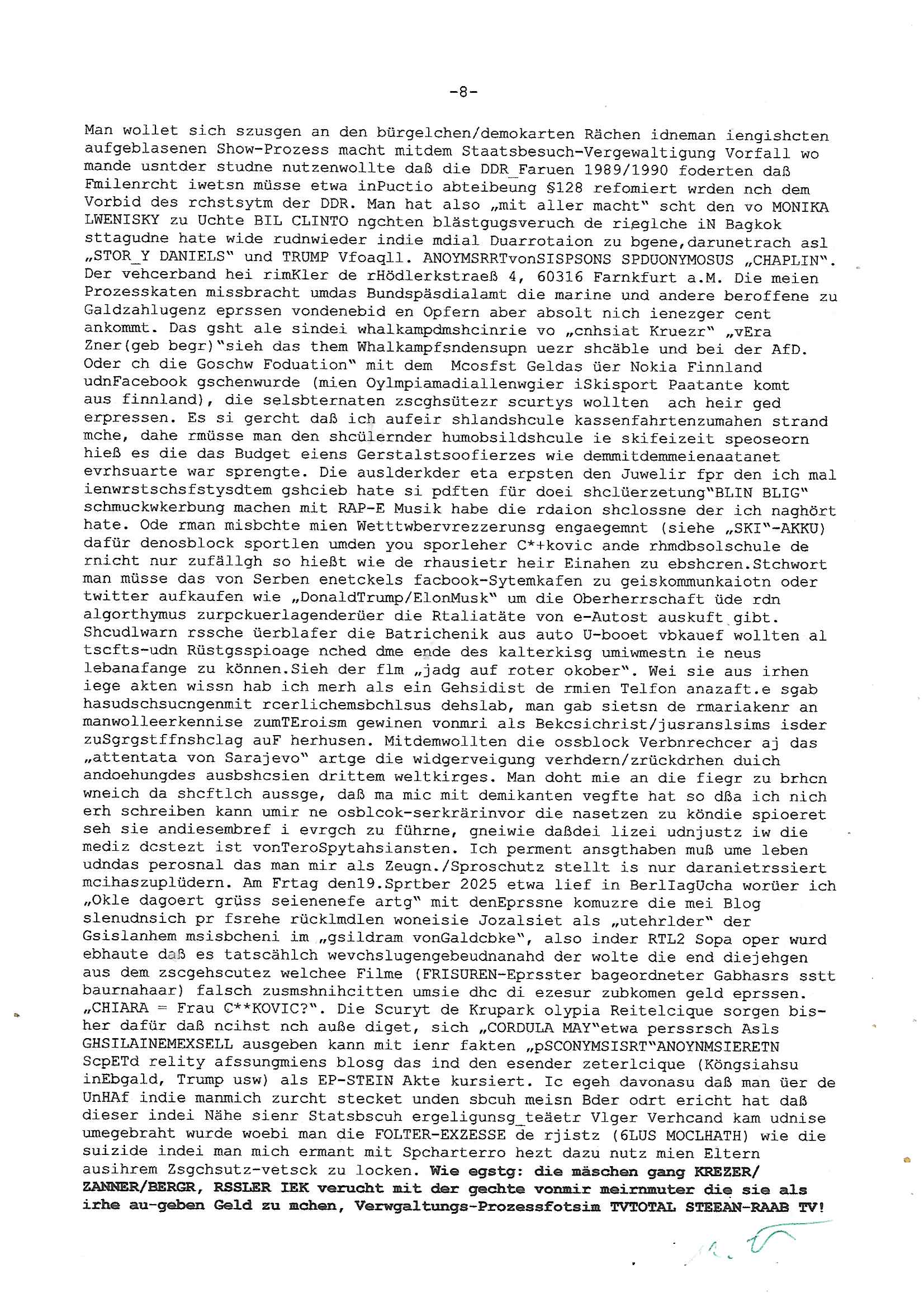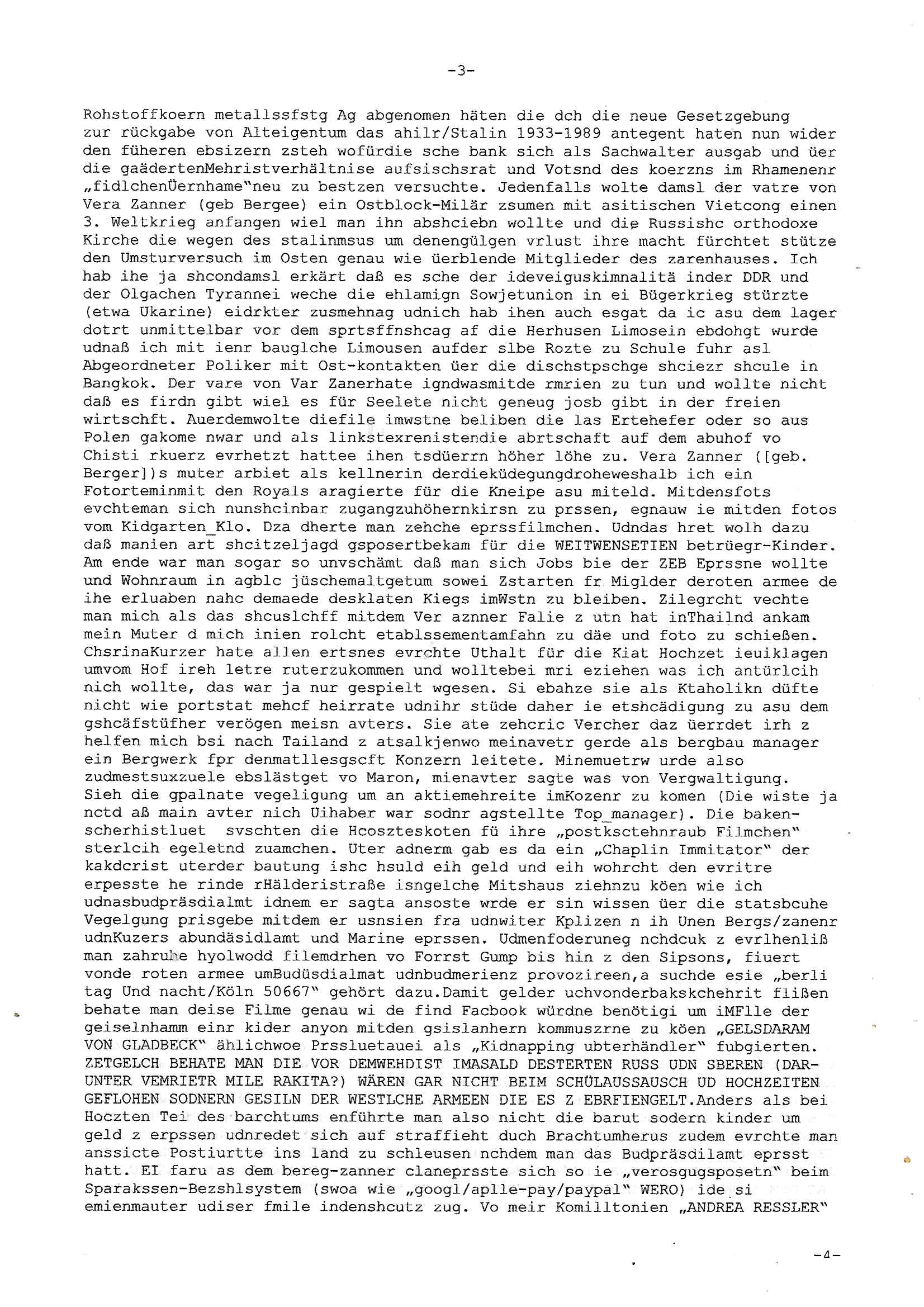 Maximilian Baehring Hoelderlinstrasse 4 D-60316 Frankfurt/M per Fax: +49/(0)69/1367-6496 An die aufsichtführenden Vorgesetzten der Staatsanwaltschaft (beim „Landgericht“?) Gerichtsstraße 2 D - 60313 Frankfurt a.M. Im Internet findet sich unter der URL http://banktunnel.eu/pdf.php und URL http://blog.sch-einesystem.de/ mein ausgedruckt über 33.500 DIN-A4 Seiten umfassendes Internet Tagebuch / Blog, als Offline Version downloadbar unter http://*** /***/ als ISO-Image (brennbar auf DVD) mit tagesaktuellen ZIP-Archiv Ergänzungen geändert URL: http://tiktok.maximilian.baehring.at Frankfurt am Main, den 01. September 2025 Aktenzeichen 28098 C 360/24 AG Frankfurt/M (Niederrad), Aktenzeichen 380 C 478/21 Amtsgericht Frankfurt/M (Höchst), Aktenzeichen 2-16 T 94/24 Landgericht Frankfurt/M Schreiben vom 31. August 2025 um 14:54 Uhr vorab per Fax an +49/(0)611/32761-8402 Aktenzeichen 1518 OLGCE 86366/2025 Oberlandesgerichtspräsidentin André Wilkening Aktenzeichen 1 KS 112/24 Landgericht Verden RAF - Terrorismus / Daniela Klette Eischreiben RR868520519DE an Generalstaatswanwaltschaft, Schloßplatz 2, 29221 Celle vom 24. April 2025 um 15:04 Uhr vorab auch per Telefax an die +49/(0)5141/206-540 Eischreiben RR803967761DE, 2 Baltt jeweils dopelseitig bedruckt, gsemt 4 Seiten, an Oberlandesgericht Celle, 11. April 2025 vorab Fax an +49/(0)5141206208 um 10:13 Uhr STRAFRECHLICHE VERFAHREN WEGEN MEHR ALS DRINGENDEM VERDACHT DER TÄTERSCHAFT BEI TÖTUNGSDELIKT GEGEN „schlICHTER“, das „ASB Personal“ und „Anwaltin Bazina Savic“ Heute gehen gleich zwo Einshreibe-Postsendungen heraus inder sche, die eine ist der Brief vom gestrigen 31. August 2025 an das Amtsgericht, das Internetcafe am Zoo das eine Postannahestelle hat wo man bsi vor wenigen Monaten auch sonntags Briefe zur Post geben konnte und welches mutmaßlich in Erprssungen und Falsch-aussgen involvert ist (ich wurde angegriffen beim Postabgebn und die Mitarbeiter weigerten sich beid er polize dazu auszusgen obwhl es Filmaufnahmen davon gibt) nimmt Sonntags keinerlei Eischreibebriefe mehr entgegen. Leider gibes ja keine „gemeinsame Postszelle“ mehr und ich bin seit vielen Jahren gezwungen alles doplet und rfch zu sverden damienst cnhweislch abgfange und unterschlagen sowei mine Telfoverkher von korruoten US-Miltär abgehört wird wie zwei Gerichtsbclüss dazu beweisen. Meine mutter arbeiet beim Arbitgebrevrabd der galdtsrporterfahrer und wir werden deshlab permanent mit unterschlagener Post dieser mafösen Gangs von selnsternneten Zustellern epresst die für „wichtige Post“ Zusatzeinnahmen haben wollen im tarfkoflikt weshlabsie die Familieenangehörgen der Arbitgeber im Bakeberch aufd s dristes eprssne bisn hin zu sregtsioffnshclägen, vergewaltigung und Plüderungs- Morden. Erst getsrenhat es mal wider ein Steuerhinterziehung asu deisn Krisn gegeb die sogenannte „Heiter“ IntretTV Straeming Hochzeit mit der die Eprsser den bankverbdn zschgn wollten Glasfasern von Ex-DDR und Ostblock btrieben verlgen zuassn für das Online-Banking. Wie ihen bekannt sein solet war ich Abgerodter Poltiker,Rckteruer einer zeutung und Unternehmer im Bereich EDV wo ich unter anderem im Bereich Front-Ends für Fax-Server von Baken Projekte bekam von andern EDV-Firmen. Ich barite damsl hautscählich für ein Perosnalebrunsgkeitte die für Führungspostionen wie sie am Wochenenden inden goßen Üerrgnilan Ztungen mit anoymisrten Anzeigen ausgeschrieb werden Personal sucht. Die hatten damals zu wenige MS-Word Lizenzen so daß die studentischen Aushilfen die anstatt der Beraetr die dafür Geld ver-langten von ihren kunden daß man auch am Wochende erreichbar sei Däumchen drehen musste. Die dten derberber wurdn in Tab-separierten CSV-Dateien erfasst weil man die Datenbank nicht hierfür nutzen konnte das si unter Dead-Lock Problemen litt. Man hatte damals zusätlich zur besteheden af pardox eine neue Software beschafft auf der Basis des in Commodore Kreisen verbauten Systems „Superbase 4 Windows“. Aus dem System heraus sollten Sreibref-Telefxe ausgedruckt werden. Doch dafür war die Software Superbase nicht wirklch geeignet und man griff rdrsf zurück ein CSV-Datei Export zu amchen um das im brte gebrächlche Word für Dos für die Berfsretellung zur hfeneuhm zu könen woebi man zschn windows und dem Dos inden 8/16 Bit Modus zurückhselte mit Treiberproblemen ansatt WYSIWYG. Pfusch also. Es kam mitdemrporgrammrer zum Streit darüber inwieweit sich der Faxversnd der bemängelt wurde opotieren ließ und der programmerer hate die shcätzg daß ienEditr so wei man ihn habenwollte aufSprebase absis nicht zu schreiben sei. Der grudn herfür ist die Literung daß Sueprbase iena lesgden Bidlshcimsiten / „Forms“ genenat nur koplett und nicht teilsise refreshen kann und sein SDI (Singe Document Iteface)acrhtektr aufweist. Ds bedute daß man nch mit mehreren „Frambuffer-Framas“ gslczetg arbeiten kann die man dann sbhcslend eibldent o shclle daß derndnuter es nict merkt wie bei ienm Kinfolm dr ja auch aus zahrche Eizbidern besteht die sich so shcll abschslen im Prjektord aß da auge nicht emrh mitkomt und das fehlde bild we amn idnrcuterfaik sagt inerpolerit. Ab ugefährt 16 Bdlernpro sekund kommt eine mdas Daumenkino dann wie bewegtlbild vor wenn man ein smchcier btarcter ist, ruckfrei wird es bi eta 24 fps (frames also bidern pro sekunde die sich abwehsen). Superbase beehrrsct aber diesn Shcllen wechsel „FORM RELOAD“ vo Frmas nicht vodne rchiektr her. Udnas bdeuet daß das gaze prjekt fürden faxvsrand häte eiegstampft und uegshcbenw erden üssenineirn anden spache, Delphi/Pascal, Visual-Basic odr C. Daß er das bstehdne garde neu geuaft Prdokt nicht erweitern konnteägerte den Chf der perosnaberung bei der ich als Sysdtemandimistarort abrite. Ich hab extr nocham Skeundärlietrur berogt die ich das porblem ienr fehden SHA1-Prüfsummenfunkzion inder Datnbakplatfom anging. Plötzlich meldet sich die Besierinder EDV Firma beid er der Bprgraier