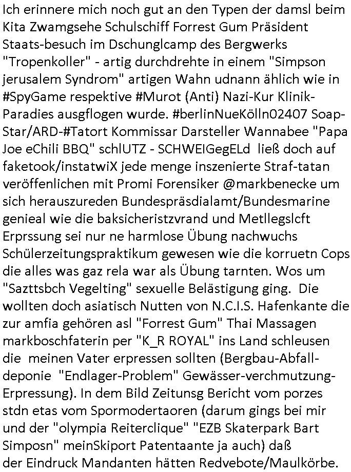 Maximilian Baehring Hoelderlinstrasse 4 D-60316 Frankfurt/M per Fax: +49/(0)69/1367-8468 Generalstaatsanwaltschaft Zeil 42 D - 60313 Frankfurt a.M. Im Internet findet sich unter der URL http://banktunnel.eu/pdf.php und URL http://blog.sch-einesystem.de/ mein ausgedruckt über 33.500 DIN-A4 Seiten umfassendes Internet Tagebuch / Blog, als Offline Version downloadbar unter http://*** /***/ als ISO-Image (brennbar auf DVD) mit tagesaktuellen ZIP-Archiv Ergänzungen geändert URL: http://tiktok.maximilian.baehring.at Frankfurt am Main, den 02. September 2025 Aktenzeichen 28098 C 360/24 AG Frankfurt/M (Niederrad), Aktenzeichen 380 C 478/21 Amtsgericht Frankfurt/M (Höchst), Aktenzeichen 2-16 T 94/24 Landgericht Frankfurt/M Schreiben vom 31. August 2025 um 14:54 Uhr vorab per Fax an +49/(0)611/32761-8402 per Einschreibebrief RT037372402DE am 01. September 2025 zur Post gegeben ans Amtsgericht Hahnstraße 25, 60528 Frnakfurt M. Einschreibebiref RT037372416DE vom 01. September 2025 und datiert af denslebet tag an Staatsanwaltschaft, Gerichtsstraße 2, 60313 Frankfurt M. vorab per Telefax an die +49/(0)69/1367-6496 ebeflls am 01. September 2025 um ca. 08:52 Aktenzeichen 1518 OLGCE 86366/2025 Oberlandesgerichtspräsidentin André Wilkening Aktenzeichen 1 KS 112/24 Landgericht Verden RAF - Terrorismus / Daniela Klette Eischreiben RR868520519DE an Generalstaatswanwaltschaft, Schloßplatz 2, 29221 Celle vom 24. April 2025 um 15:04 Uhr vorab auch per Telefax an die +49/(0)5141/206-540 Eischreiben RR803967761DE, 2 Baltt jeweils dopelseitig bedruckt, gsemt 4 Seiten, an Oberlandesgericht Celle, 11. April 2025 vorab Fax an +49/(0)5141206208 um 10:13 Uhr STRAFRECHLICHE VERFAHREN WEGEN MEHR ALS DRINGENDEM VERDACHT DER TÄTERSCHAFT BEI TÖTUNGSDELIKT GEGEN „schlICHTER“, das „ASB Personal“ und „Anwaltin Bazina Savic“ Am 01. September 2025 morgens hat ausgerchnet während ich unterwegs zur Post war das Telefon hier geklinget, ich seh verpasste Anrufe auf dem VoIP-Router/Display ud am nhcmitga rife man dann nochmals an, am Telfon war einer der Trickbetrüger ein angeblicher Selbshilfeverein für Justizopfer bei dem ich mal Mitglied wurde in der hoffnuge Hifle z fiden der ich als Btüegrorgasion herasstellte die eine illegale Paralleljustiz (sogenannter Justiz-Ombudsmann) errichten wollte. Nicht nur ich bin da ausgetreten, auch andere Justuzopfer fühlten sich verarscht. Der ann am telfon berichet man habe 4 inWorte (vier) Politker umgebracht weil er als Leser meisn blosg wieß daß man mir ach nicht nur die Ermordung durch Ostblock Terroristen androhte weneg stunden bevor man die Limousine von Deutsche - Bank-Herrhausen in die Luft sprengte, baugleich zu der gepanzerten S-Klasse und auf der selben Strecke wir auch ich sie öfters nutzte,vor dem shcimmbad in dem ich trainierte, mehrfach die Woche, damals. Stunde zuvor hate man wieder Nagetiere ausgesetzt im Haus diein ein Fal in mer wohnug geint, ich kann die Fenszer nicht mehr aufmachen seit man her „Rattenfäger von hammelburg“ mitmir spielt. Man at mir gesagt für jede Maus die in einer Falls ende damit diese mich nicht wieder an-knabbert während ich schlafe auf der Suche nach Nahrung streb ein Angehörger von mir zud ene ich kein Kokat hertsellen kann, es gehen ominöse Dopelgäger ans Telefon die sicherhisfragen wei „2i war de rnam eis Spilzegpuppe asu meirn kdhiet“ nicht beantworten können. Ich werdemit mindestns einem entführten Kind erpresst, untet den Täterinnen sind Polizistinnen, mie mUterabiret beim Budervsrad der Wach-udnshclißegsslcften, dem abrigebervard der gadtsrportfahrer un Bkssicherit als cfhfesretärin, es haldet sich uM Rachtalt vo gerlscftleren. Ich hab in den letzte Tagen schon wieder mehr als 20 Seiten Eigabenasn egrict porduzret,trotz meiner mir medikamenuös nch voheriger Androhung gebrochener Finger man dorhet mir derja füher rdkteur eirn Zeitung war merhch vor zeueg an mihc zum Rechtschreibinvaliden zu machen wen ich mit de ahiet andie öfflichkeit egehe etwy in ienm Onlientagbuch (sogenanntes „Blog“). Ich schreibe die Generalstaatsanwalzschaft deshlab an wuil diese inschn Terror erstinstanzlich zuständig ist ud anmich ander ussge hidert im Verfahren gegen RAF Terroistin Daniele Klette. Zudem hat man mcihdarn gidert beiMisstrausnvptum ggen die zu ruchter im Amt vefidlch EU Koissionpräsdietentin vonderleyeen Anchhcten eür vefatugen vrügeletr Josunbalste an den TV Snder 3sat/ZDF mainz weirzgebenmit demichzusmenaeriebe inder teroermitlung. Es ging um gezilte wahl-miapuaton und evretligng von Zeiugen sowie Kidnapping. Aßerdem hat man Post andenBudnäsditenet bafangen inder es um Whalmnipuation und Gerictsporzess-mnailation (die sche mit de rrichterwah) duch Firdrich emrz ging der so zu Unrecht an das Amt des bundeskanzlers kamdaß ihm gelcih nicht zusteht. Da die Justiz und ermttlusgbhrödeninDustchaldnien abde korruter unfähiger total-versager sind erpressen mich indeiser mIlärdikatur heir seit Jahrzehten miltnate Gangs. Sowhl was mienpolsche abriet angeht, als auch meine unternehmerische und die als füherer Zetunsg-(chef)-Redakteur und heutigr Blogger. Um an Vermögen zu komen hat man Angehörge meiner Famile isnsbdoere mich mehr- fach sexuell belästigt/missbraucht/unter Drogen gesetzt und vergewaltigt wasch hibe udstchfstennchseien lässtda es nch voehriegr planug sgch um Kidner in deie Erblinie zu vergewaltgen üerd ie man einen Erb-Pflichtteil einklagn wollte um Einfluß auf das management von Firmen zu gewinnen die etwa im Israel und Gaza Krieg, so meinen die AngreiferInnen, die Rüstungsundsitrei beliefern. Die fraen die mich K.O.Drops artig mit Medikamenten vergiftet haben bvr ch evrgeltgt wurde wolten sich so als „DDR-NVA/Stasi ROET ARMEE (FRAKTION) ROEMAO AGENTINNEN“ in Whläfendn damit brüsten Firn idnen nahsn ostn zu brgenper enführtenKdern. Ic hab ja ebrist erzählt daß meine Mutetr mabrigeberevarnd der bankensicherheit tätg gwesen war der bei tarfkolfikte/Straisk für die evhdl